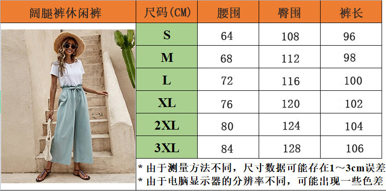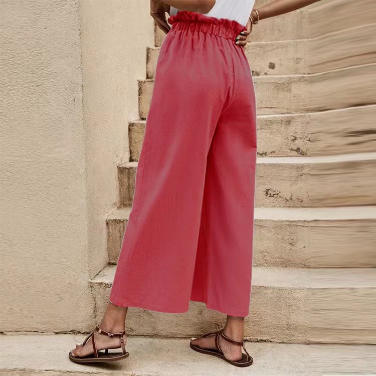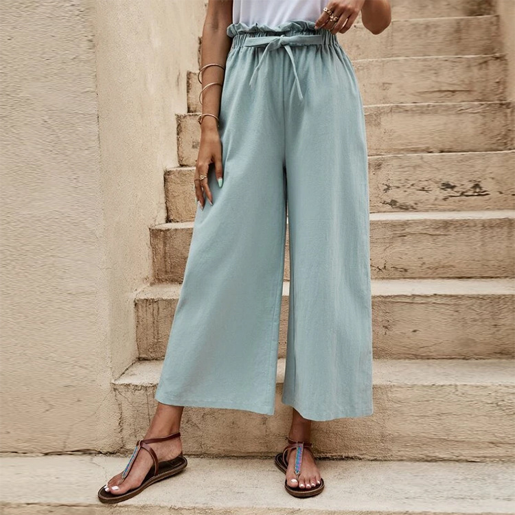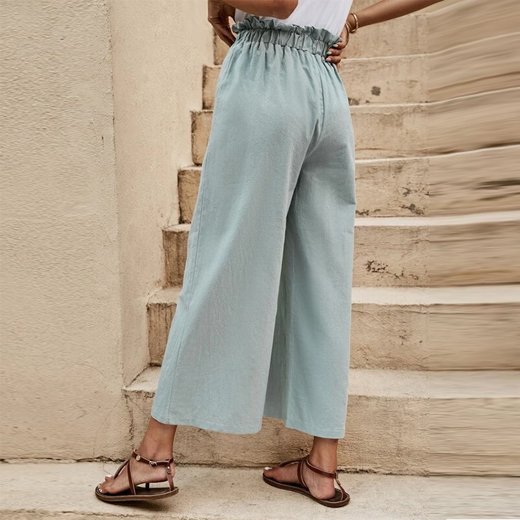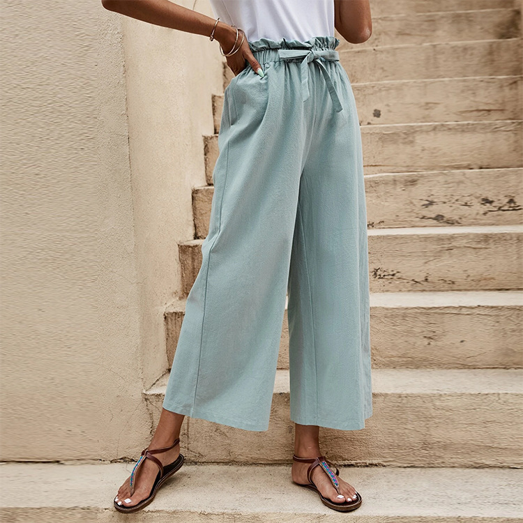 2024 최신 국경 여성 의류 여름 유럽과 미국의 신축성있는 허리 단색면 및 린넨 벨트 넓은 다리 바지 느슨한 자른 바지 여성용스토어 가기