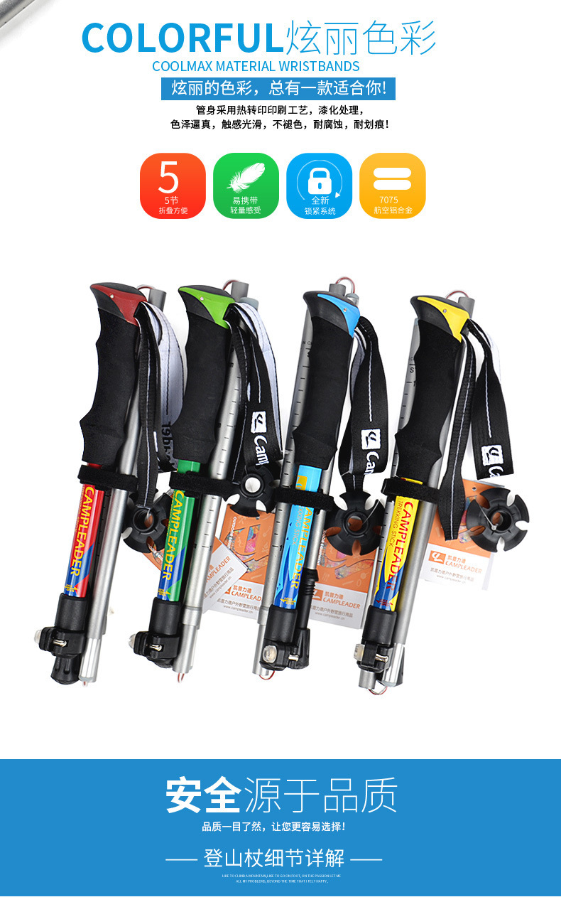 야외 트레킹 폴 외부 잠금 장치 5 섹션 트레킹 극 초경량 7075 알루미늄 합금 텔레스코픽 접이식 목발 등반 기둥