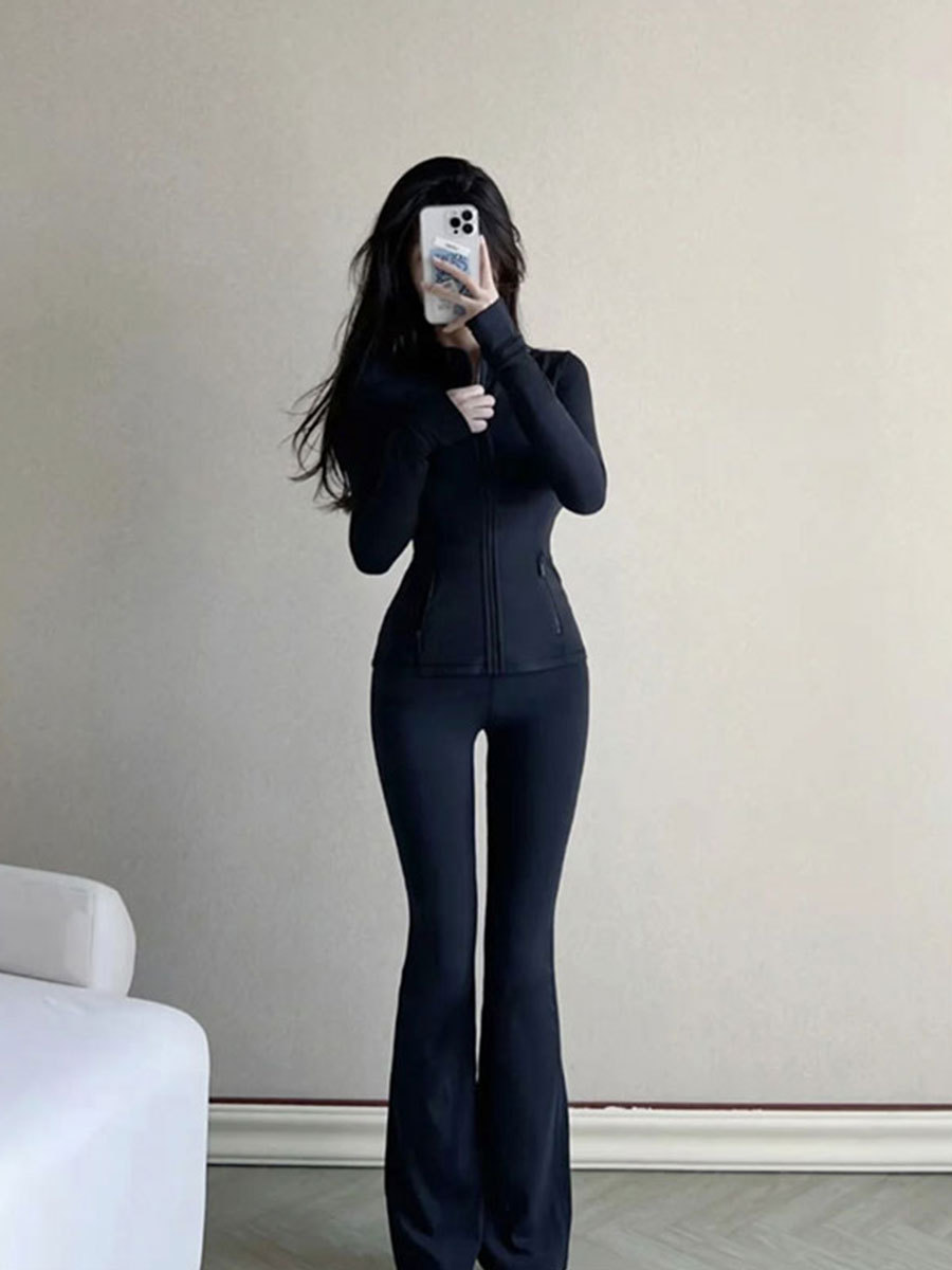요가 옷 섹시한 순수 스타일 슬림 핏 슬리밍 허리 타이트 짧은 태양 보호 의류 여성 지퍼 블랙 긴팔 카디건 코트스토어 가기