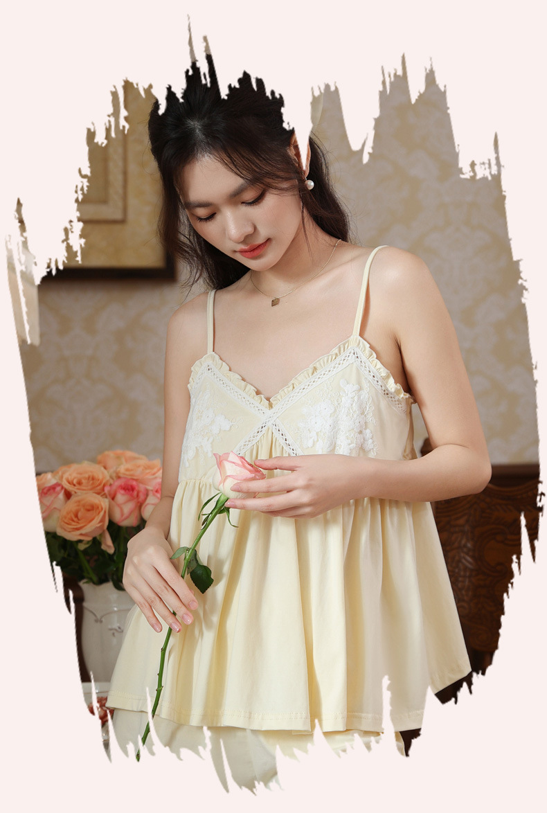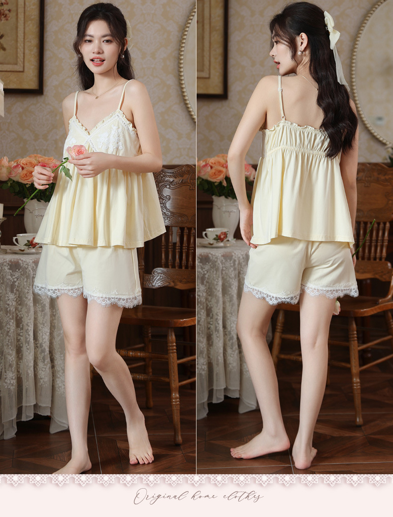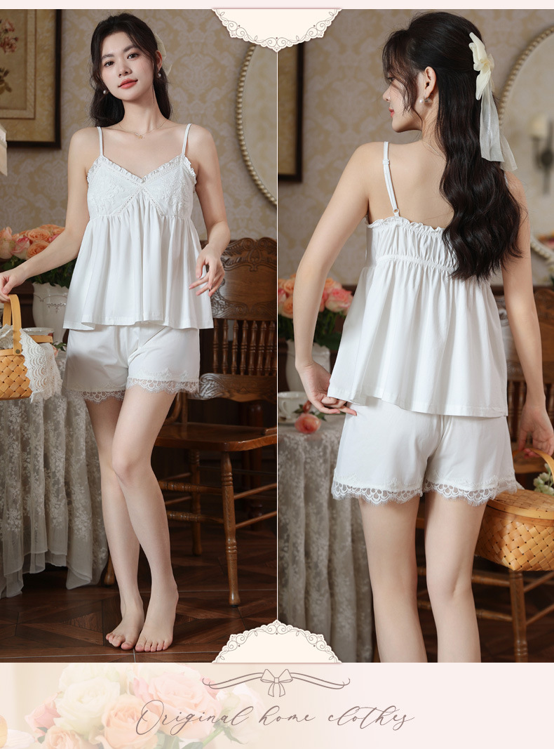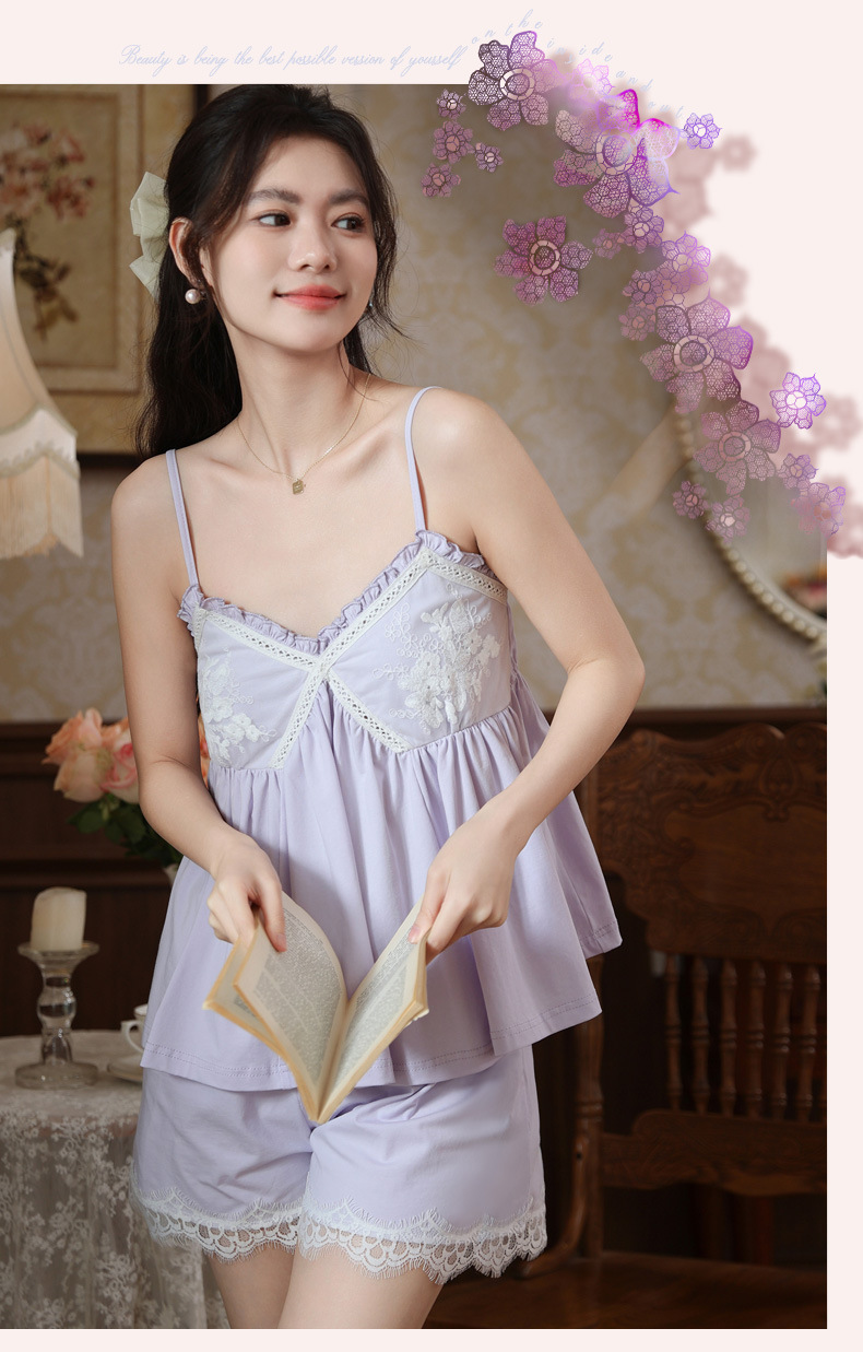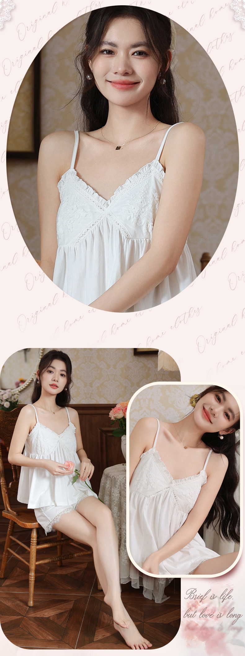 서스펜더 파자마 여성 여름 코튼 파자마 바지 투피스 세트 궁전 스타일 자수 프랑스 스타일 가슴 패드는 가정복 밖에서 착용 할 수 세트