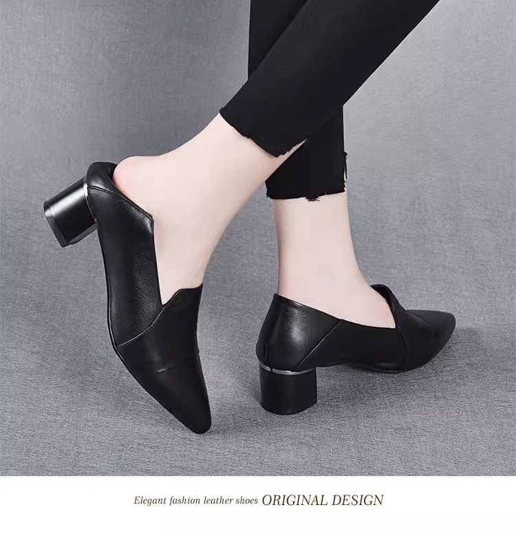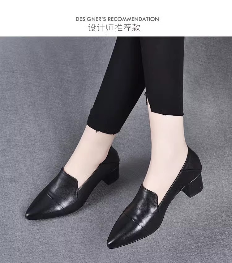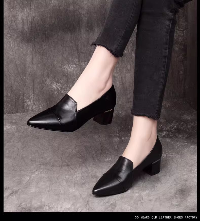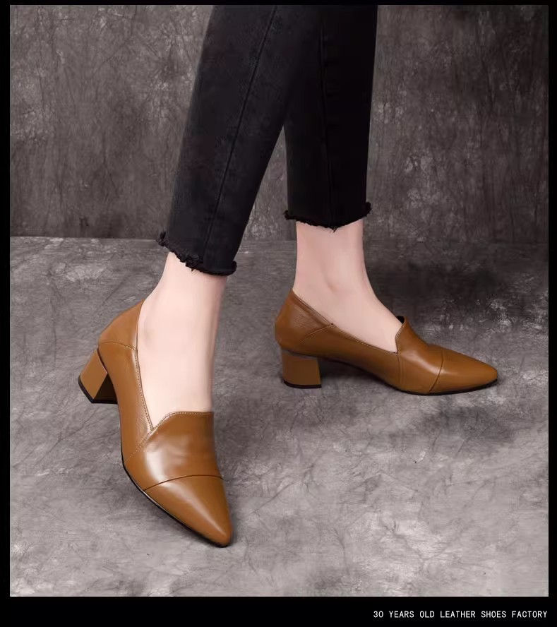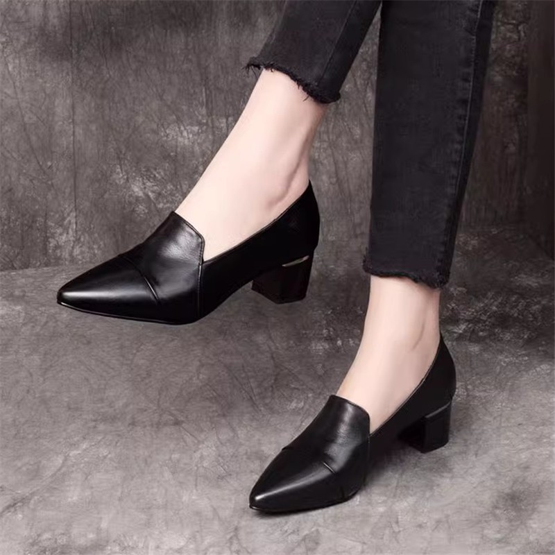 여성을위한 편안한 부드러운 가죽 미드 힐 싱글 레이어 신발 새로운 청키 힐 뾰족한 슬립 온 여성 신발 봄과 가을 2024 여성의 작은 가죽 신발스토어 가기