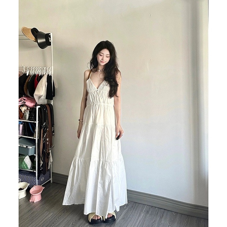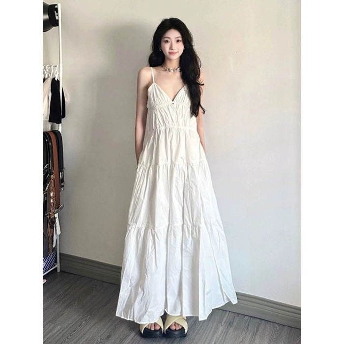 해변 휴일 프랑스 원피스 여성을위한 새로운 여름 고급 민소매 V 넥 화이트 슬링 원피스 2024스토어 가기