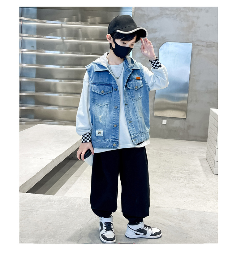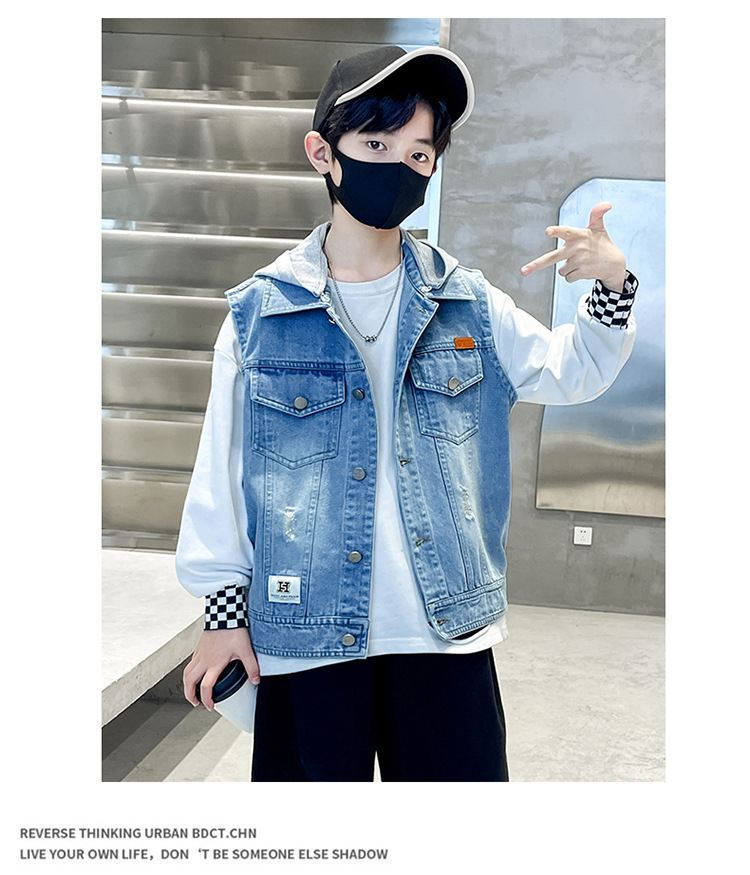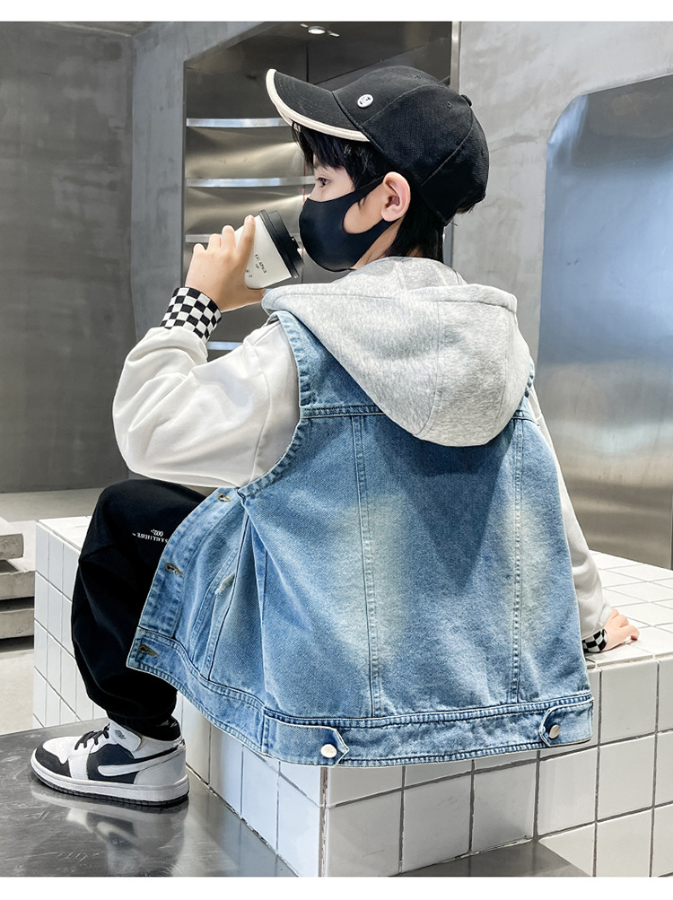 남아 가을 데님 조끼 재킷, 중대형 아동용 2026 탈부착 후드 패션 데님 조끼 상의