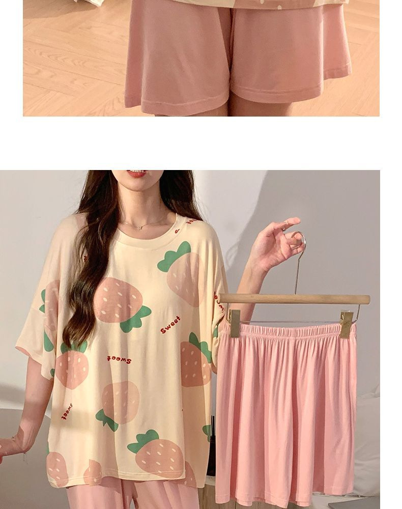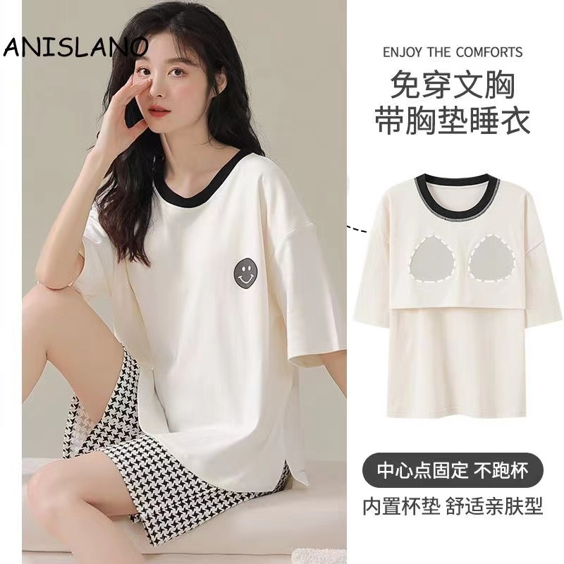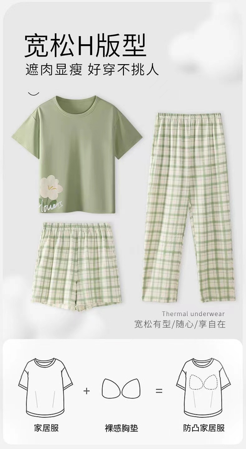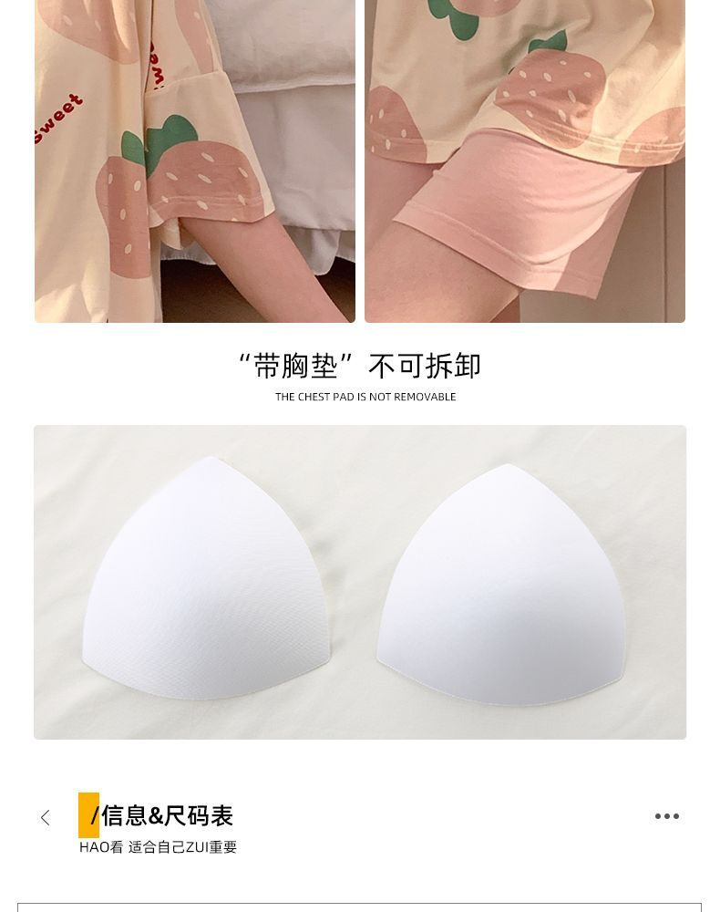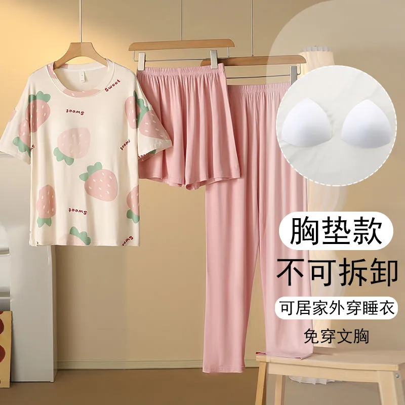 가슴 패드가 달린 3 피스 잠옷 여성 캐주얼 반팔 바지 달콤한 느슨한 플러스 사이즈 간단한 홈웨어 반바지스토어 가기