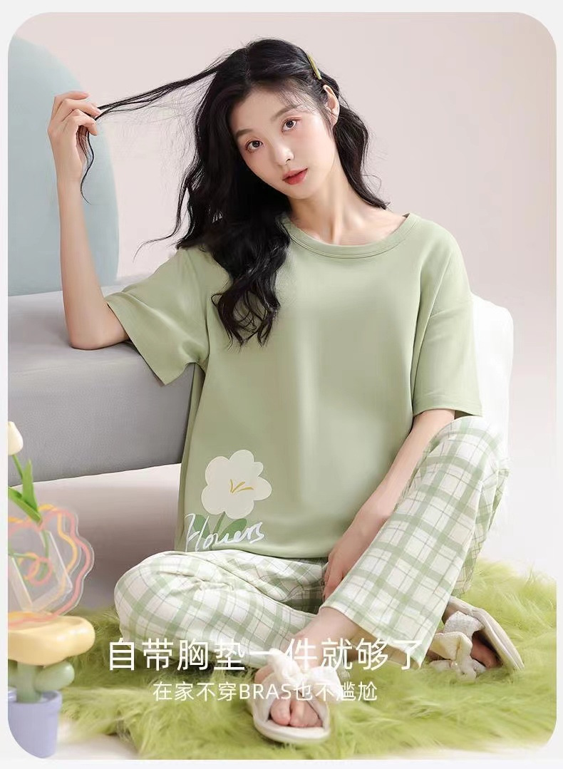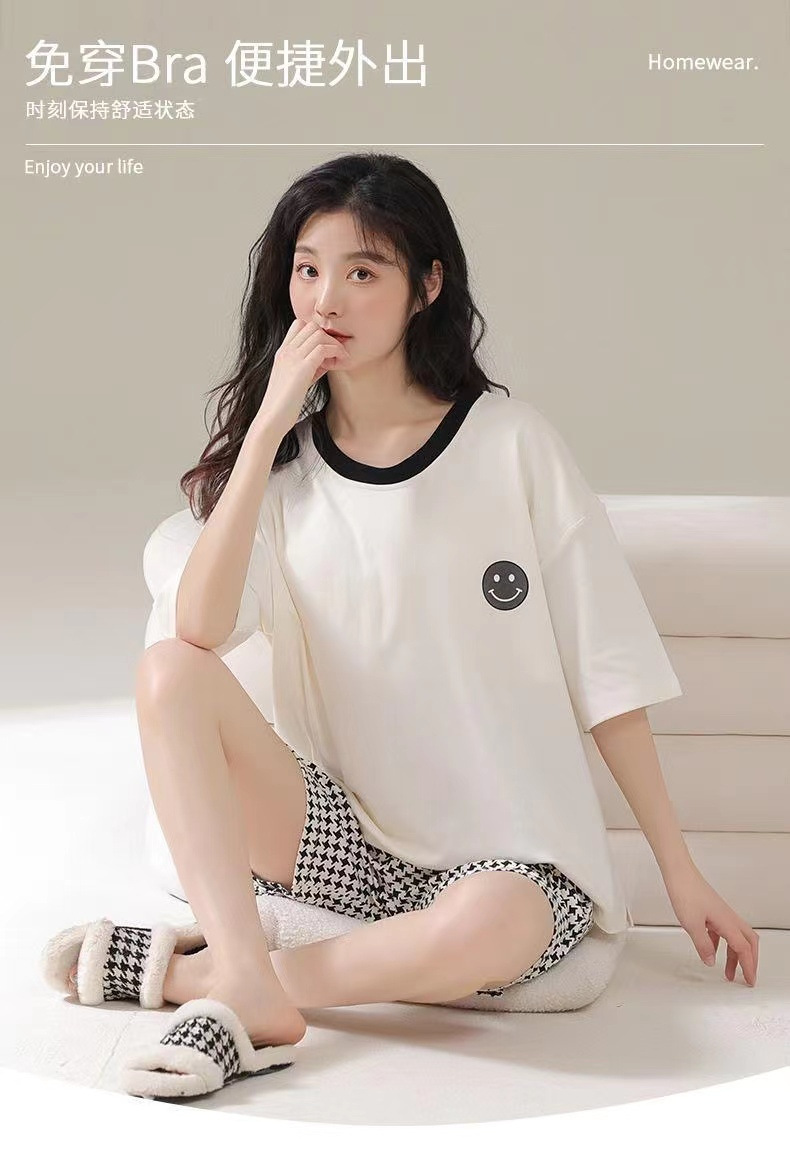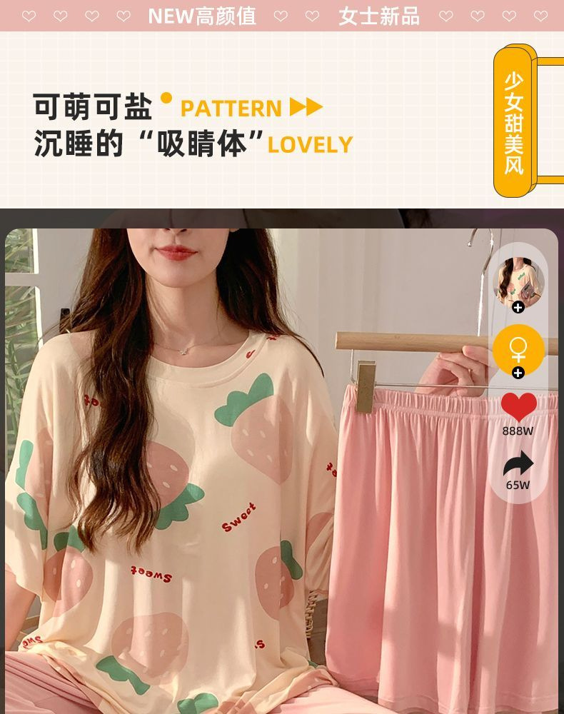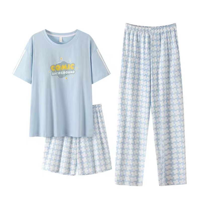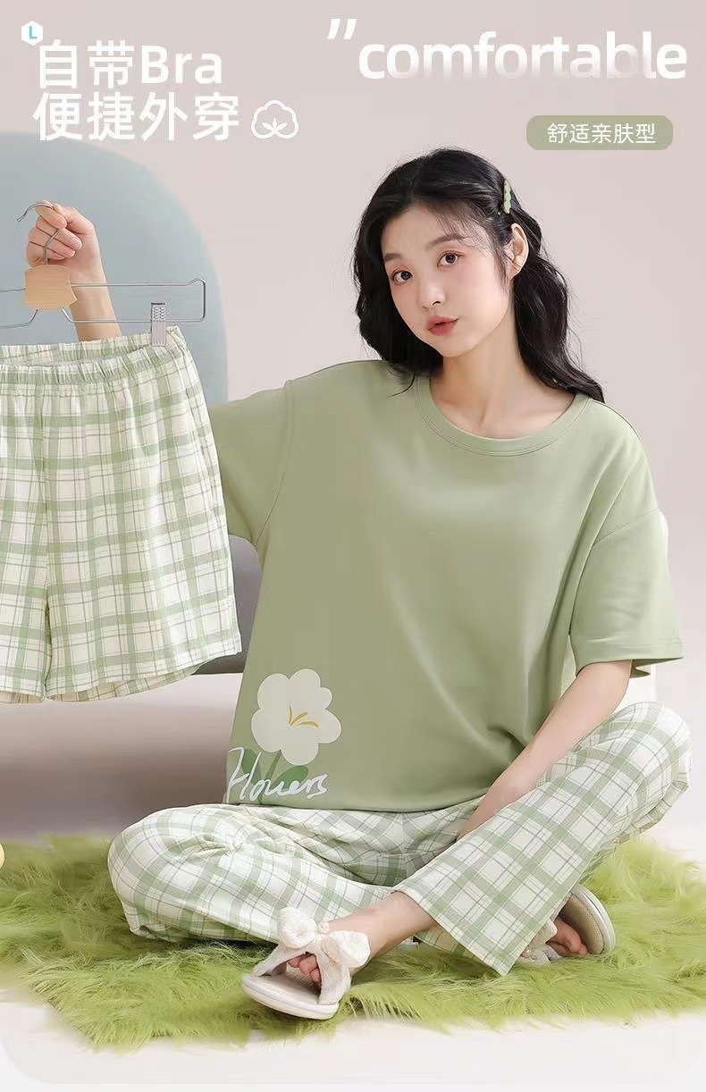 가슴 패드가 달린 3 피스 잠옷 여성 캐주얼 반팔 바지 달콤한 느슨한 플러스 사이즈 간단한 홈웨어 반바지스토어 가기