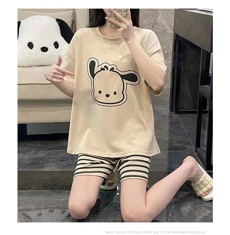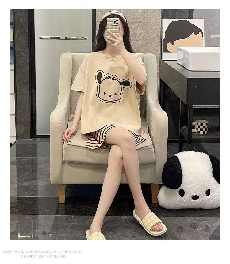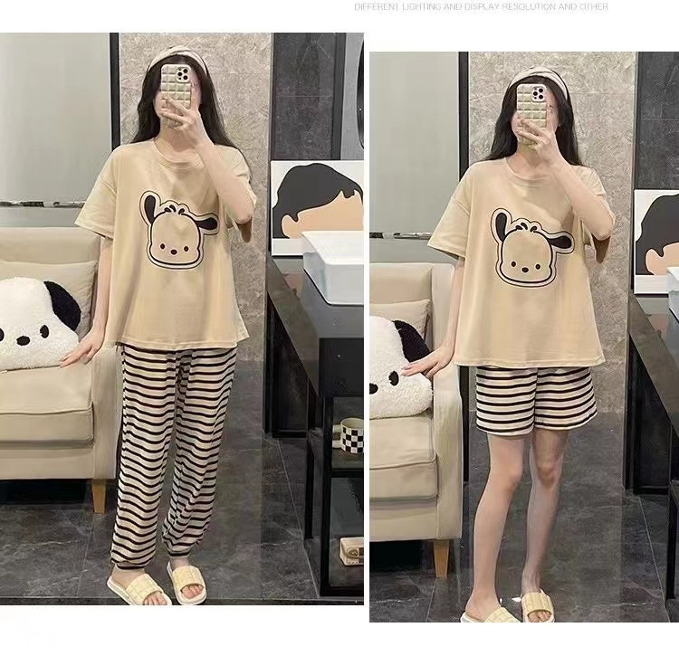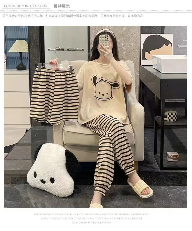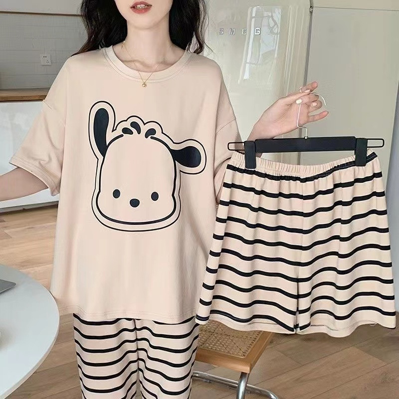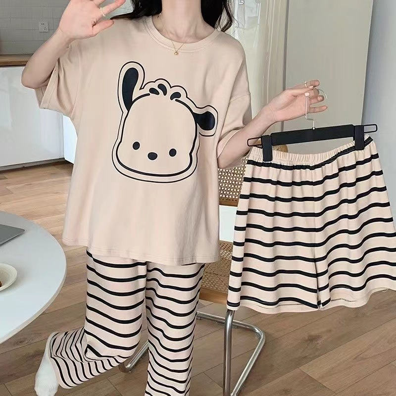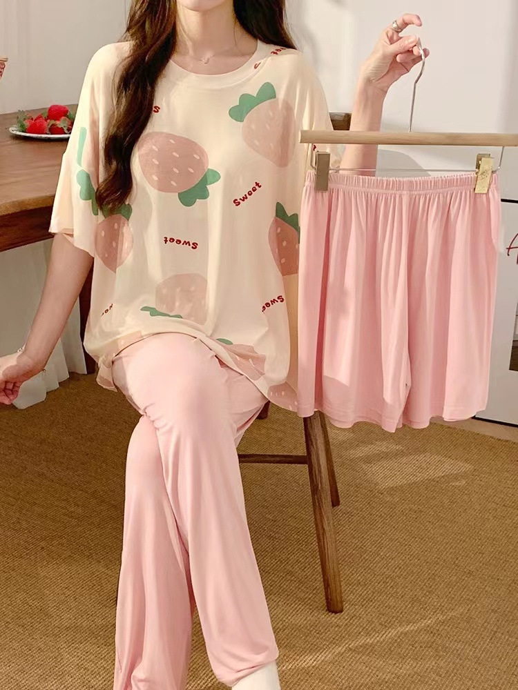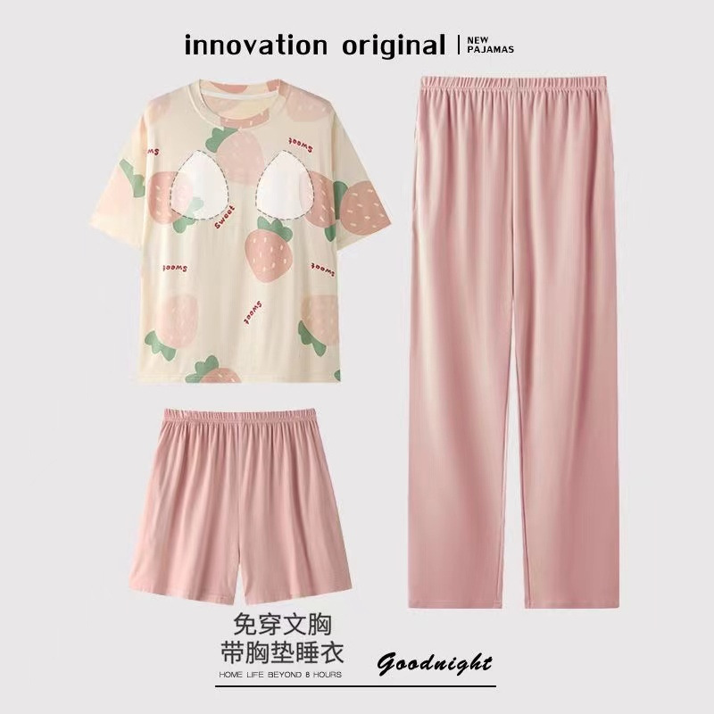 가슴 패드가 달린 3 피스 잠옷 여성 캐주얼 반팔 바지 달콤한 느슨한 플러스 사이즈 간단한 홈웨어 반바지