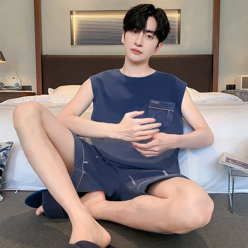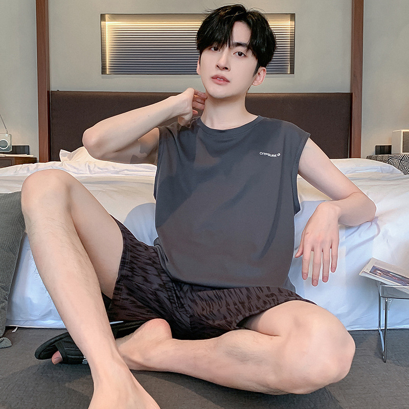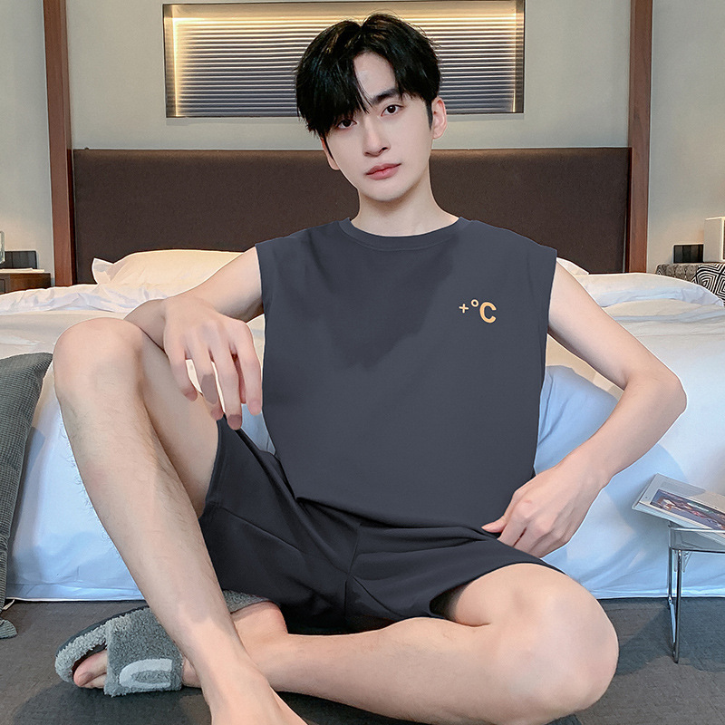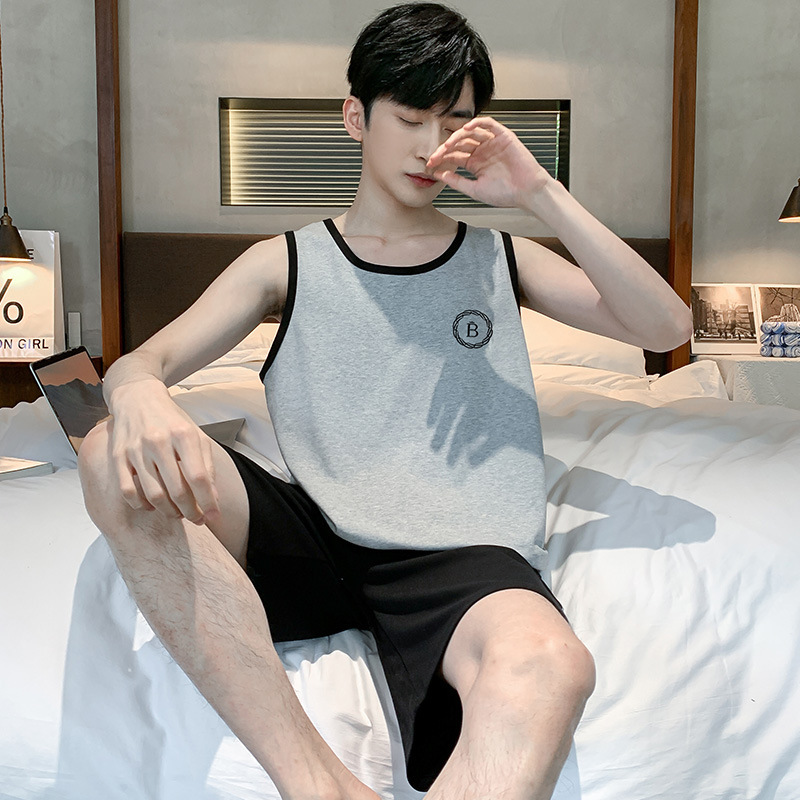 잠옷 남성용 여름 얇은 빗질 코튼 조끼 반바지 스포츠 플러스 사이즈 세트 학생들은 남성용 홈웨어 밖에서 입을 수 있습니다.스토어 가기