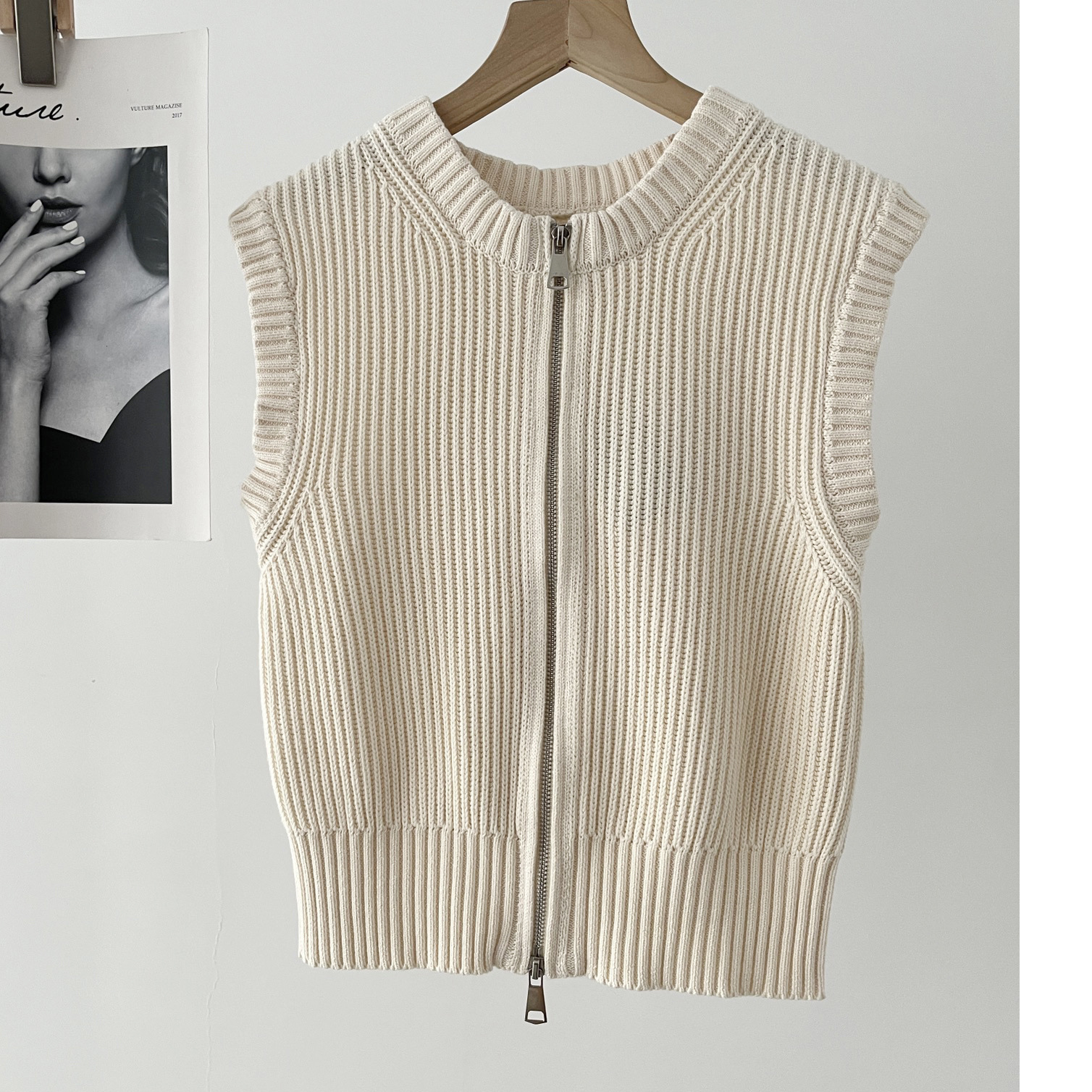 재고 있음 M 스타일 여성 봄 캐주얼 레이지 스타일 베이지색 민소매 스웨터 니트 지퍼 오픈 가디건 조끼