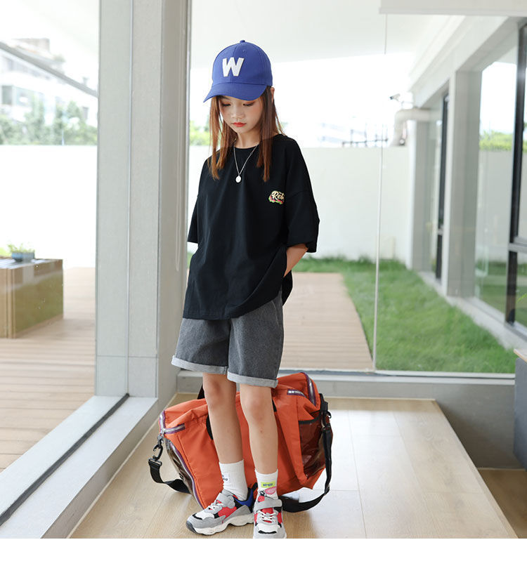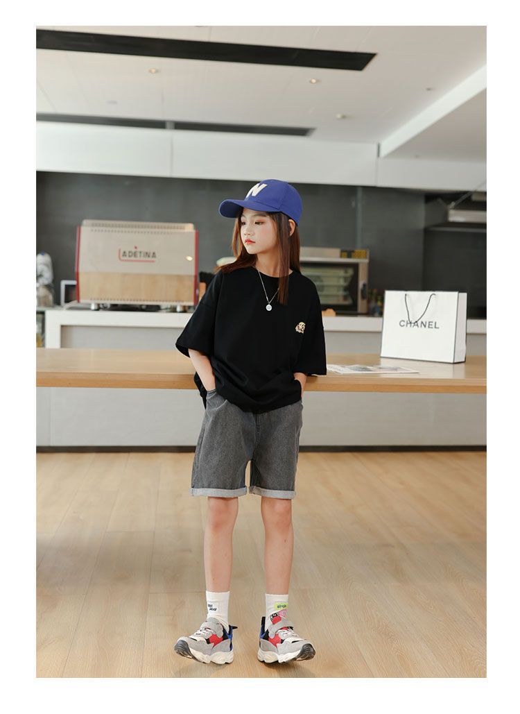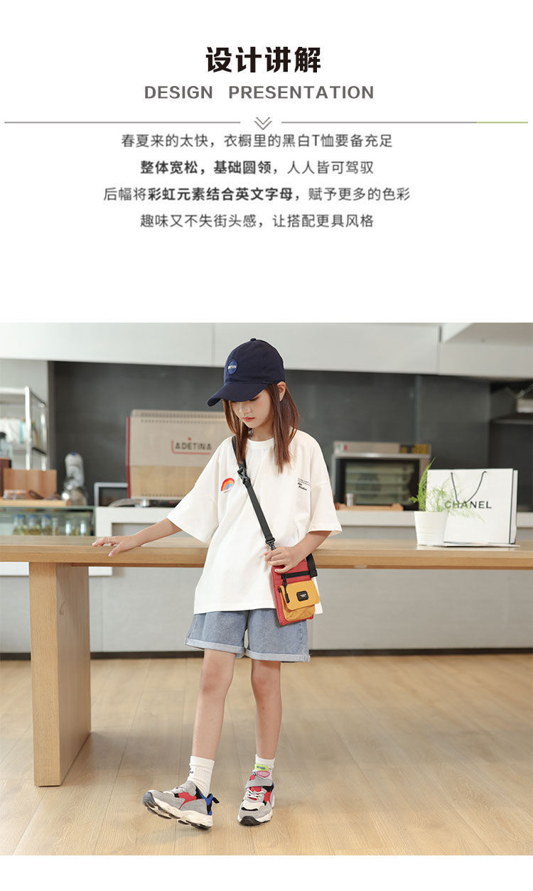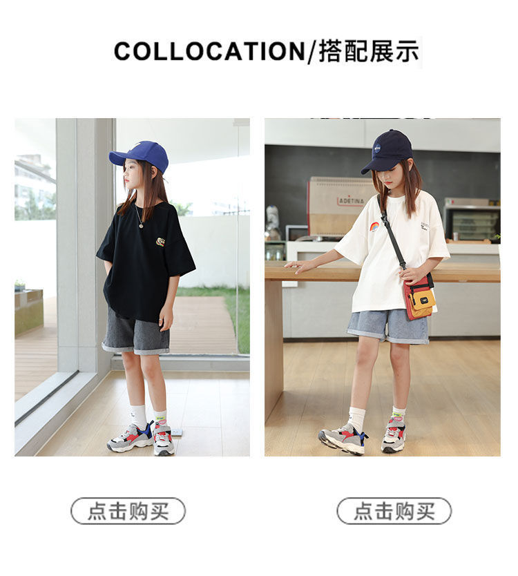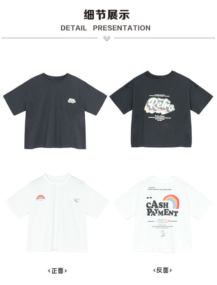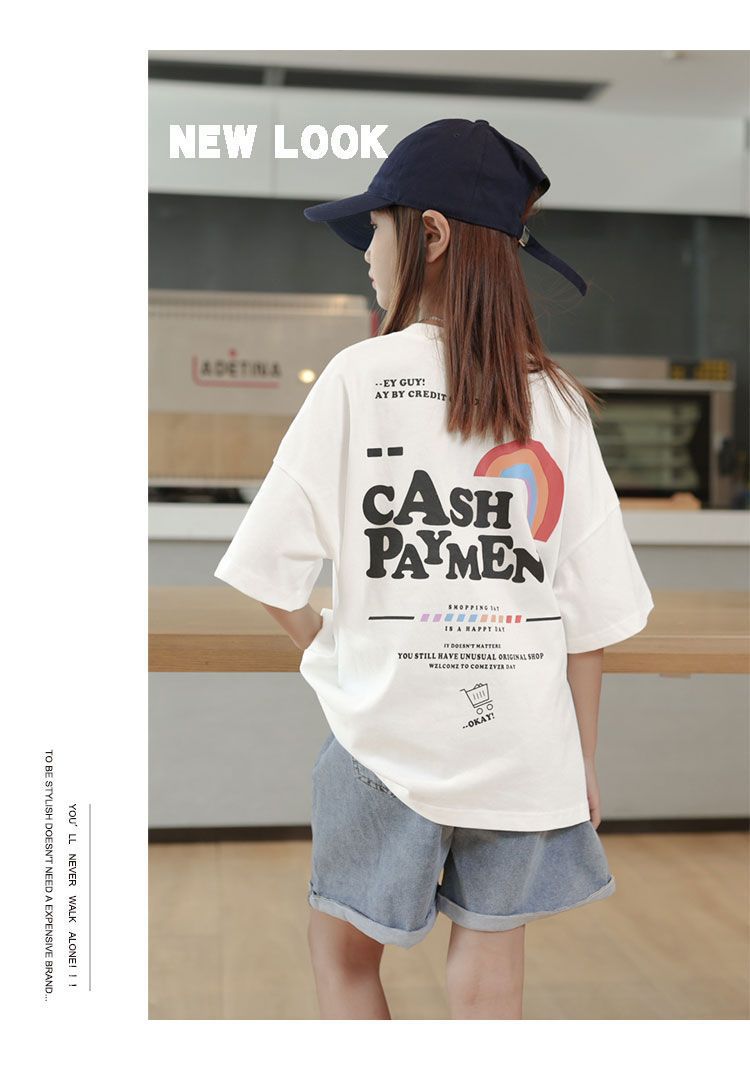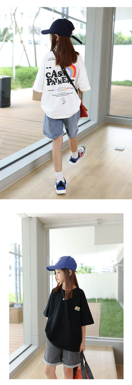소녀 반팔 티셔츠 앞뒤 아동복 여름 인쇄 새 반팔 셔츠 소녀 여름 의류 튀긴 거리 중 큰 아이들스토어 가기