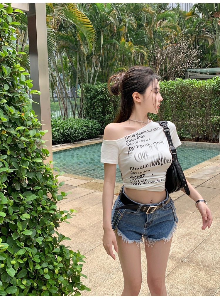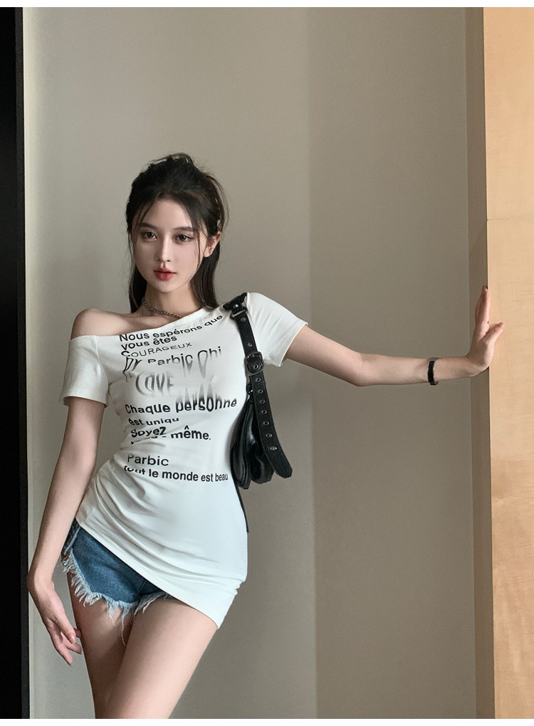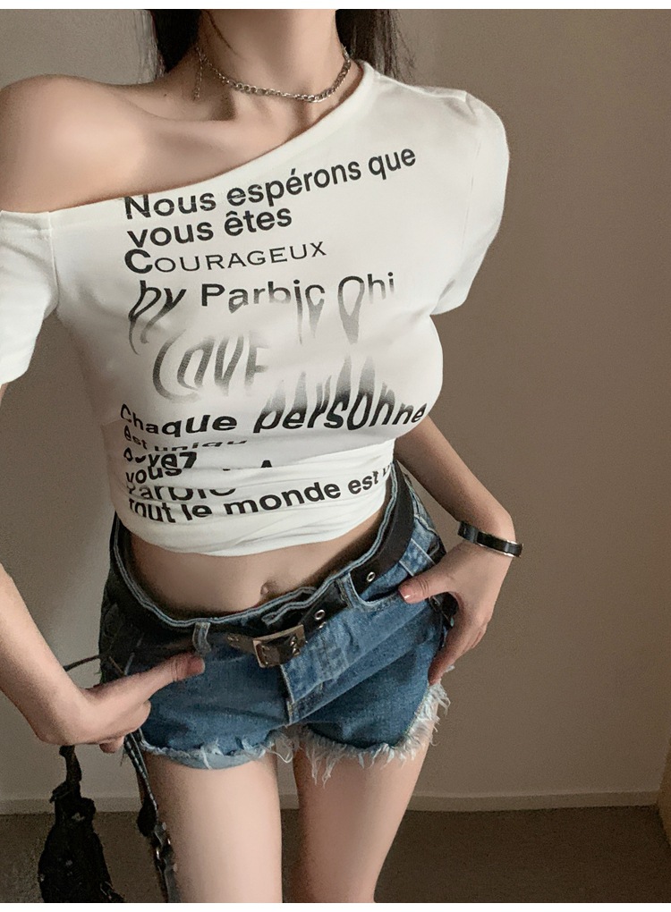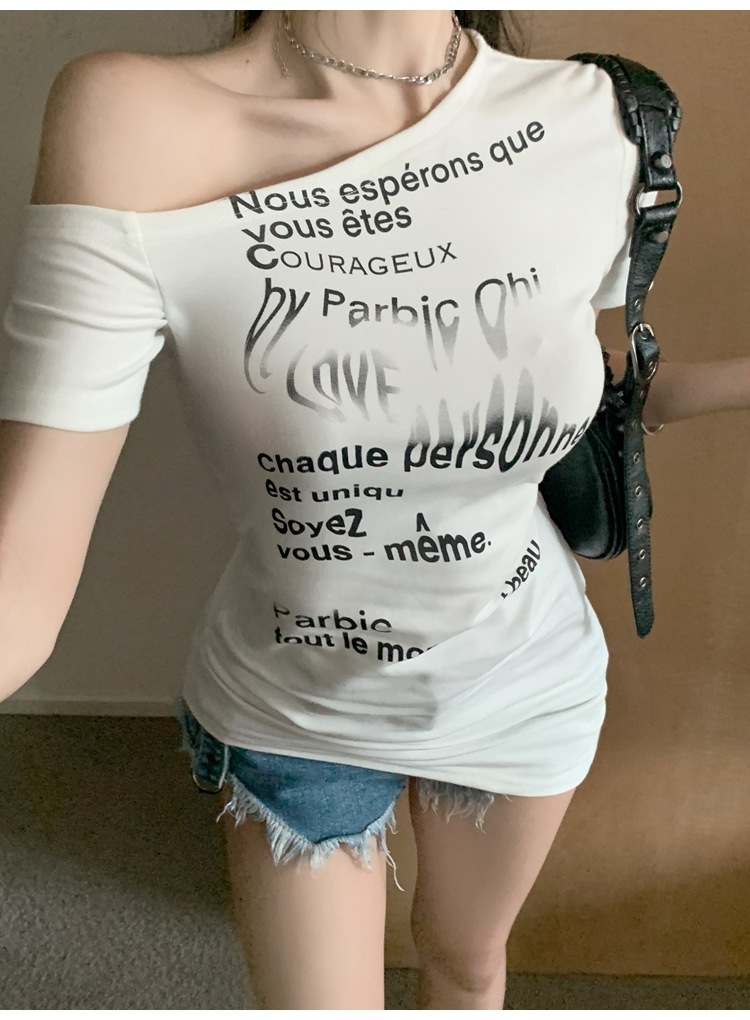 순수 어깨 반팔 티셔츠 여성 여름 미국 스타일 복고풍 불규칙한 편지 인쇄 중간 길이 정상