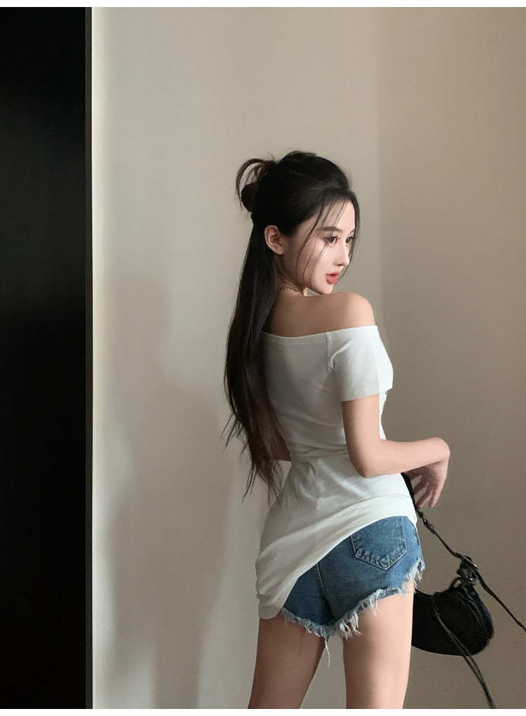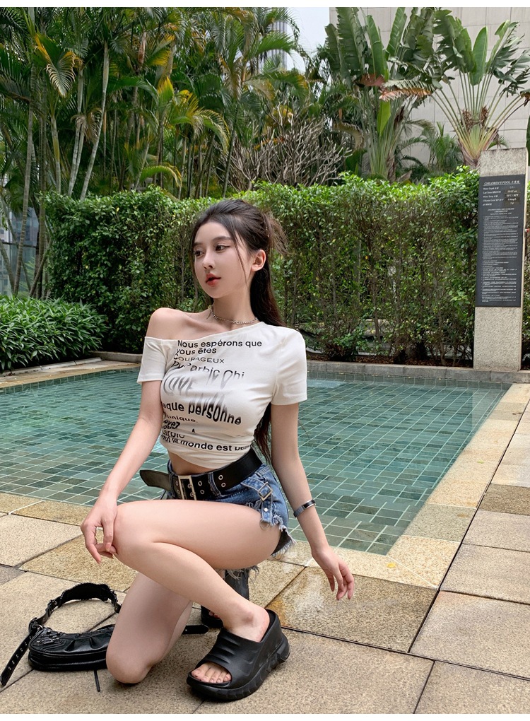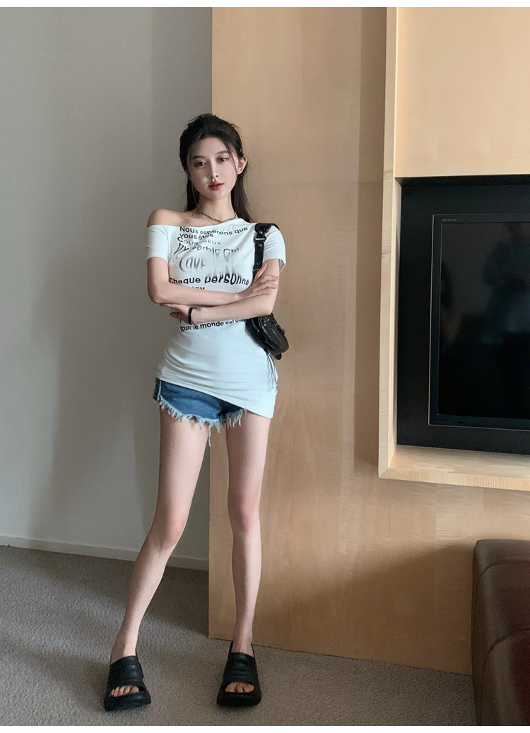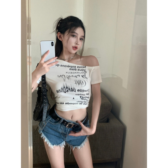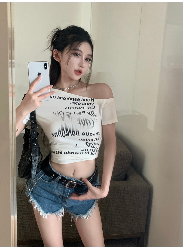 순수 어깨 반팔 티셔츠 여성 여름 미국 스타일 복고풍 불규칙한 편지 인쇄 중간 길이 정상