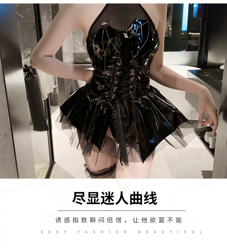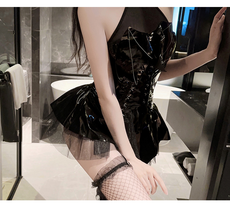 섹시한 란제리 새로운 스타일의 거울 Pu 고삐 스트랩 박쥐 작은 악마 관점 짧은 치마 매혹적인 유니폼 2 차원 세트스토어 가기