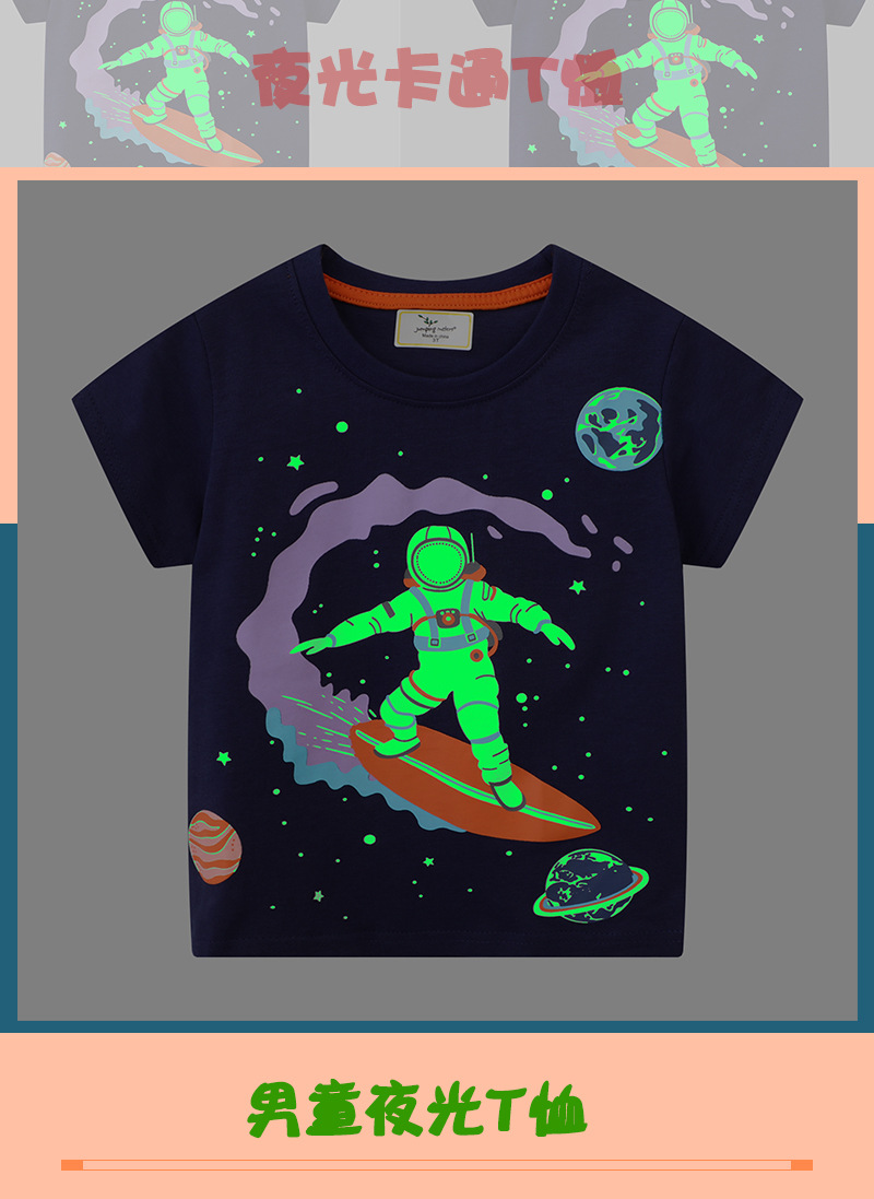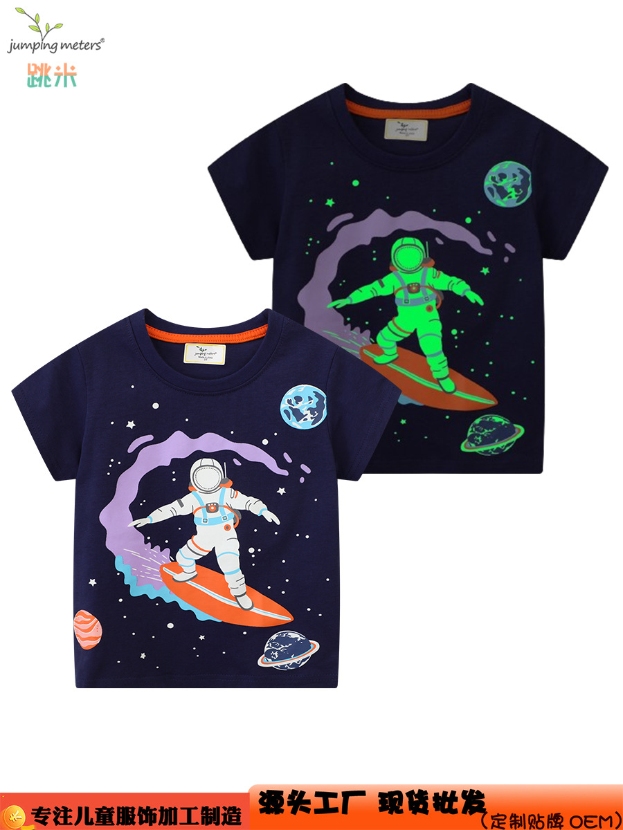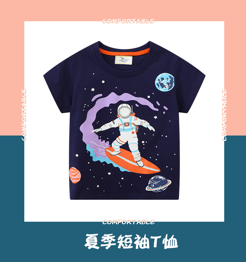 유럽과 미국 스타일의 아동 의류 2025 여름 신작 소년 티셔츠 니트 만화 빛나는 우주 비행사 반팔 티셔츠스토어 가기