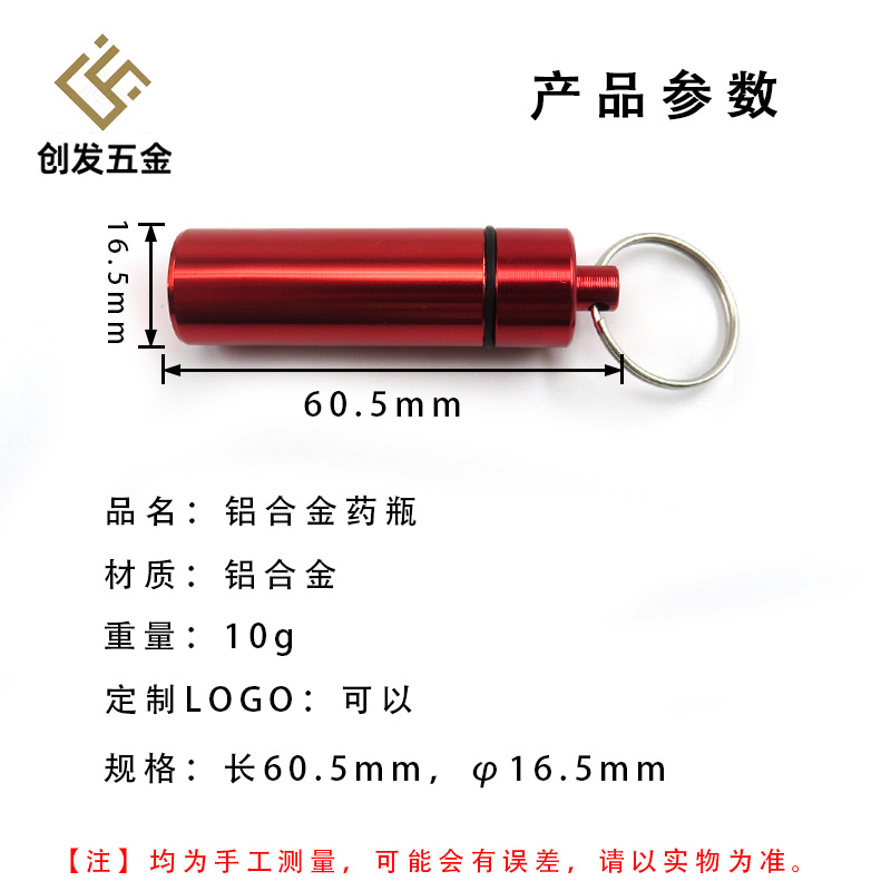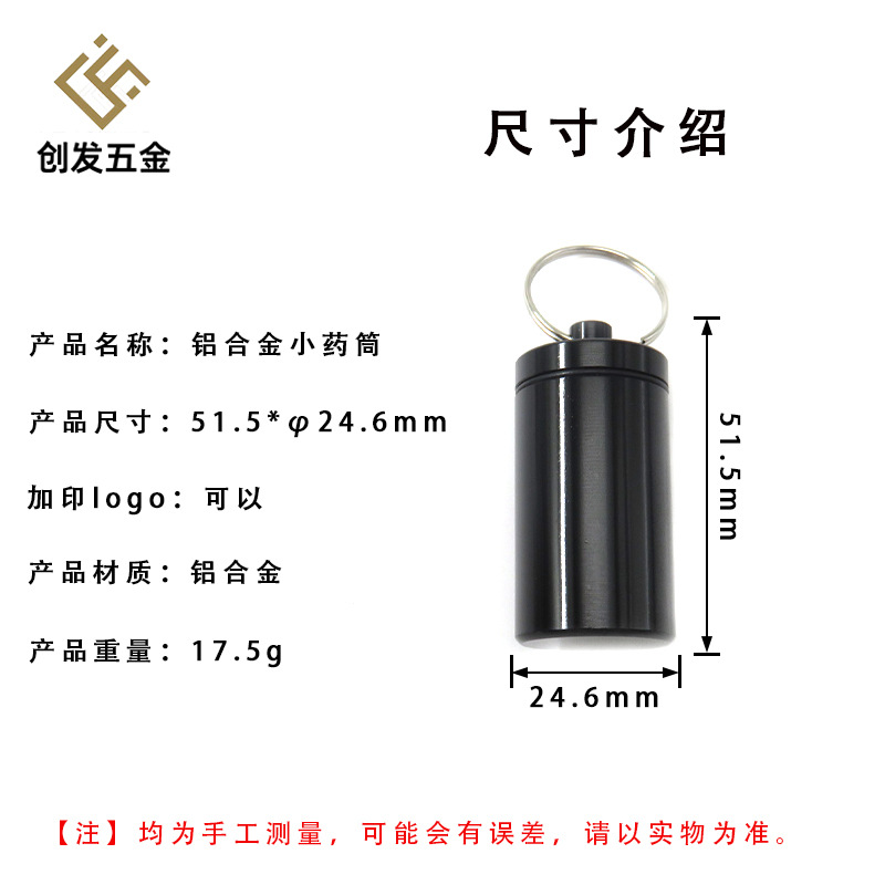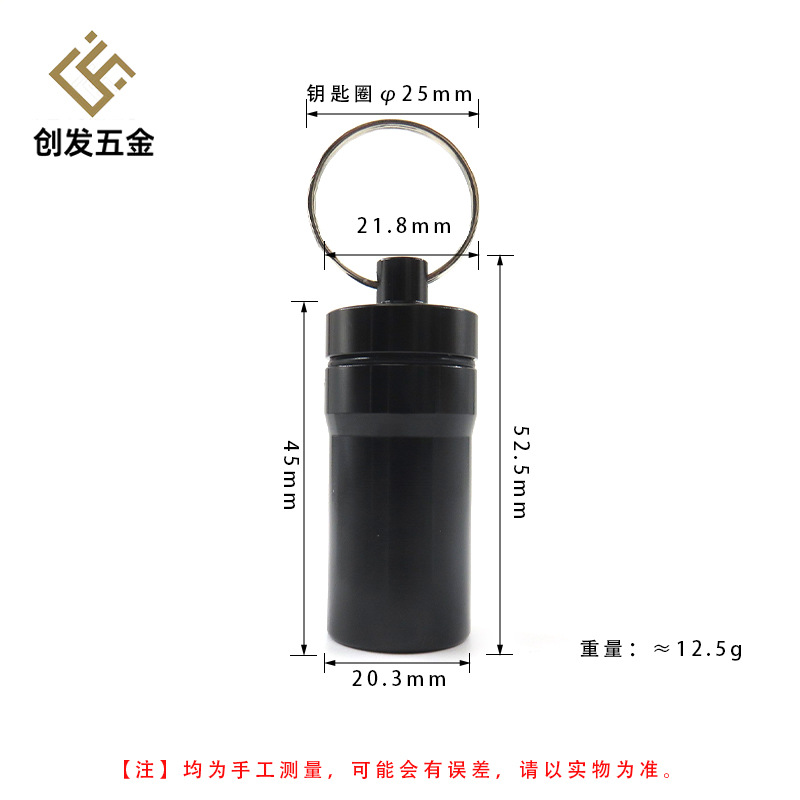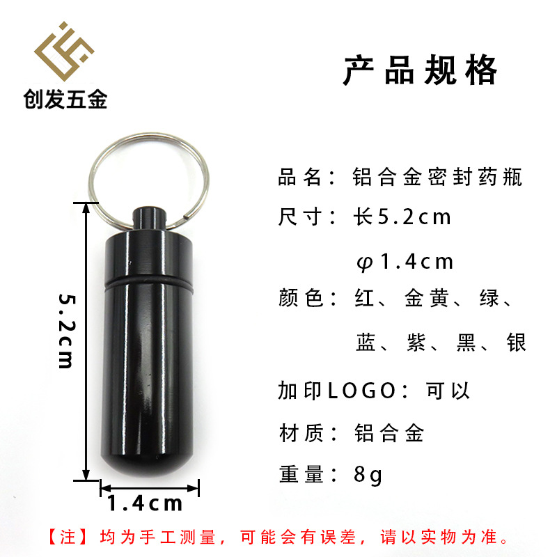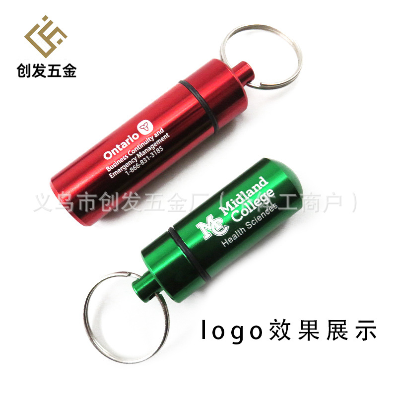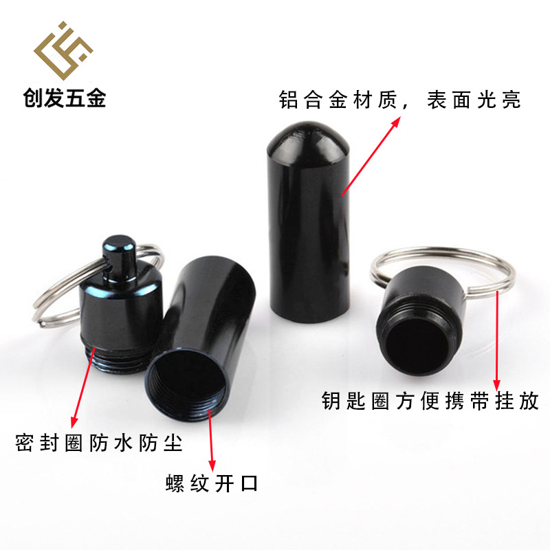 功能:该密封舱采用铝合金材料,产品表面阳极氧化处理,防水耐磨,盖可旋开,有密封圈,可以防水防尘,药筒里面很干净,可以装急救药片,或常用药片,小的火石,鱼钩鱼线等生存装备,有挂圈,方便使用。来图来样定制logo,欢迎咨询!!!