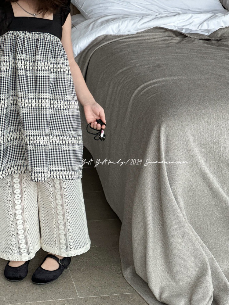 소녀 원피스 2024 여름 새 어린이 한국식 무거운 자수 자카드 흑백 격자 무늬 비행 소매 서스펜더 원피스