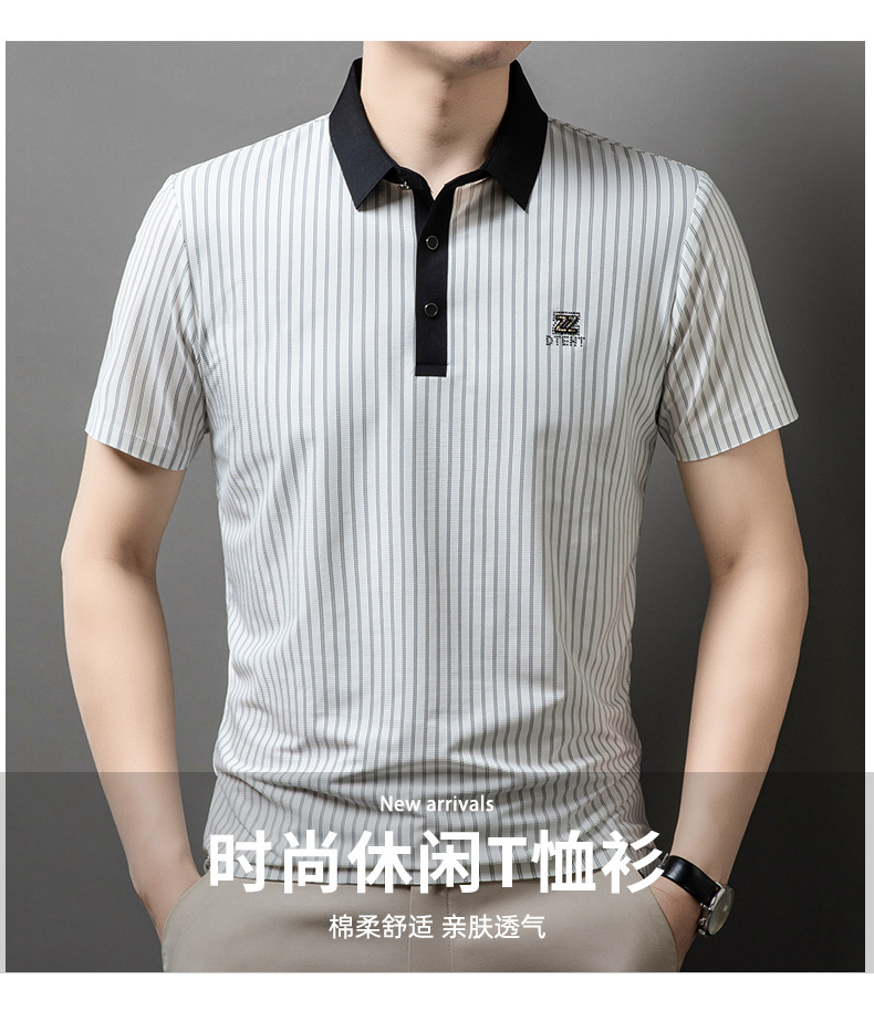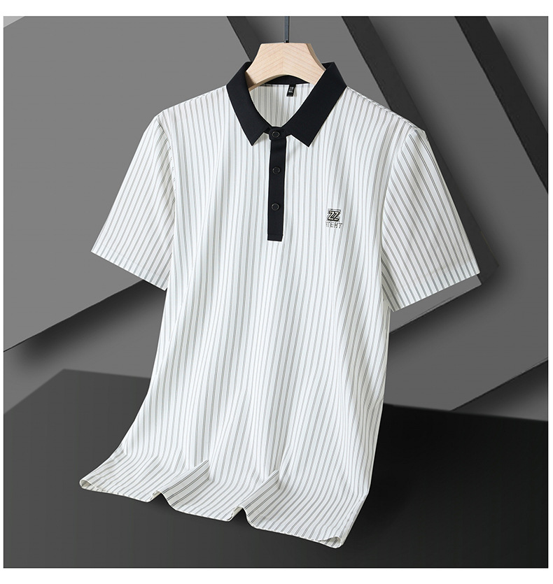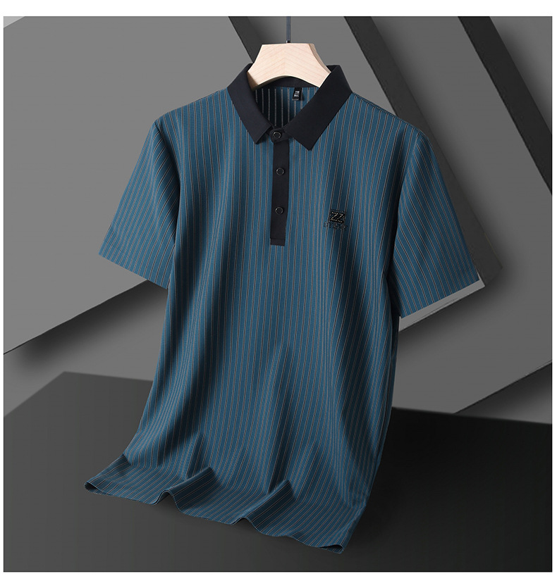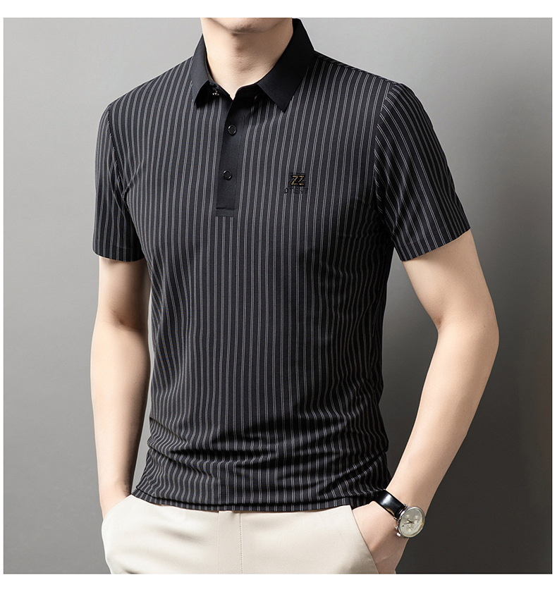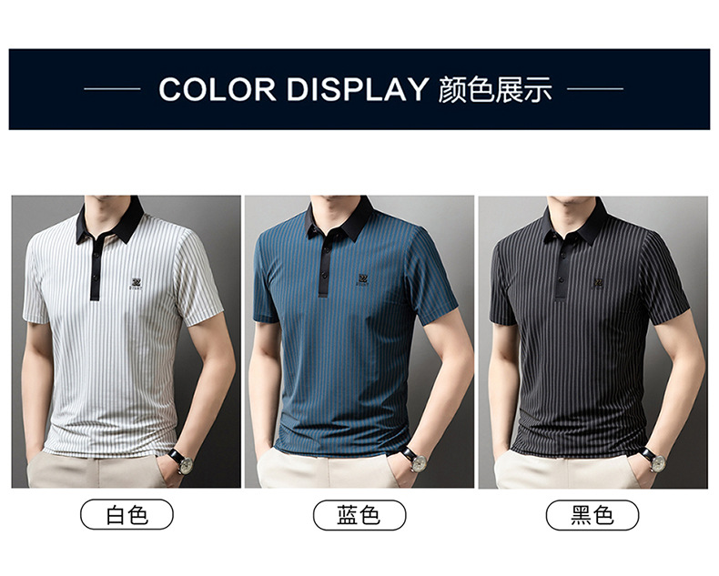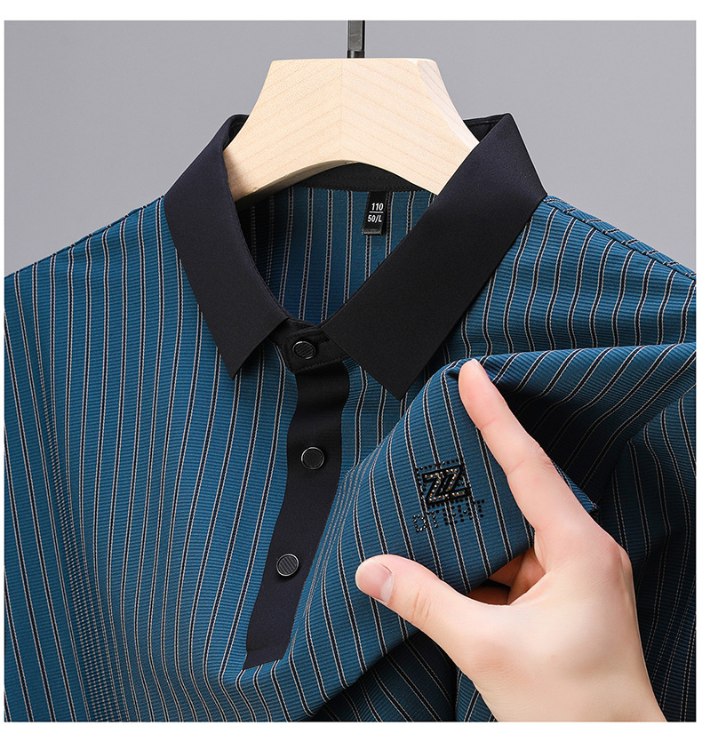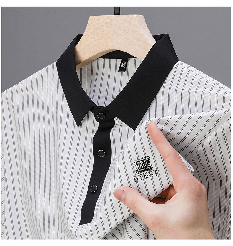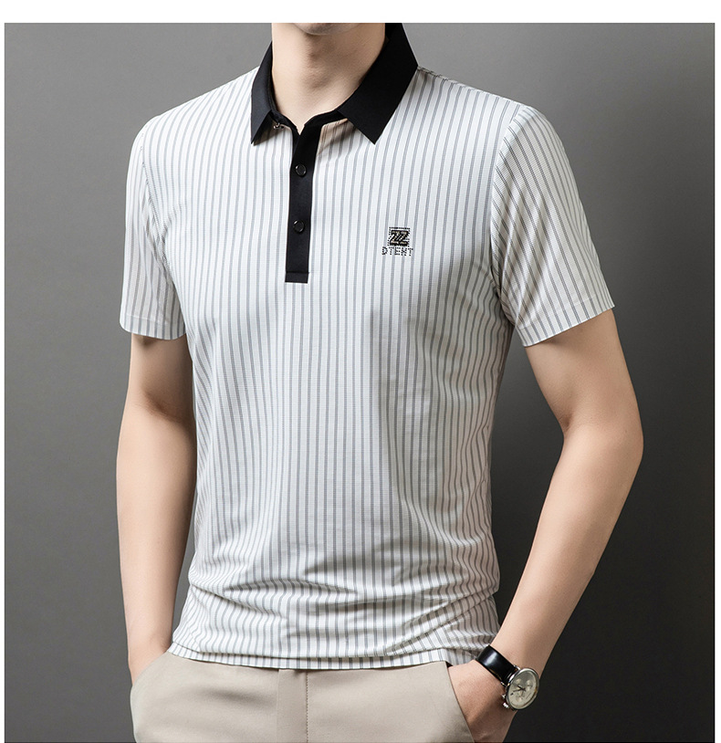 청소년 2024 여름 반팔 모조 다이아몬드 티셔츠 남성용 폴로 셔츠 새로운 아이스 실크 원활한 캐주얼 줄무늬 옷깃