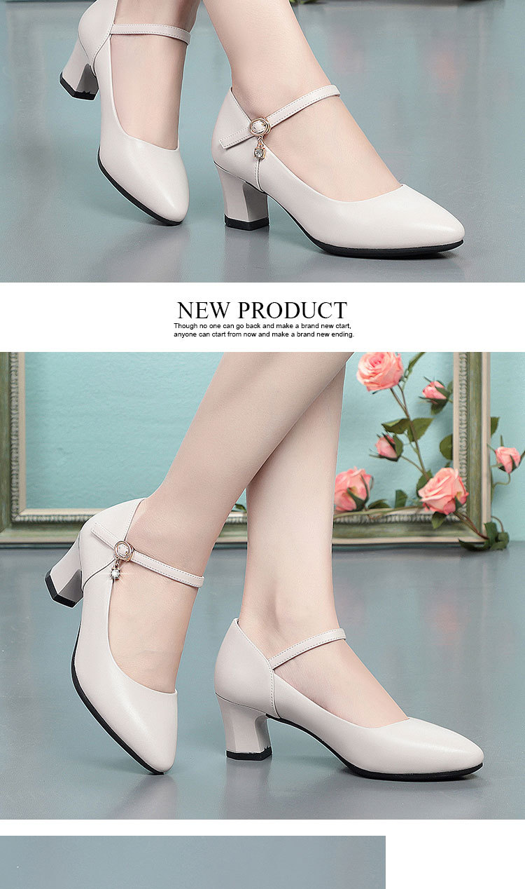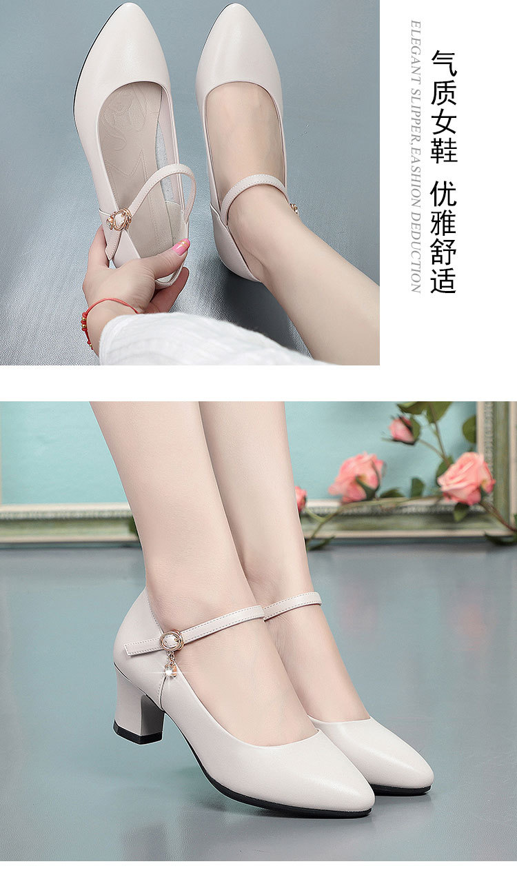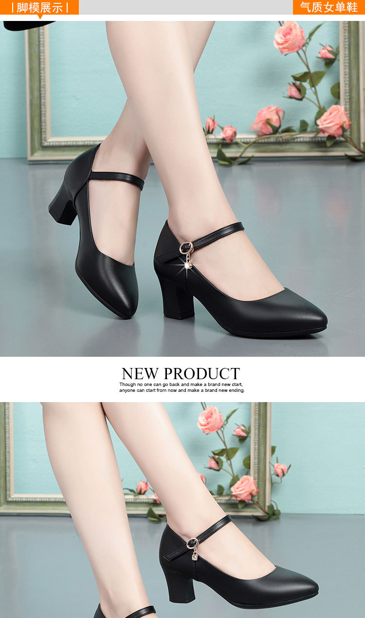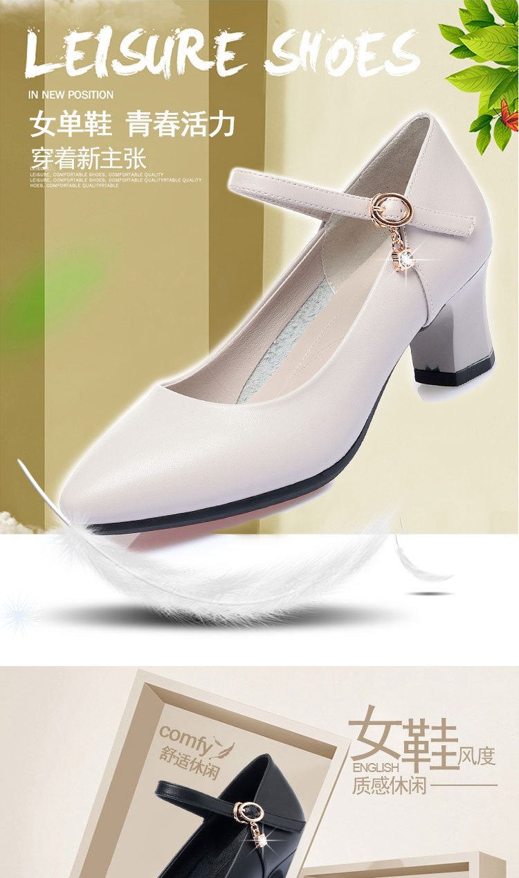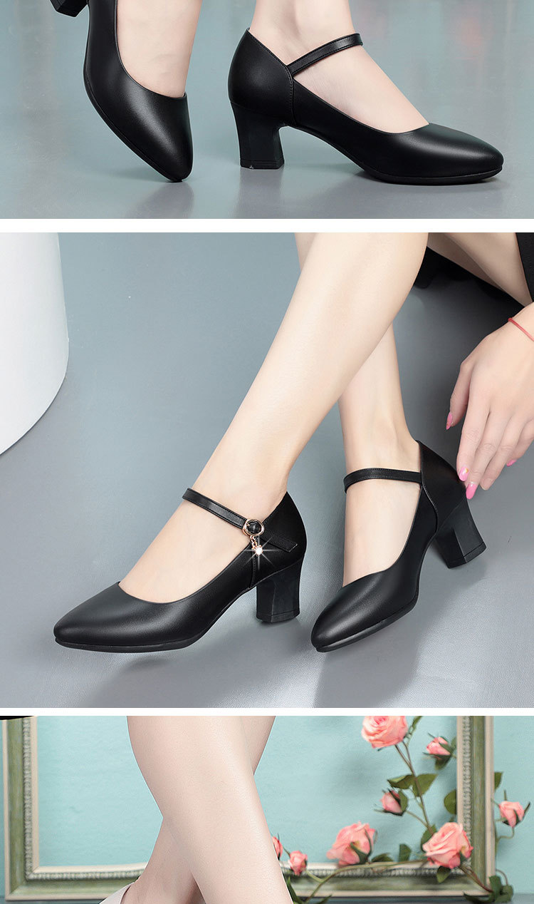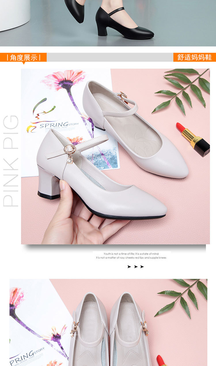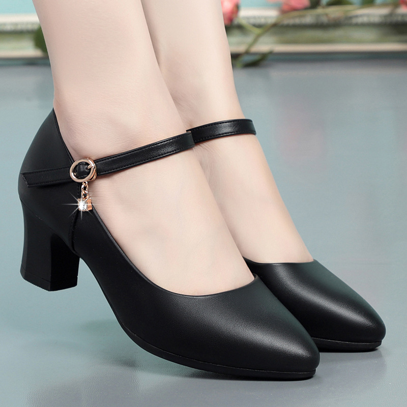 봄과 가을의 새로운 얕은 입 뾰족한 가죽 부드러운 바닥 올 매치 청키 힐 하이힐 슈즈와 버클 마더 슈즈 작업 신발스토어 가기