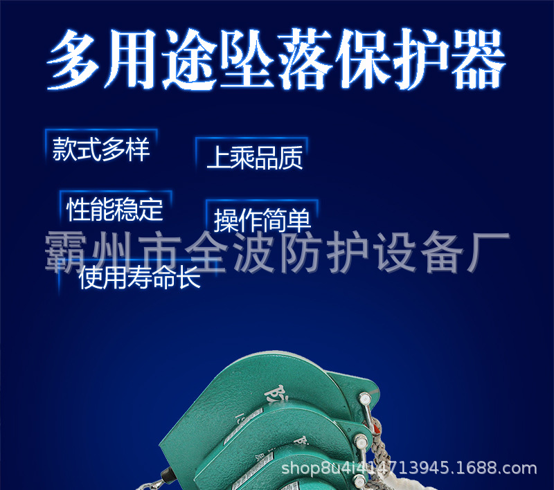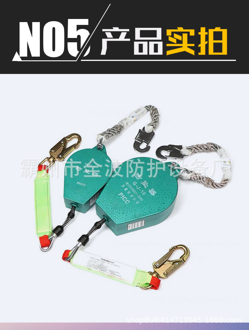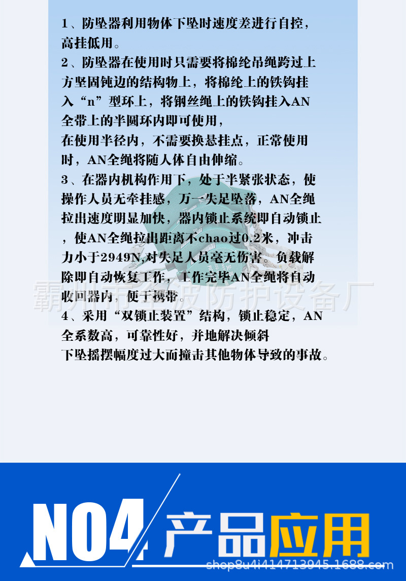 2、防坠器在使用时只需要将棉纶吊绳跨过上方坚固钝边的结构物上,将棉纶上的铁钩挂入“n”型环上,将钢丝绳上的铁钩挂入AN全带上的半圆环内即可使用,