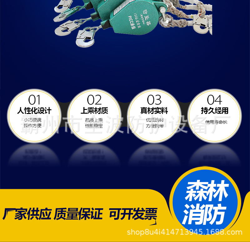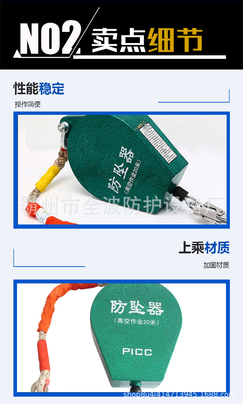 3、在器内机构作用下,处于半紧张状态,使操作人员无牵挂感,万一失足坠落,AN全绳拉出速度明显加快,器内锁止系统即自动锁止,使AN全绳拉出距离不chao过0.2米,冲击力小于2949N,对失足人员毫无伤害。负载解除即自动恢复工作,工作完毕AN全绳将自动收回器内,便于携带。