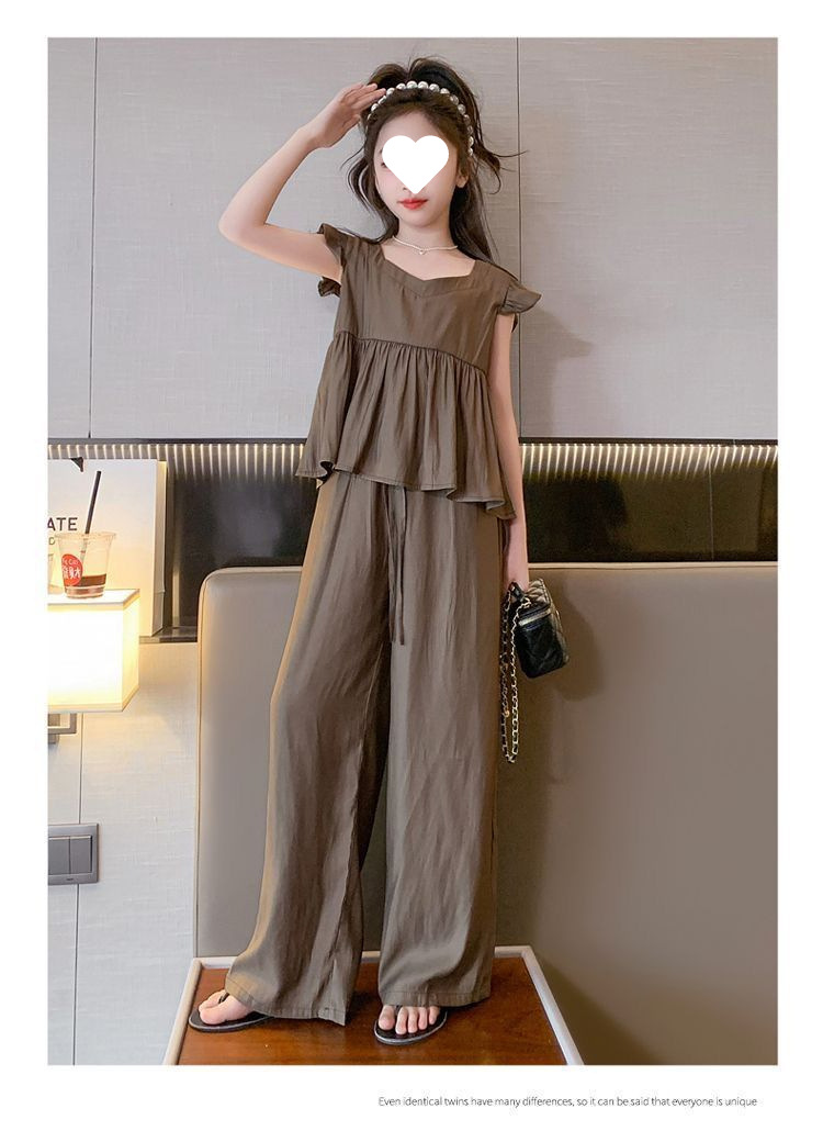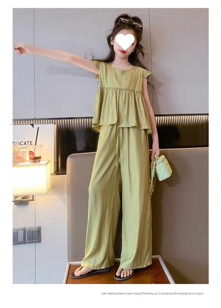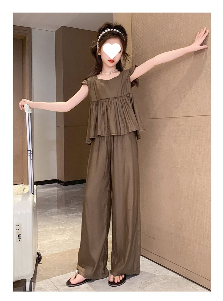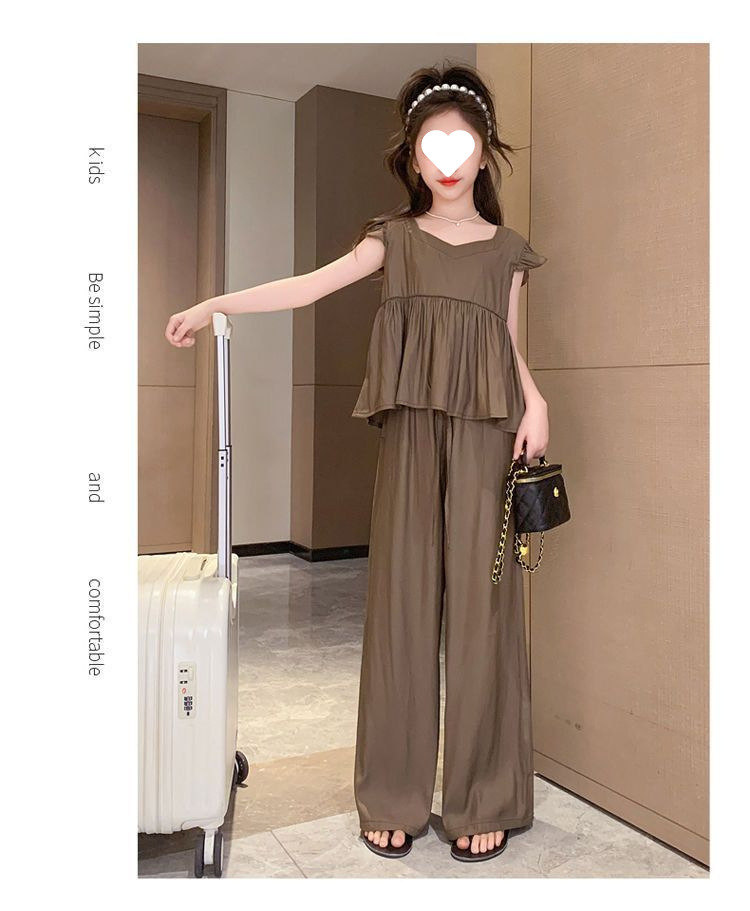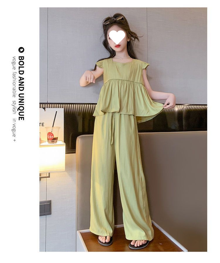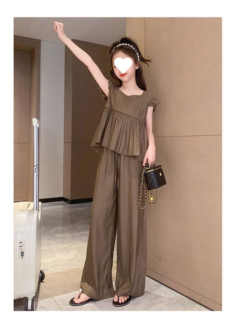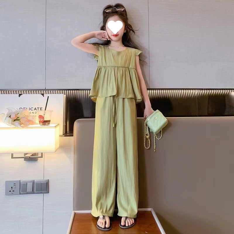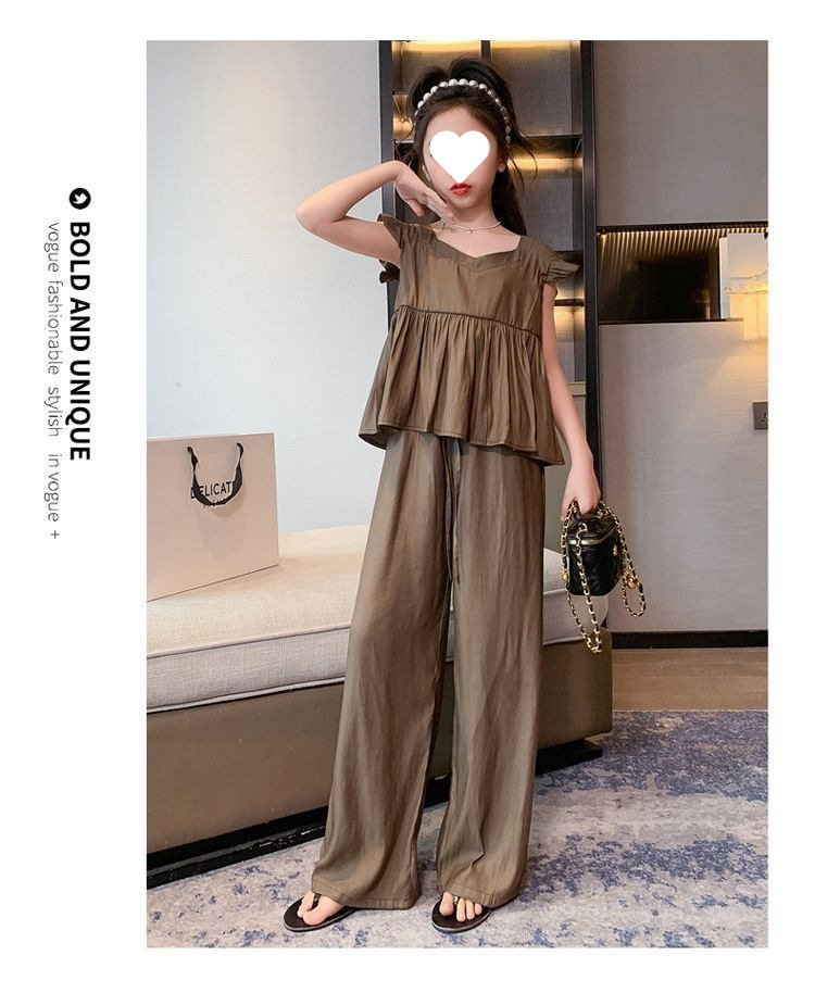 소녀 한국식 와이드 레그 팬츠 세트 2024 새로운 도착 큰 어린이 서양식 귀여운 소녀 쉬폰 티셔츠 바지 투피스 세트