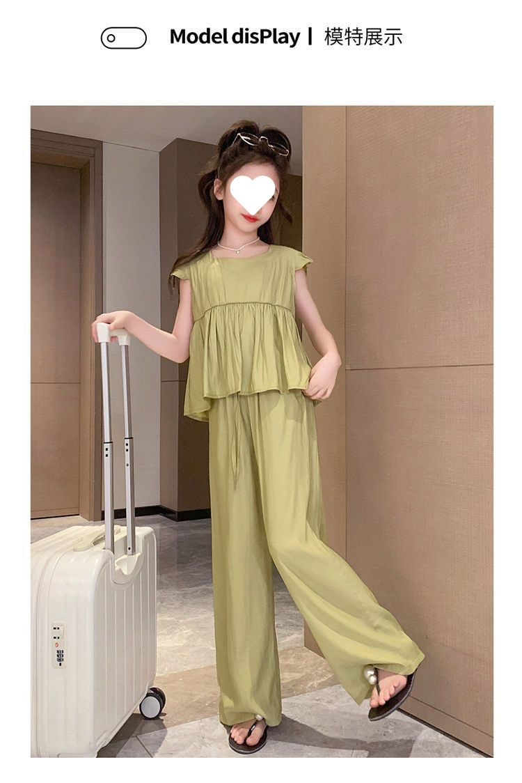 소녀 한국식 와이드 레그 팬츠 세트 2024 새로운 도착 큰 어린이 서양식 귀여운 소녀 쉬폰 티셔츠 바지 투피스 세트스토어 가기