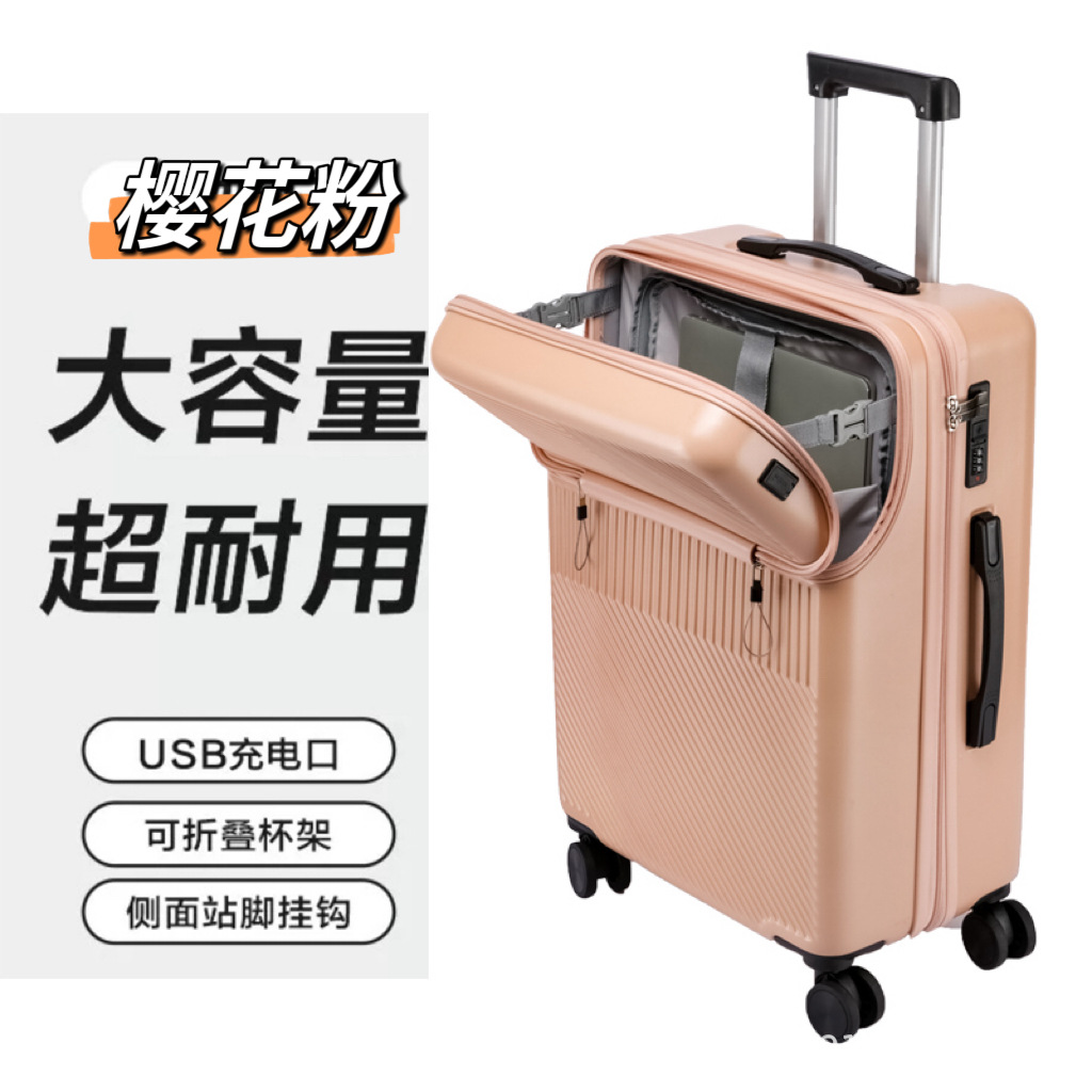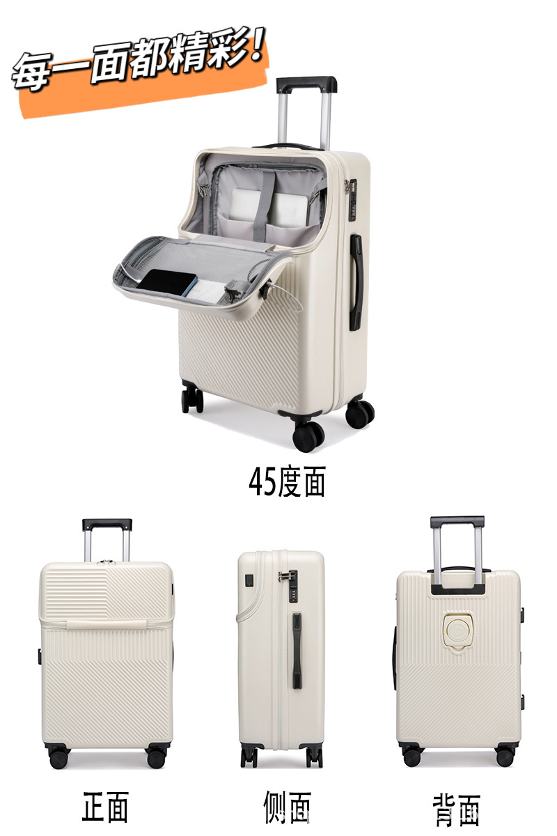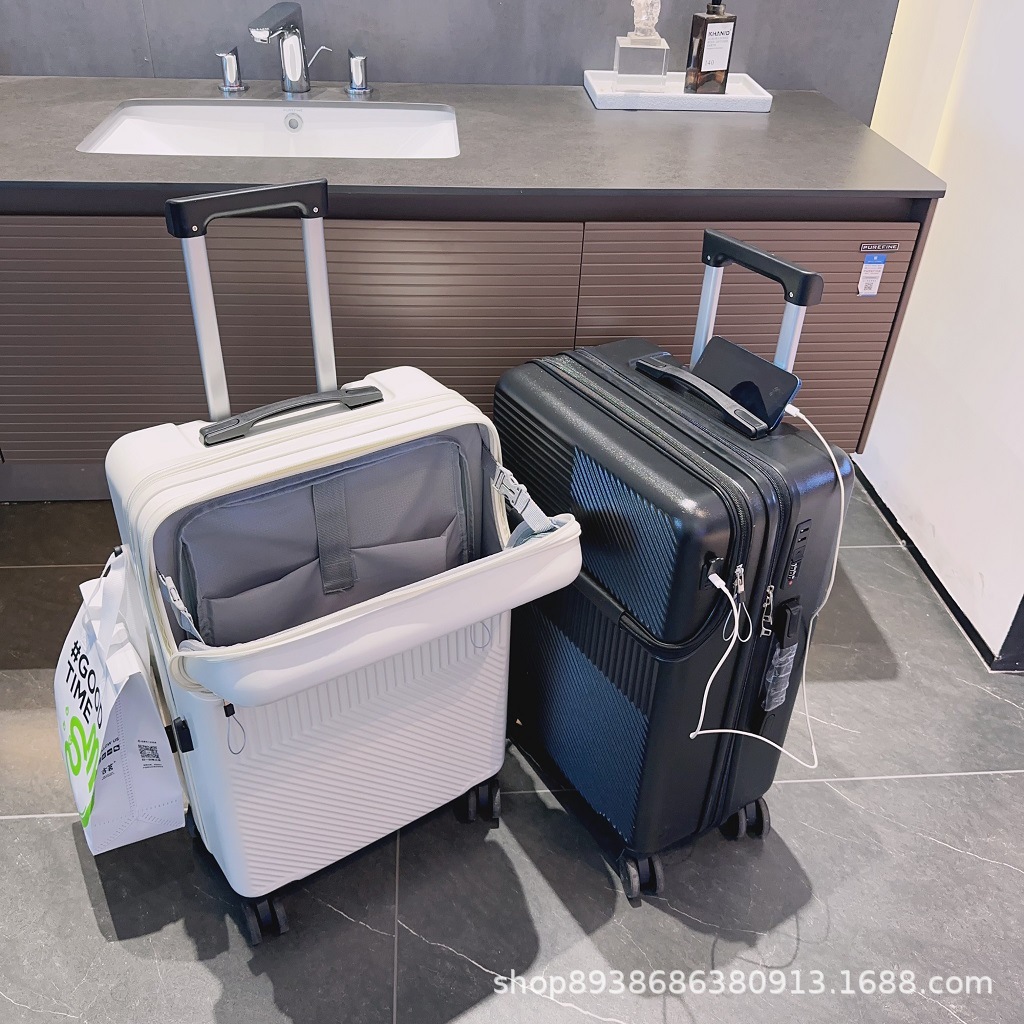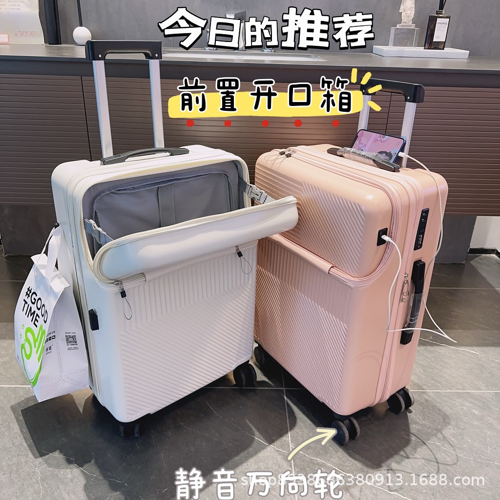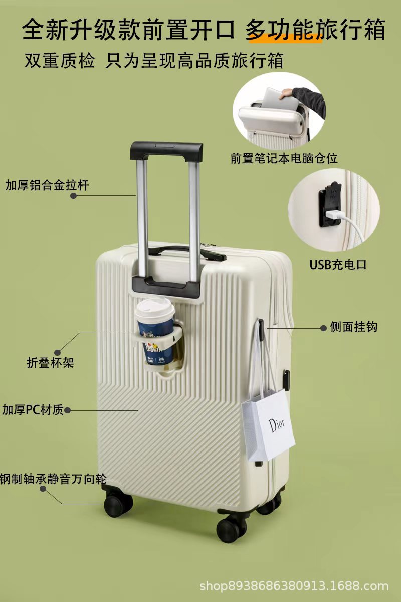 2023 새로운 다기능 전면 개방 수하물 여성 유니버설 휠 가방 충전 용 컵 홀더 트롤리 케이스스토어 가기