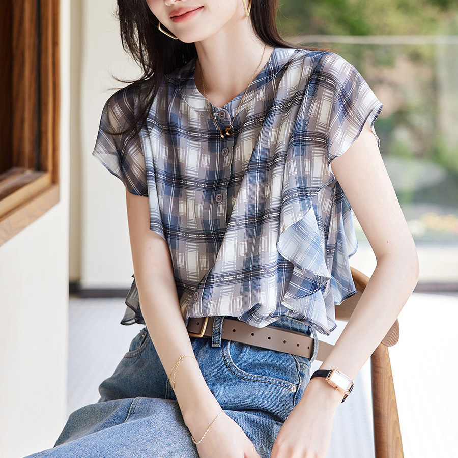 24 여성복 러플 쉬폰 격자 무늬 디자인 센스 니쉬 셔츠 모고 피쉬 위안 추앙 스위트 프렌치 칙 탑스토어 가기