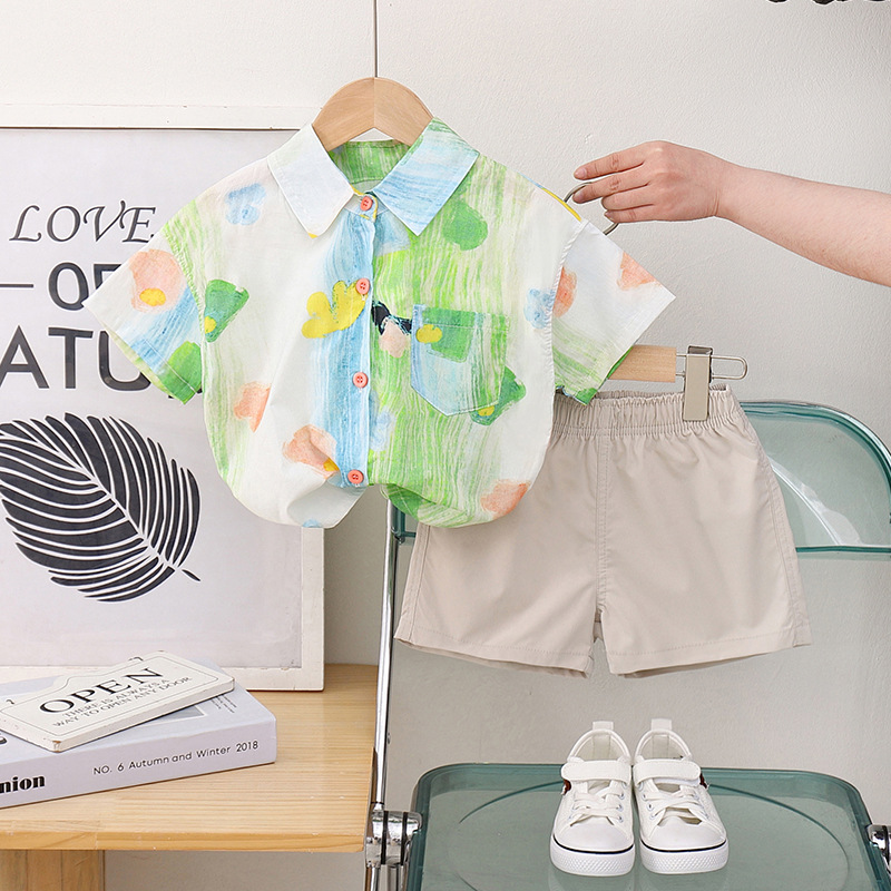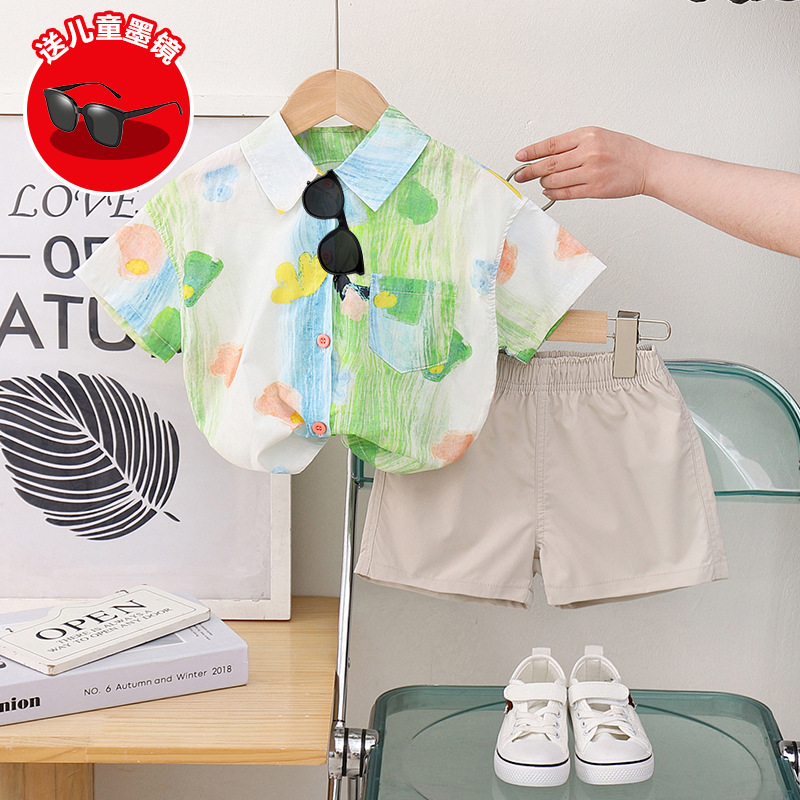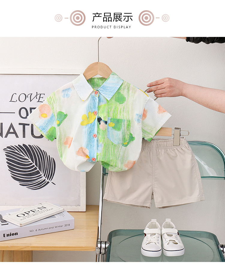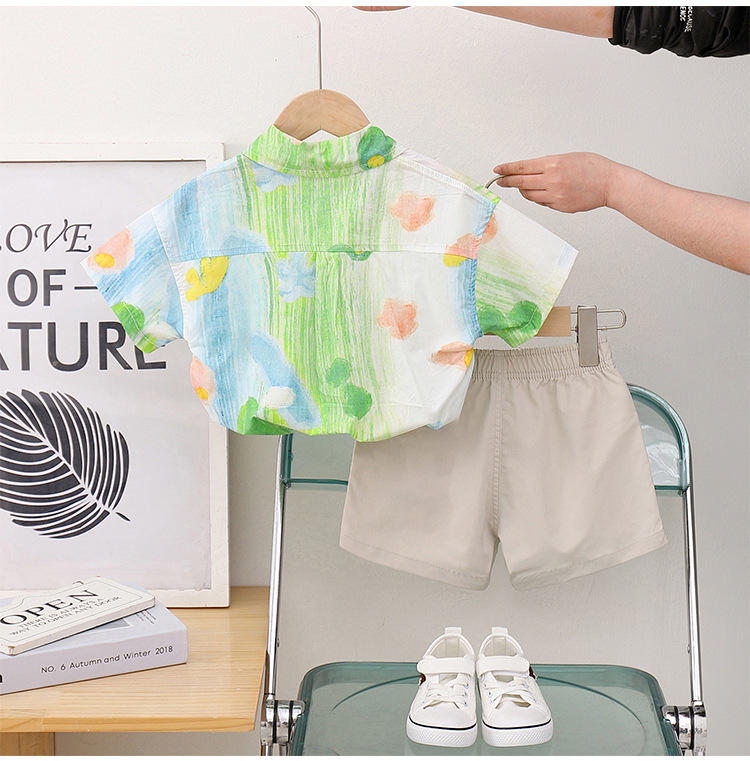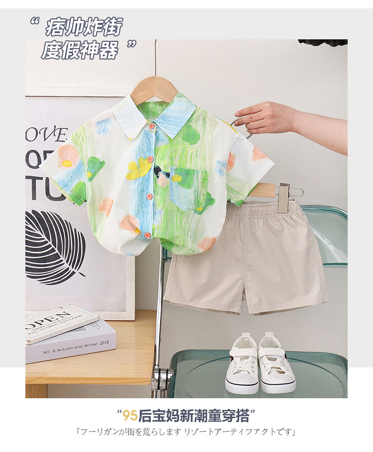 새로운 아동복 어린이 유화 반팔 꽃 셔츠 새로운 홍콩 스타일 루안 잘 생긴 소년의 세트 아기 캐주얼 꽃 셔츠