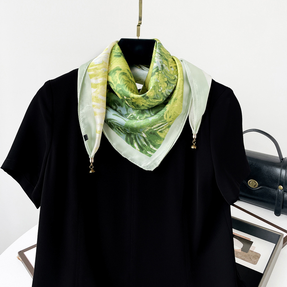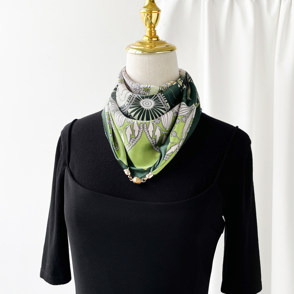 2025 봄 여름 신상 여성용 고급 자석 버클 실크 스카프, 패셔너블하고 스타일리쉬한 삼각 스카프, 자흡식 스카프스토어 가기