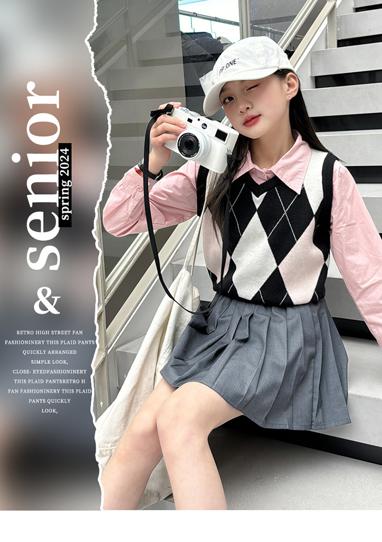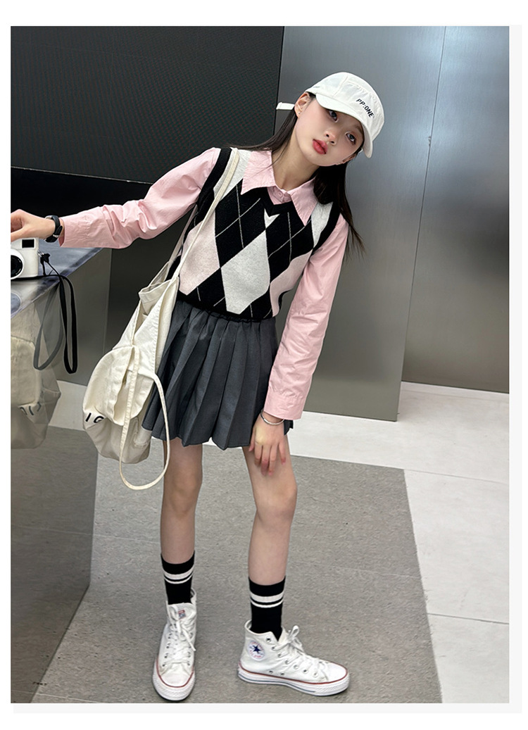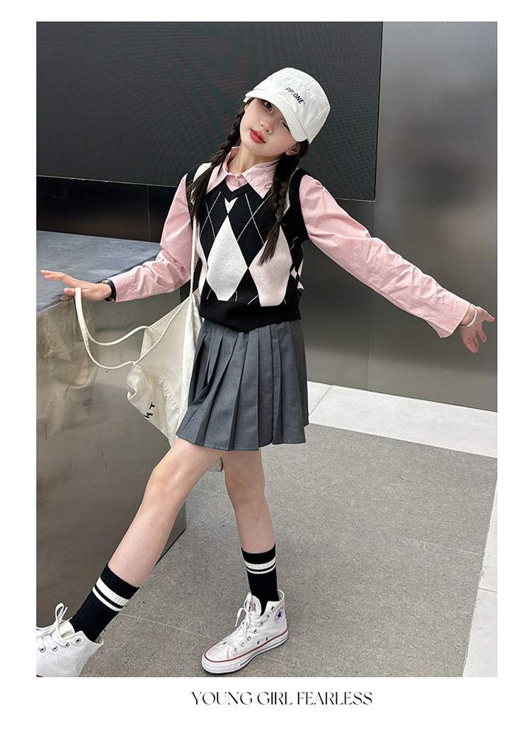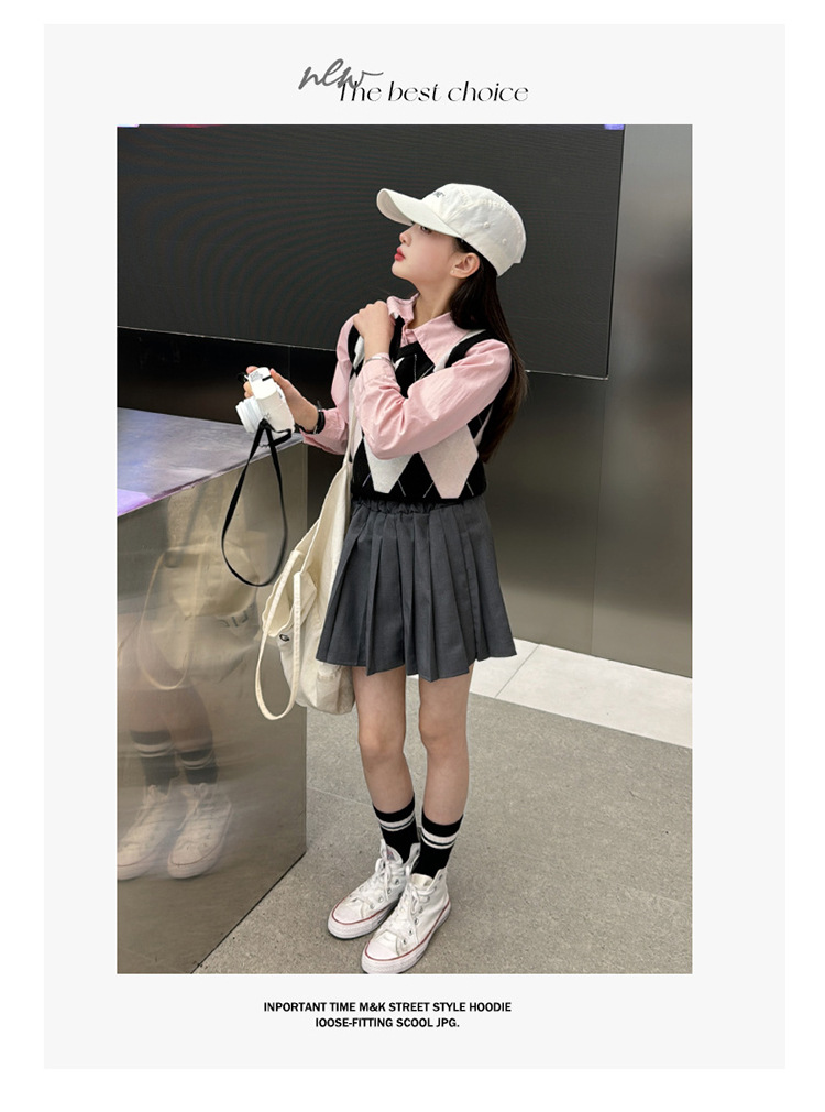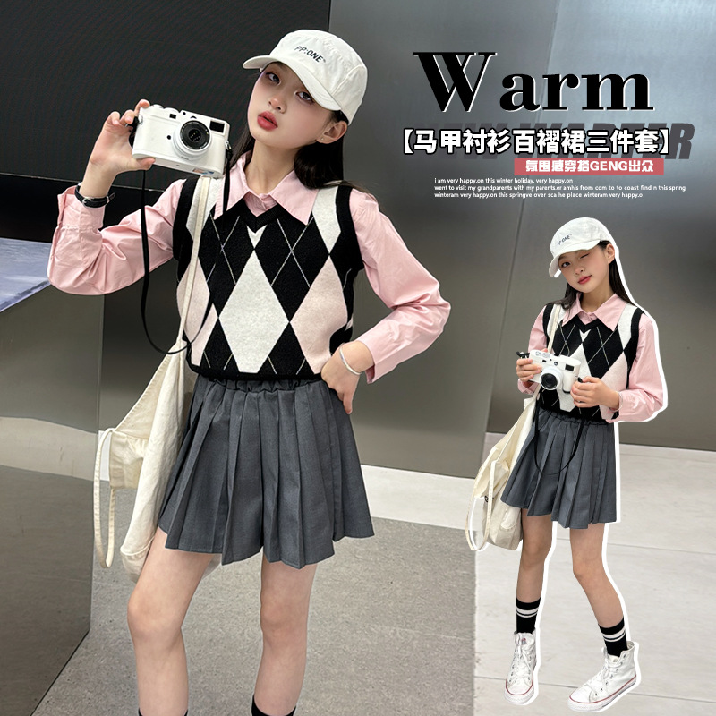 2024 봄 새 여자 치마 대학 스타일 한국식 스웨터 조끼 셔츠 주름 치마 3 피스 세트 패션스토어 가기