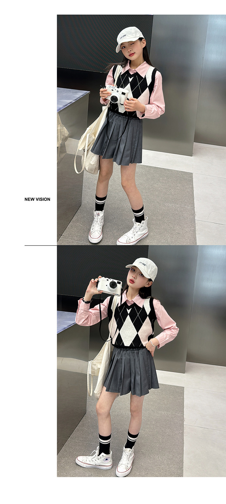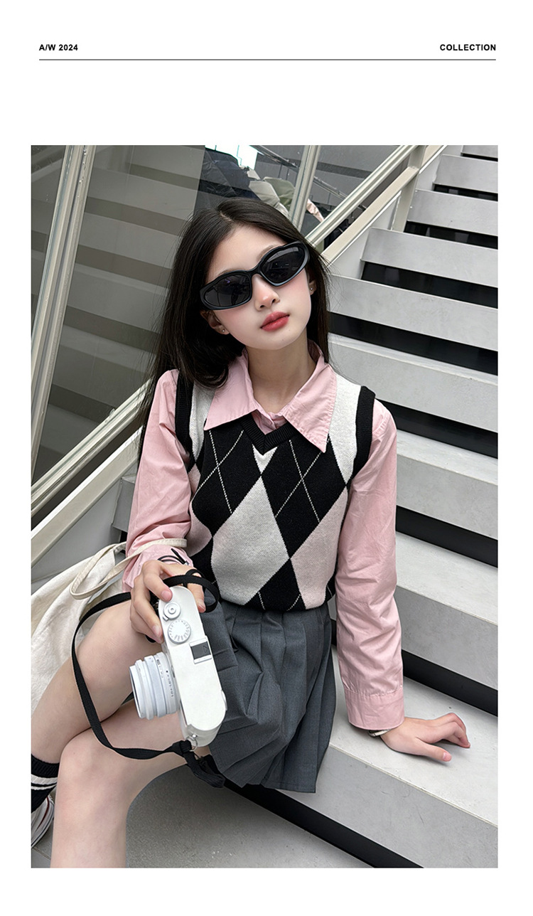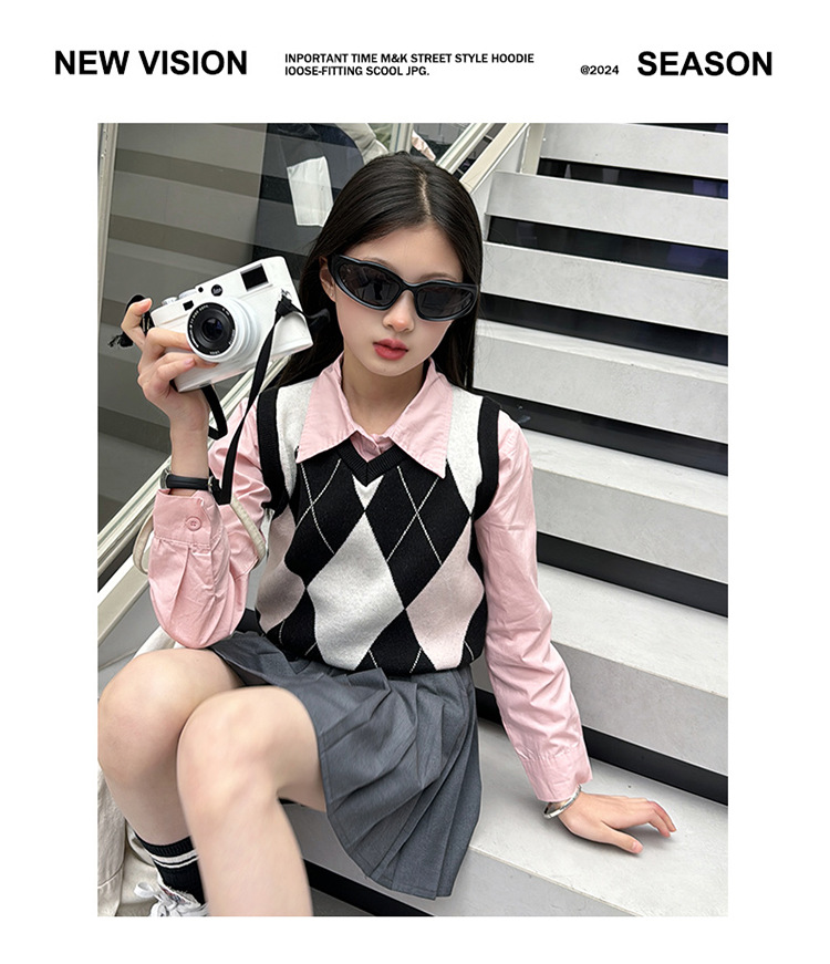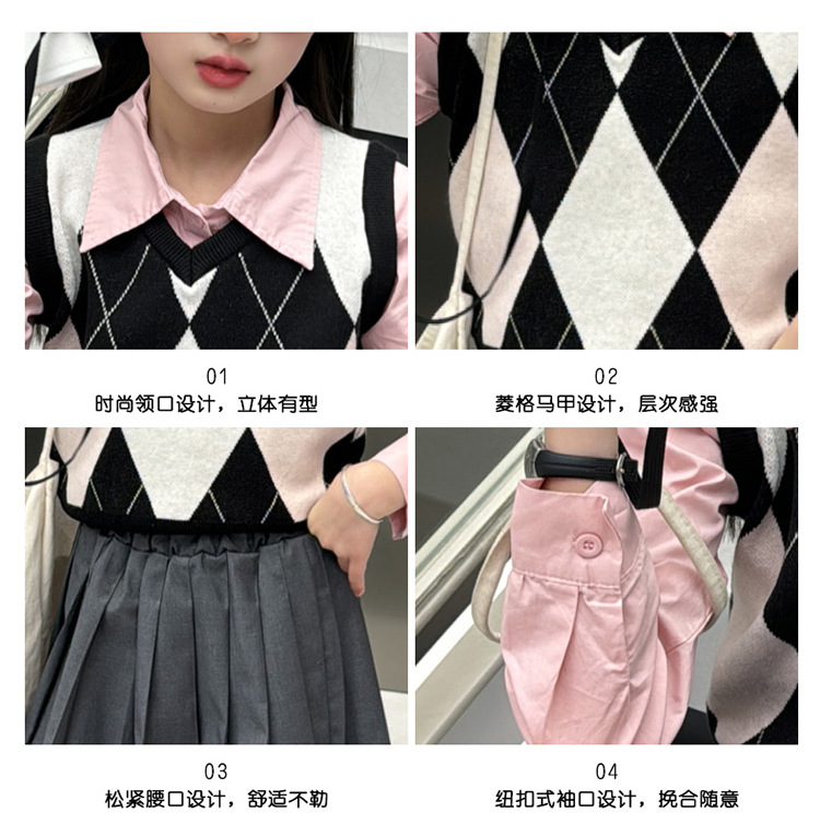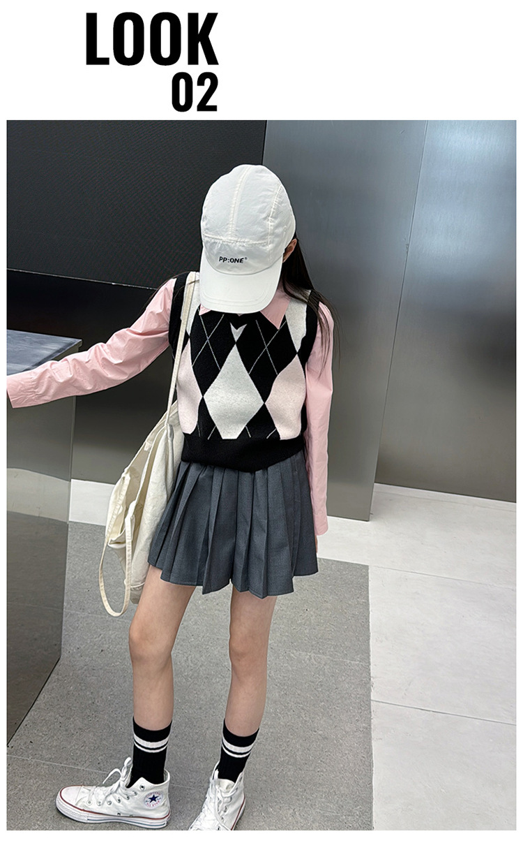 2024 봄 새 여자 치마 대학 스타일 한국식 스웨터 조끼 셔츠 주름 치마 3 피스 세트 패션스토어 가기