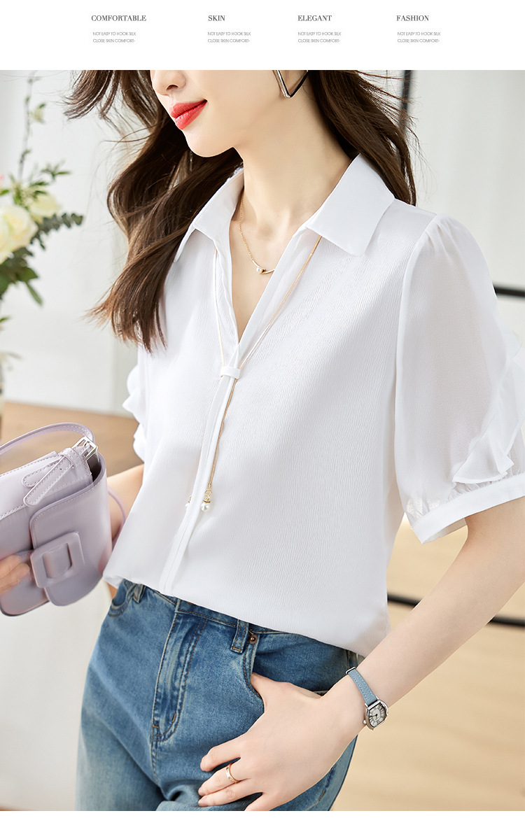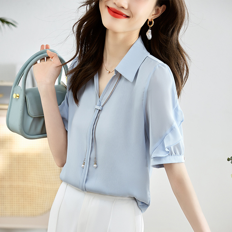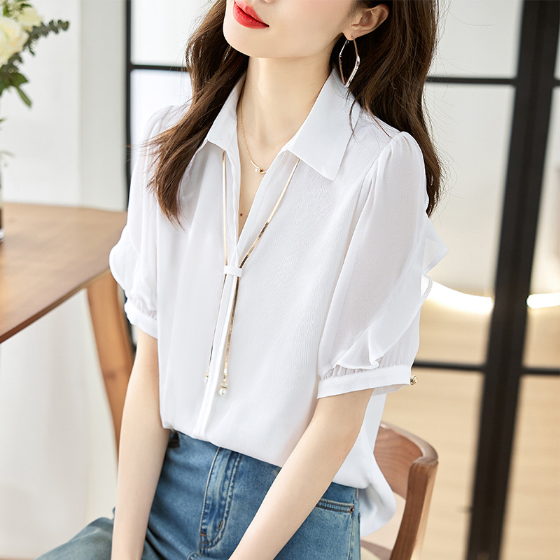 새틴 쉬폰 반팔 셔츠 여성 여름 디자인 감각 있는 새로운 패션 탑 프렌치 스타일 고급 셔츠