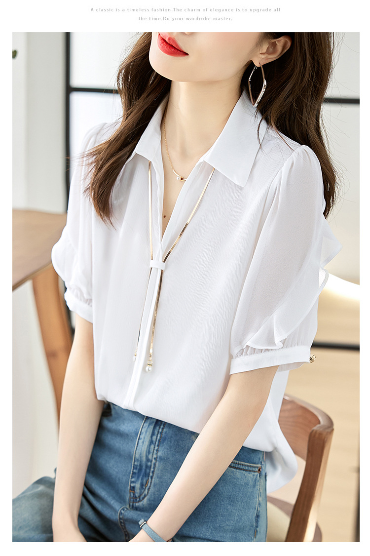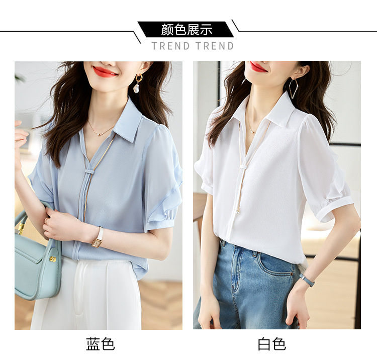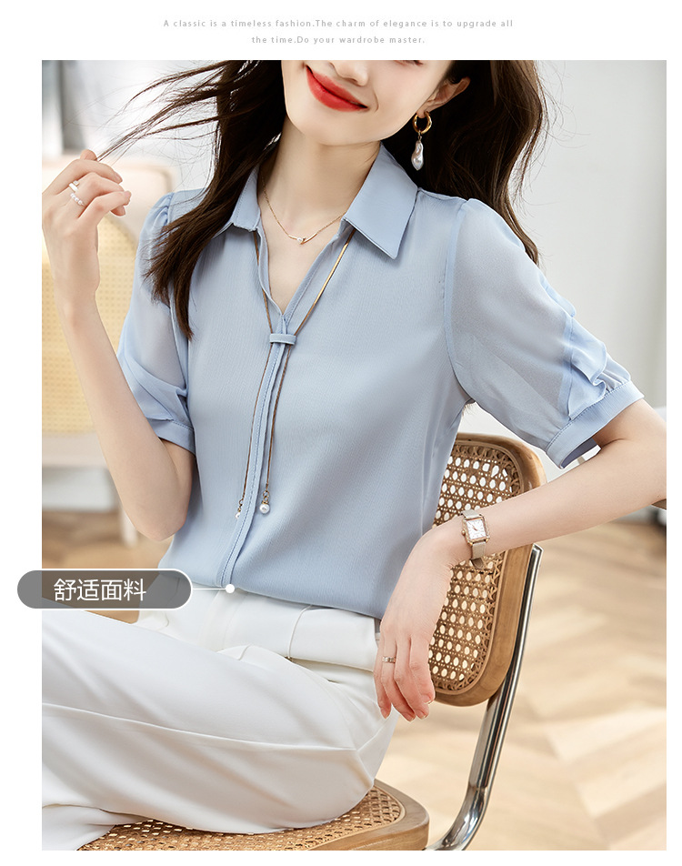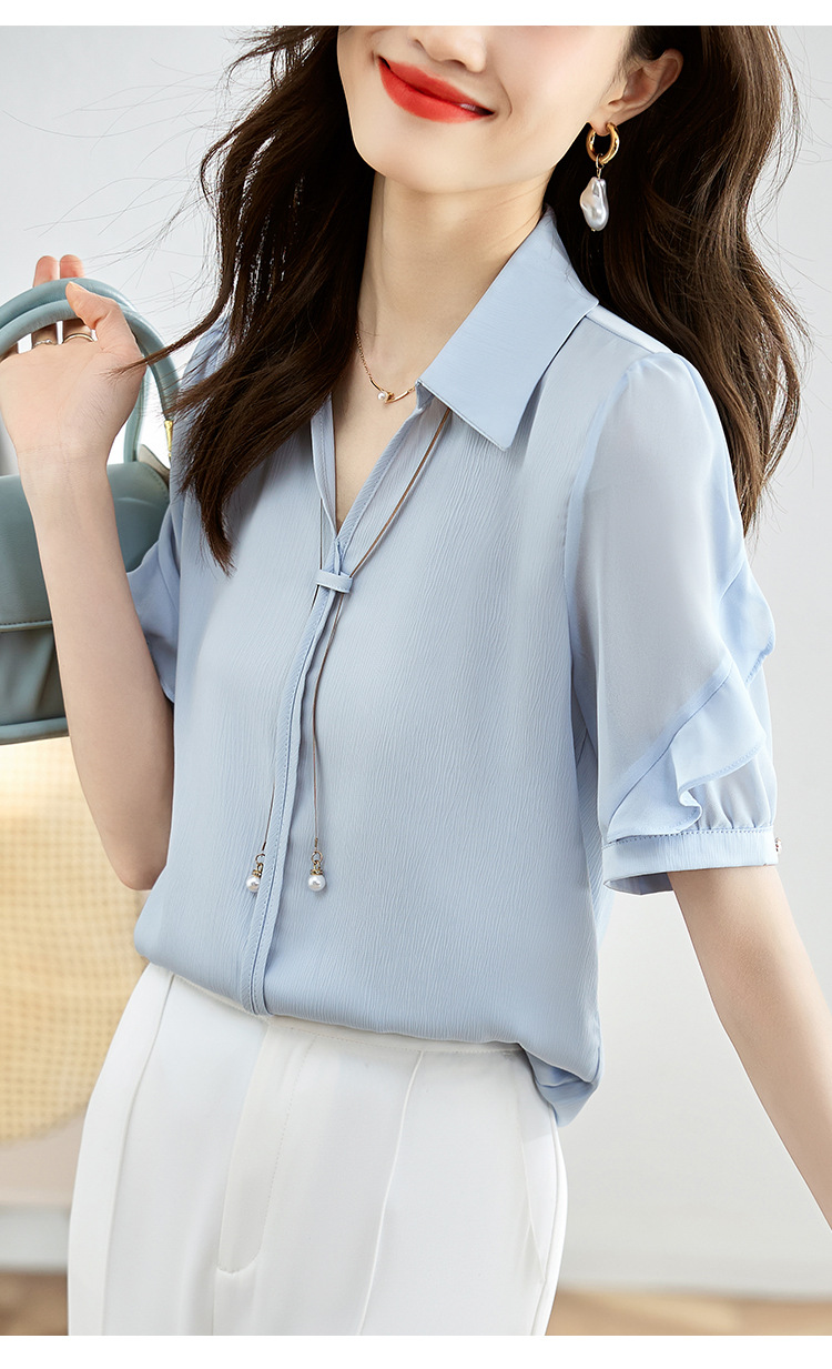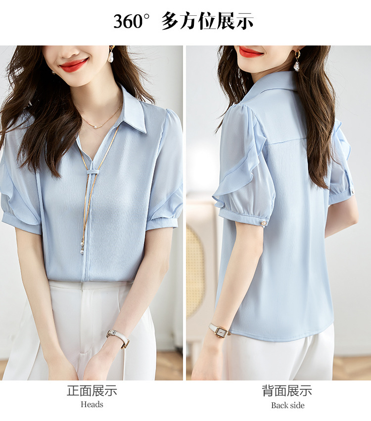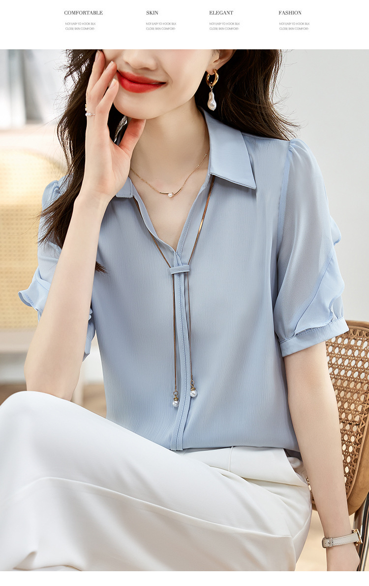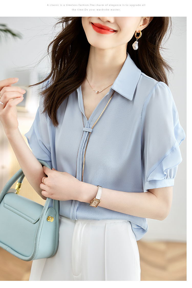 새틴 쉬폰 반팔 셔츠 여성 여름 디자인 감각 있는 새로운 패션 탑 프렌치 스타일 고급 셔츠스토어 가기