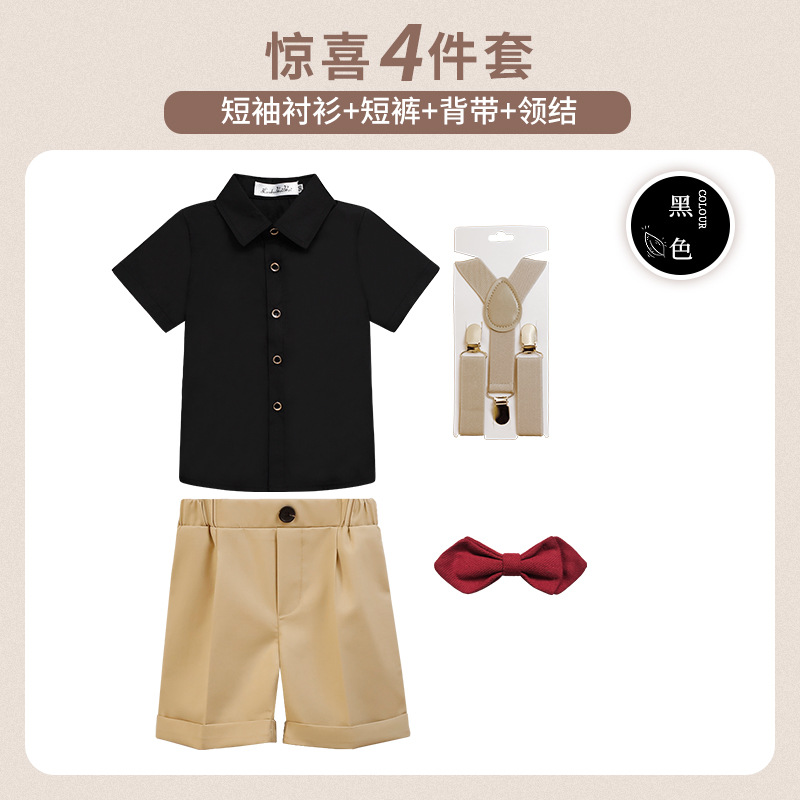 • 블랙 4 피스 세트 (주름 셔츠 반바지 + 스트랩 + Y9Y1 블랙 나비 넥타이)