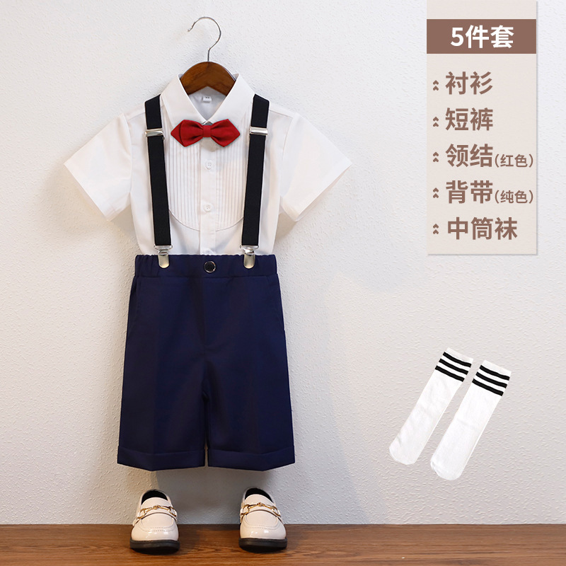 • 네이비 5 피스 세트 (주름 셔츠 반바지 스트랩 Y9Y3 빨간 나비 넥타이 흰색 튜브 양말)