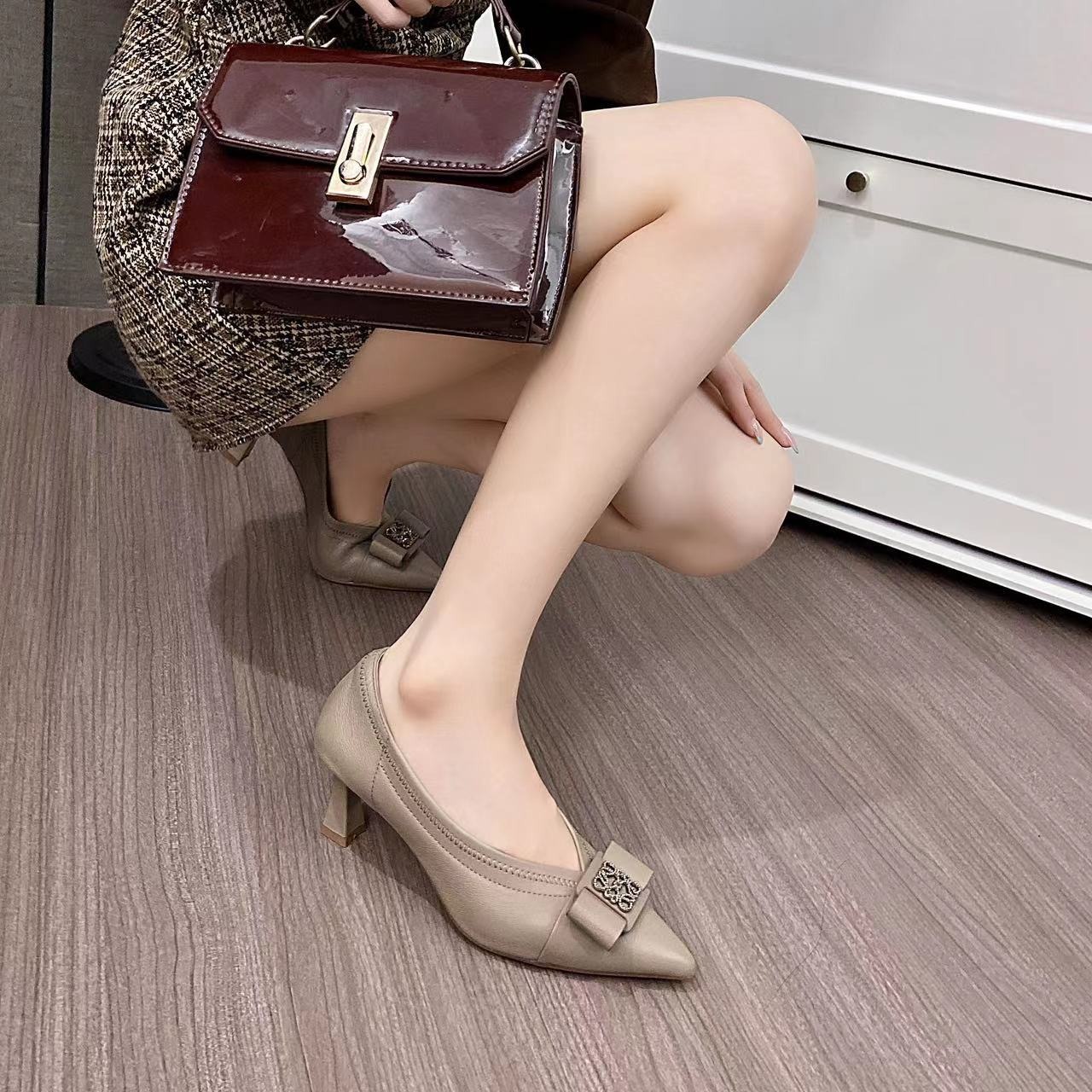 2025년 봄 신상 천연 가죽 고급 하이힐 여성용 슈즈, 1층 소가죽 뾰족코 패션 두꺼운 굽 여성화스토어 가기