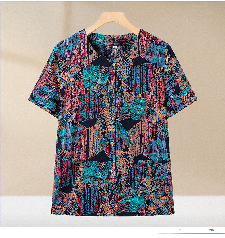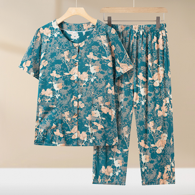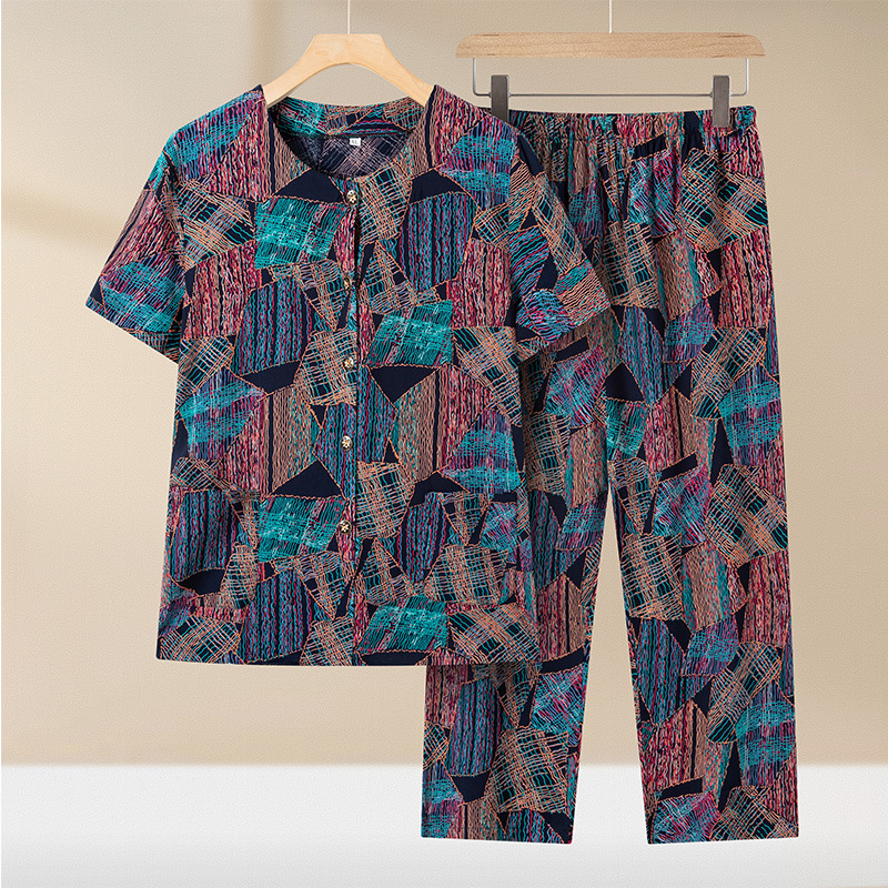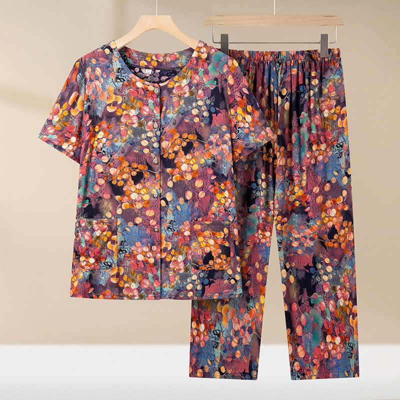 중년 및 노인 여성 어머니의 면화 실크 세트 할머니 카디건 짧은 소매 인공면 파자마 늙은면 실크 투피스 세트