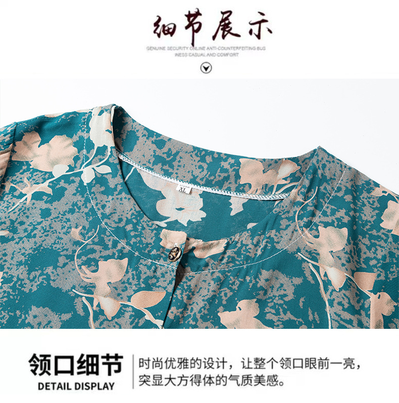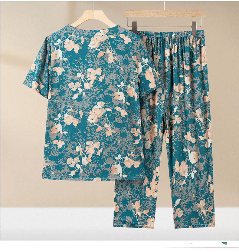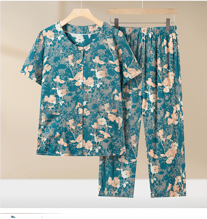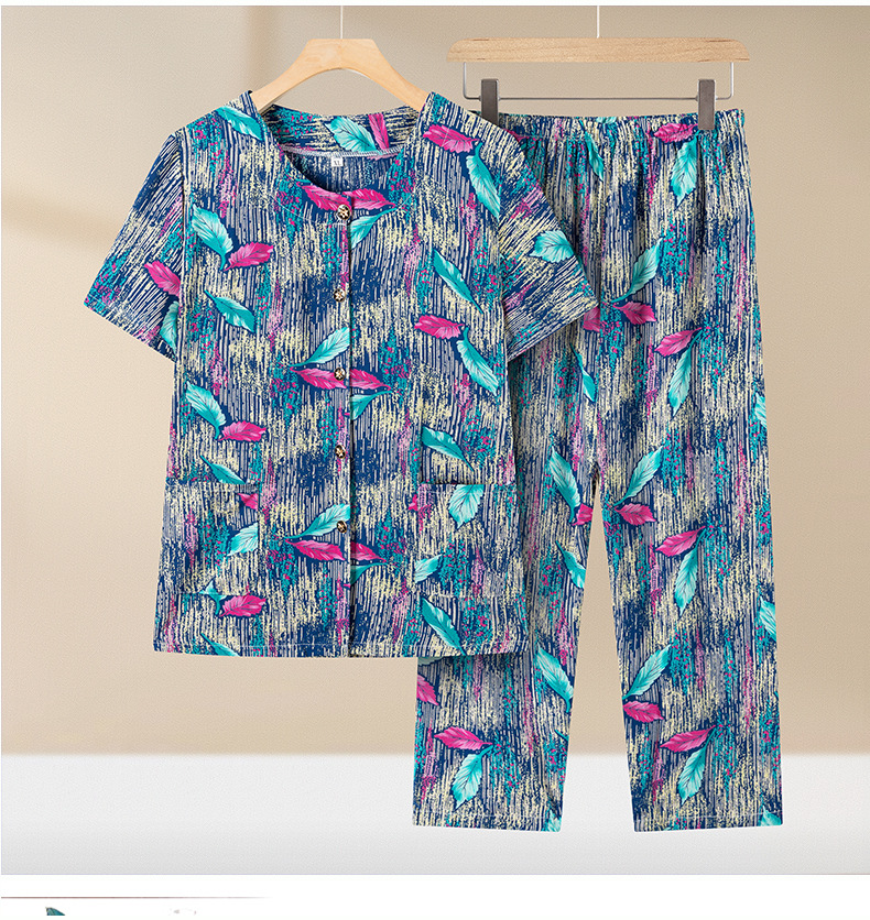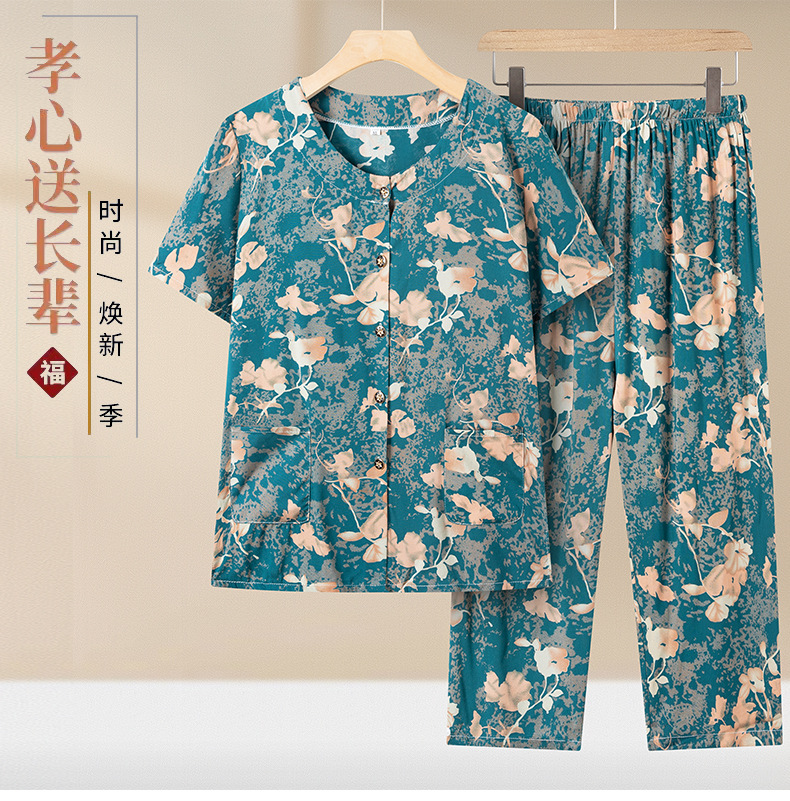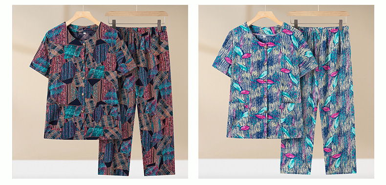 중년 및 노인 여성 어머니의 면화 실크 세트 할머니 카디건 짧은 소매 인공면 파자마 늙은면 실크 투피스 세트스토어 가기