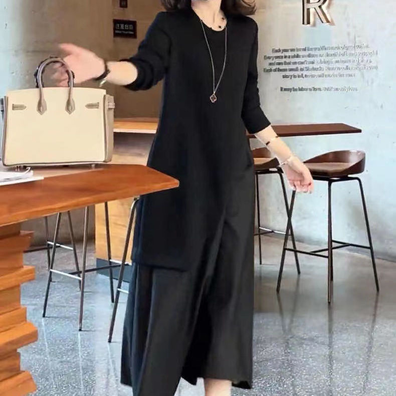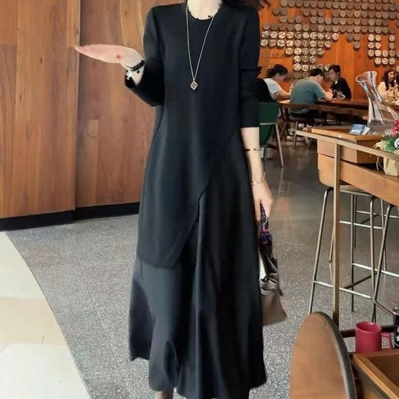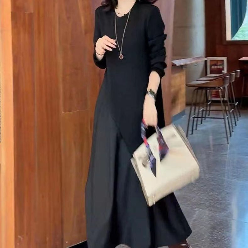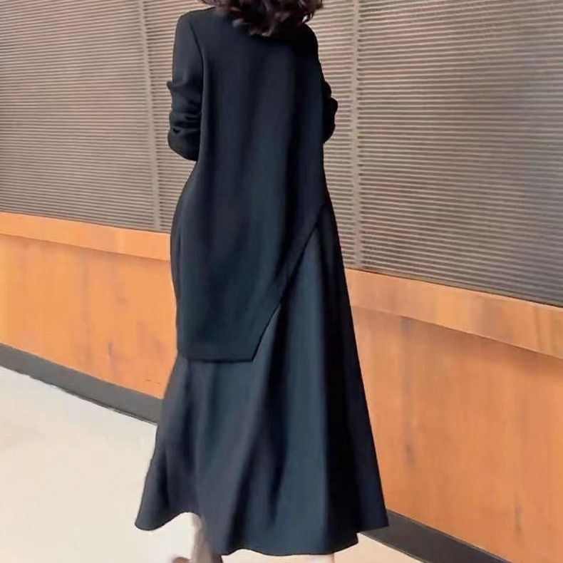 여성을위한 프랑스어 스티치 가짜 투피스 드레스 2024 봄 새로운 느슨한 슬림 리틀 블랙 드레스 패션 플러스 사이즈 여성 의류