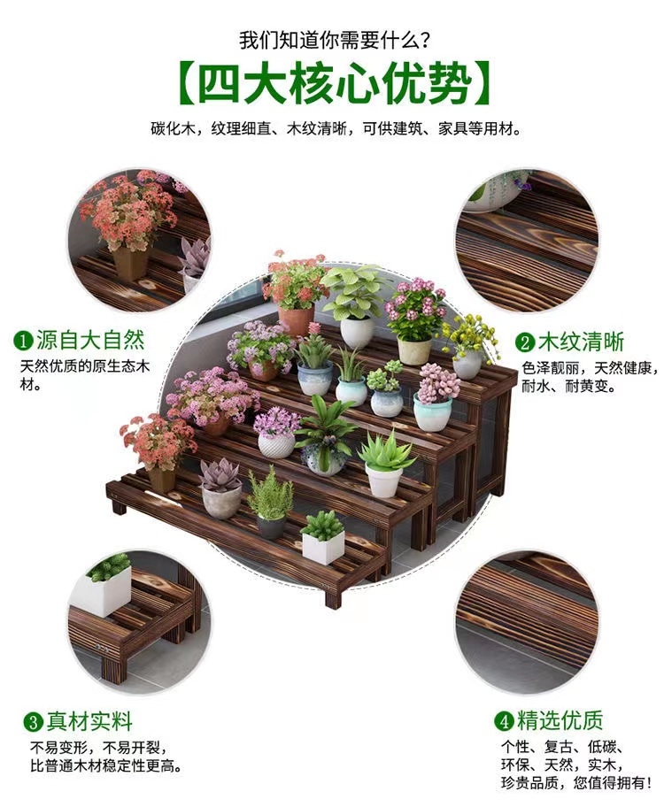 꽃 랙 저장 랙 단단한 나무 탄화 사다리 다층 발코니 바닥 미끄럼 방지 나무 실내 야외 녹색 꽃 냄비 Beiqin스토어 가기