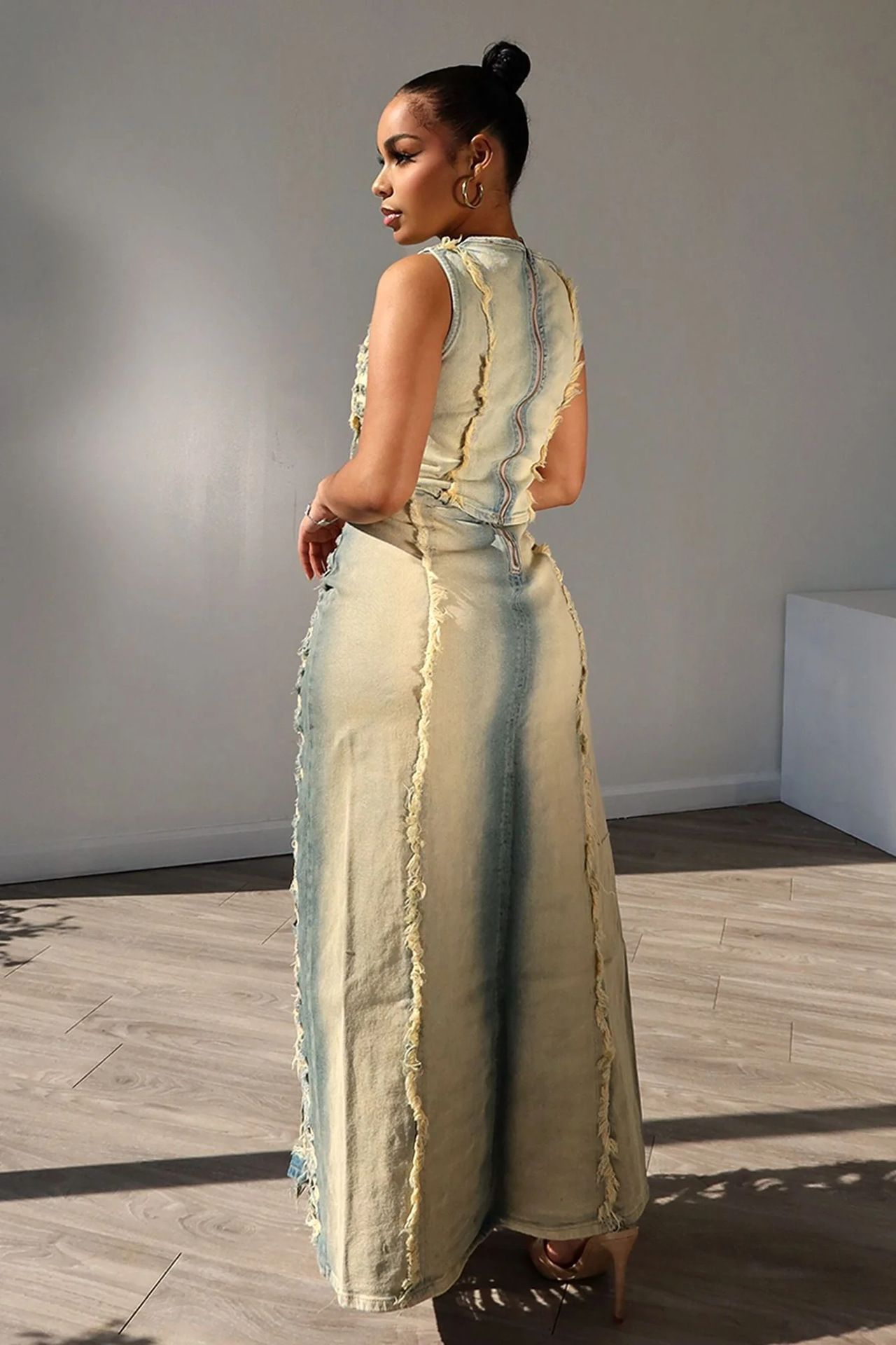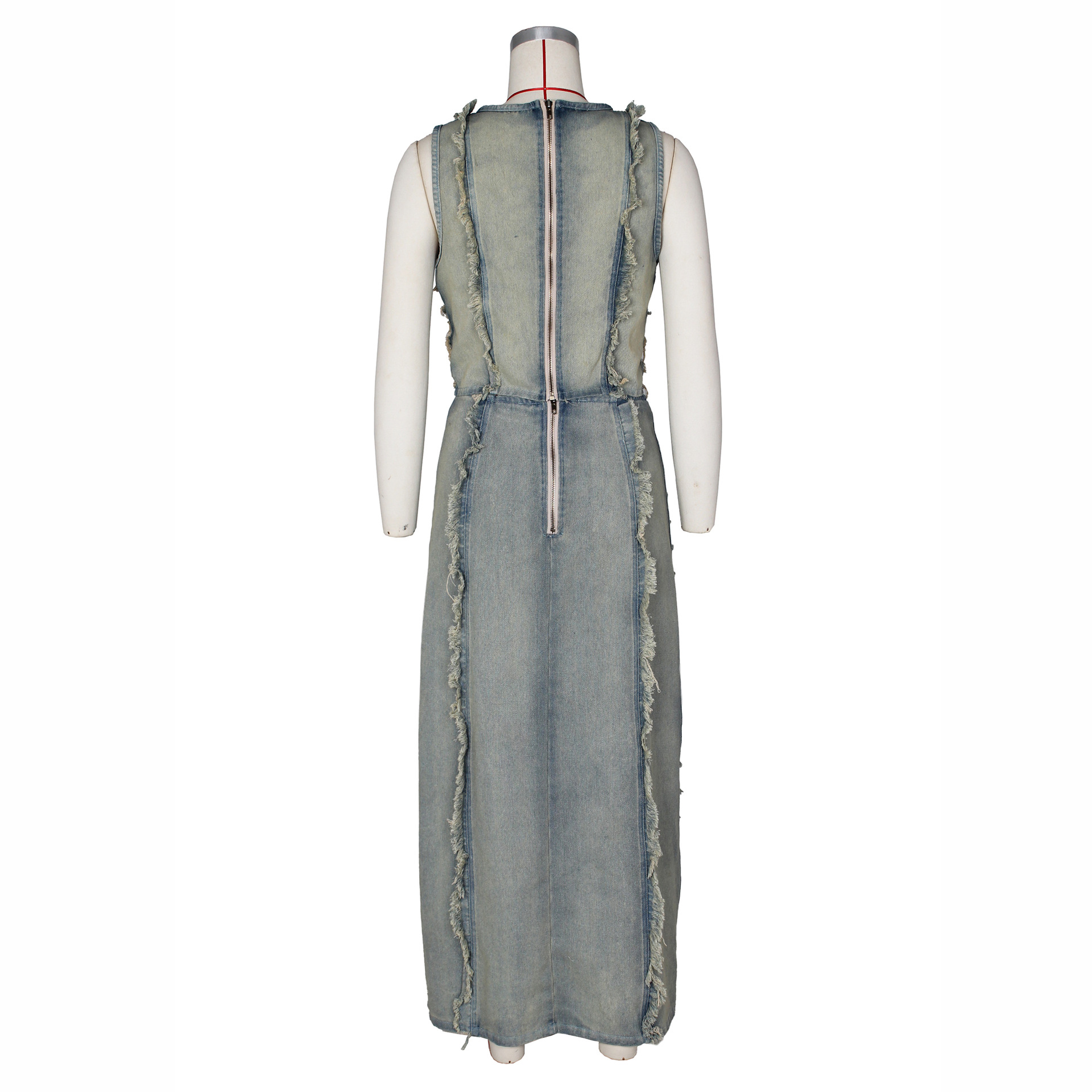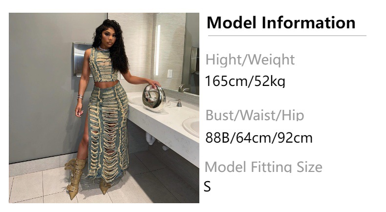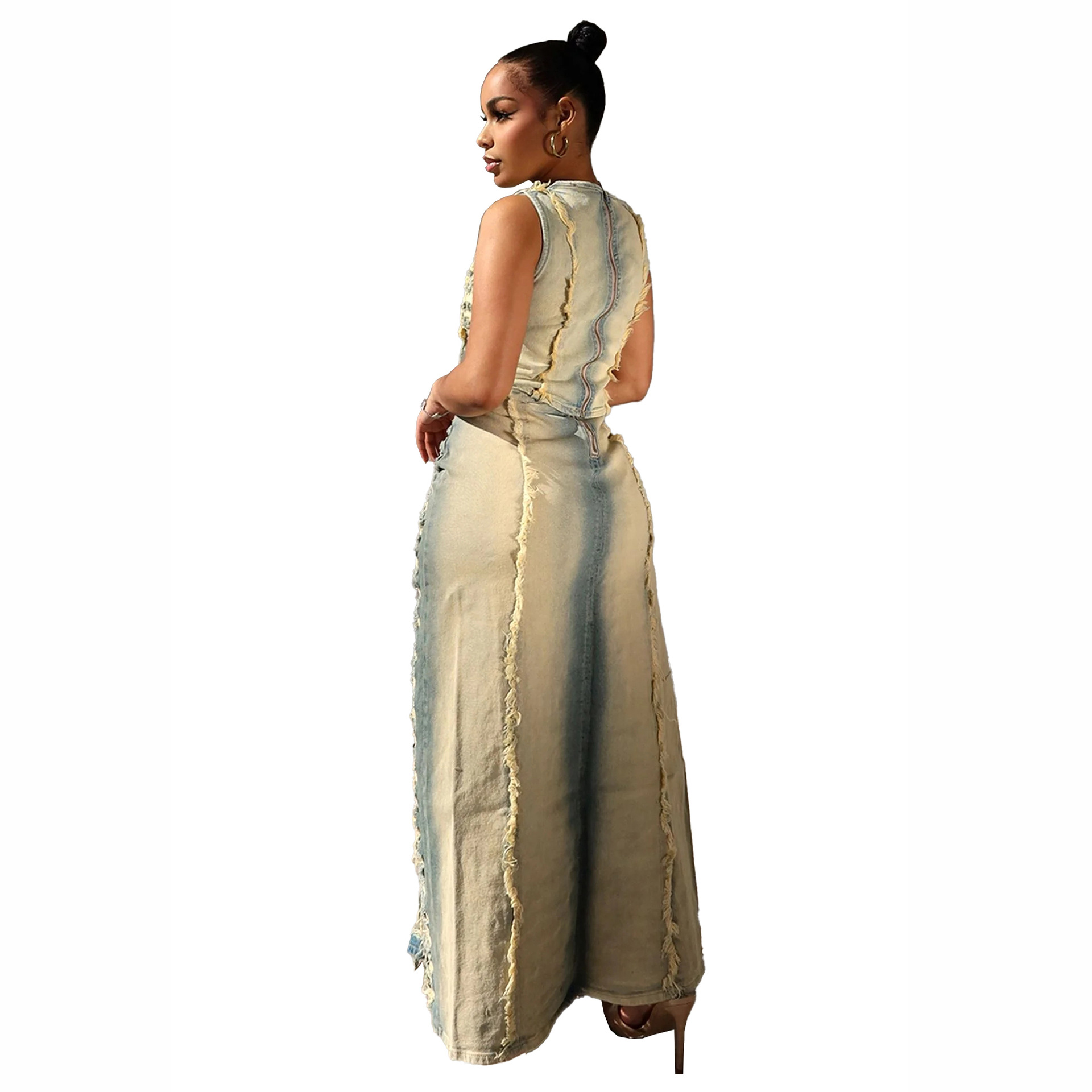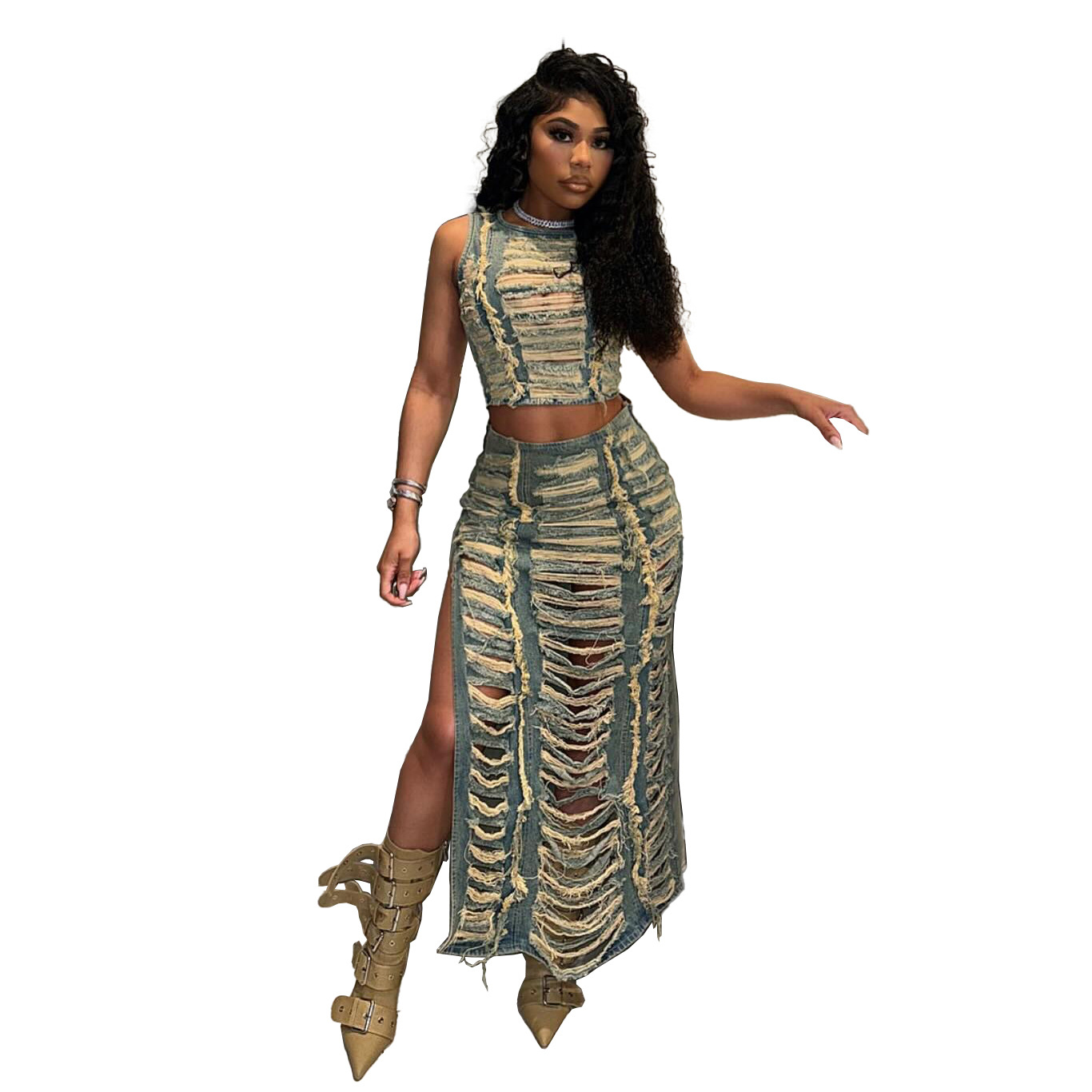 유럽 및 미국 여성 데님 세트 국경 간 여성 패션 성격 손 착용 조끼 하이 슬릿 데님 스커트 세트스토어 가기