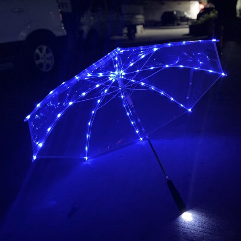 LED灯光伞除了能当作普通雨伞使用外,更是一款功能伞,手柄底部的LED灯发光能当手电筒使用,外观美丽。内置一个小型的LED防水装置,伞骨发光及LED手电筒能在黑夜中照亮整个伞下的空间,能保证雨夜中行人的安全。