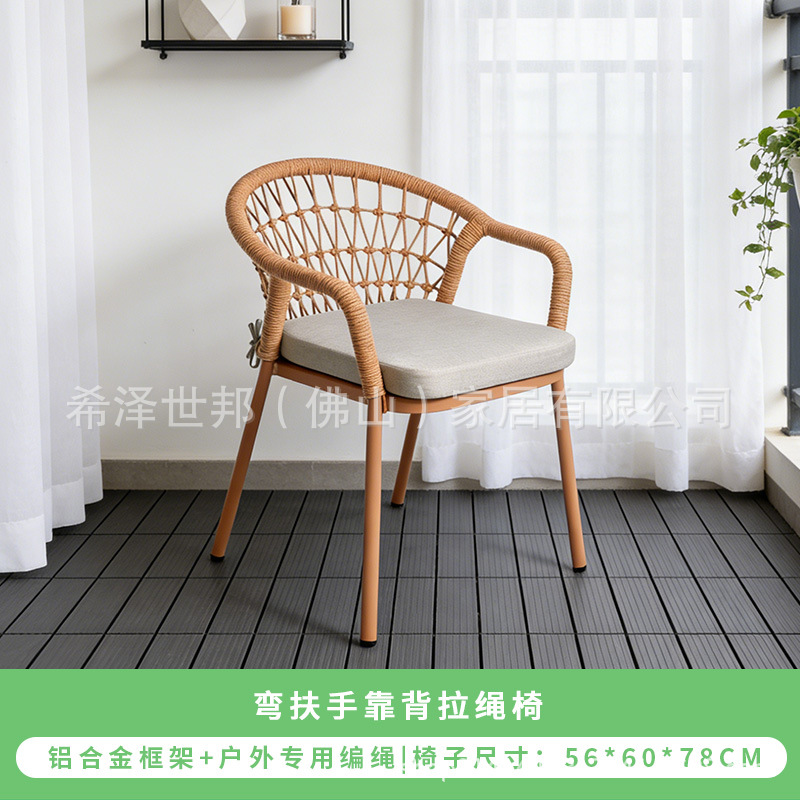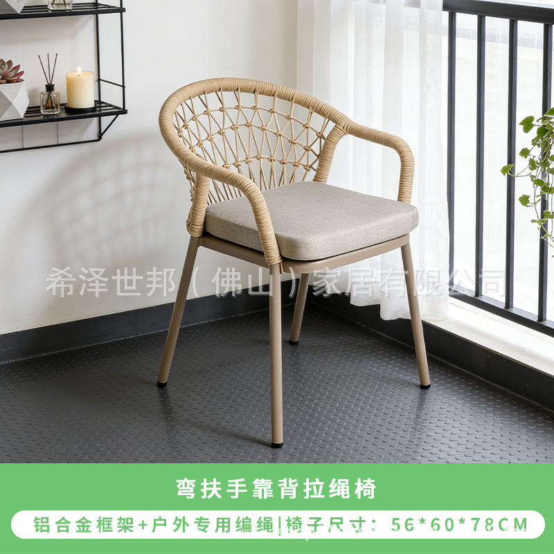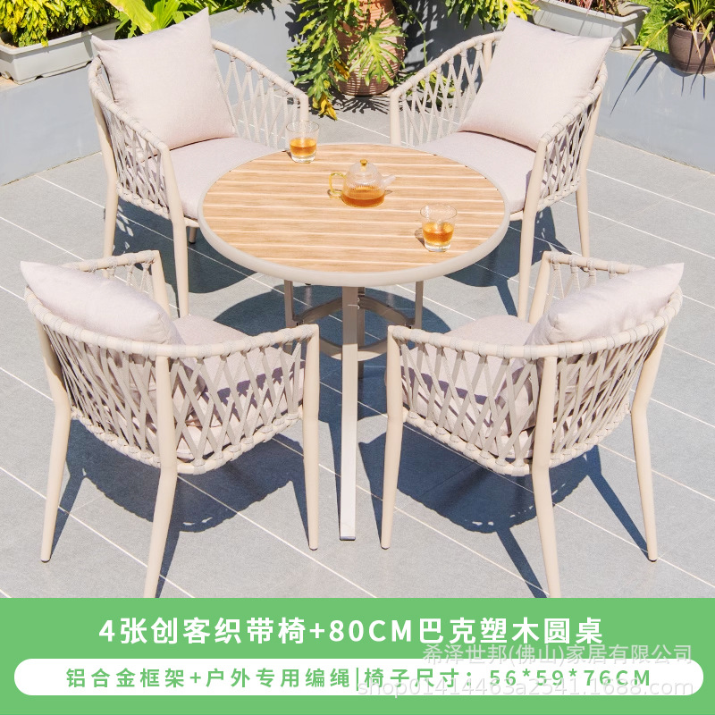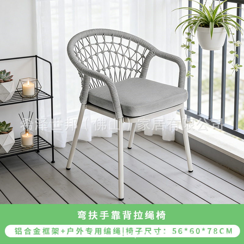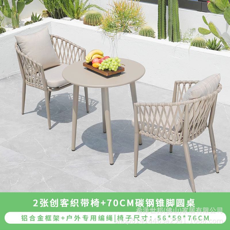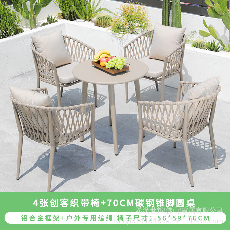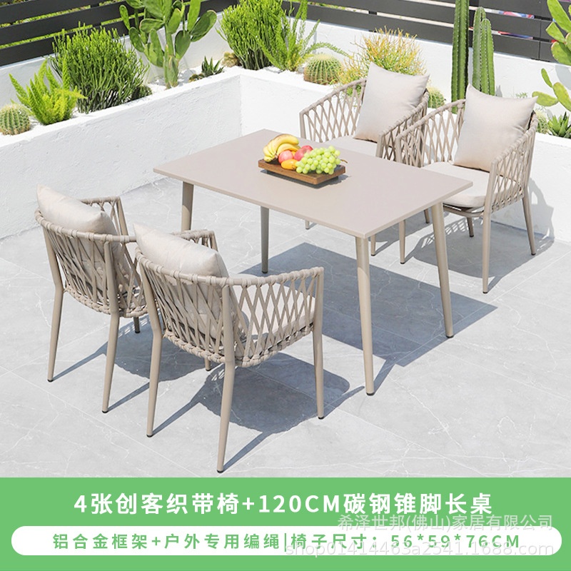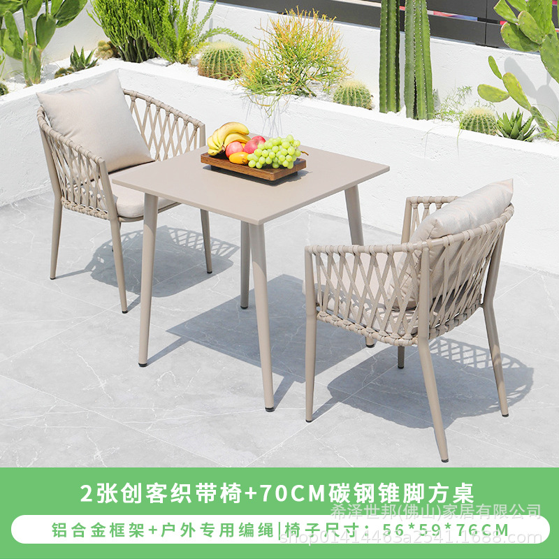 야외 맞춤형 가정용 발코니 식탁 의자, 북유럽 스타일 등받이가 있는 레저 레스토랑 알루미늄 프레임 끈으로 엮은 테이블과 의자