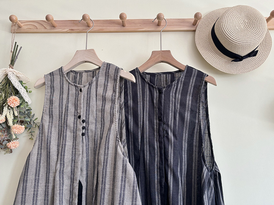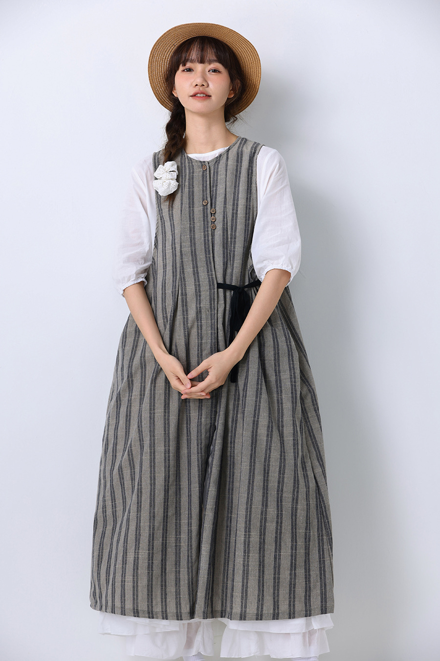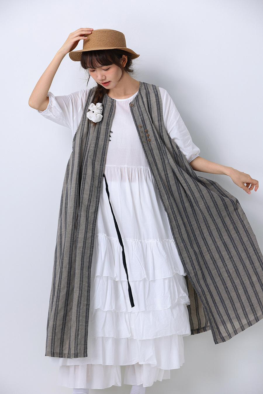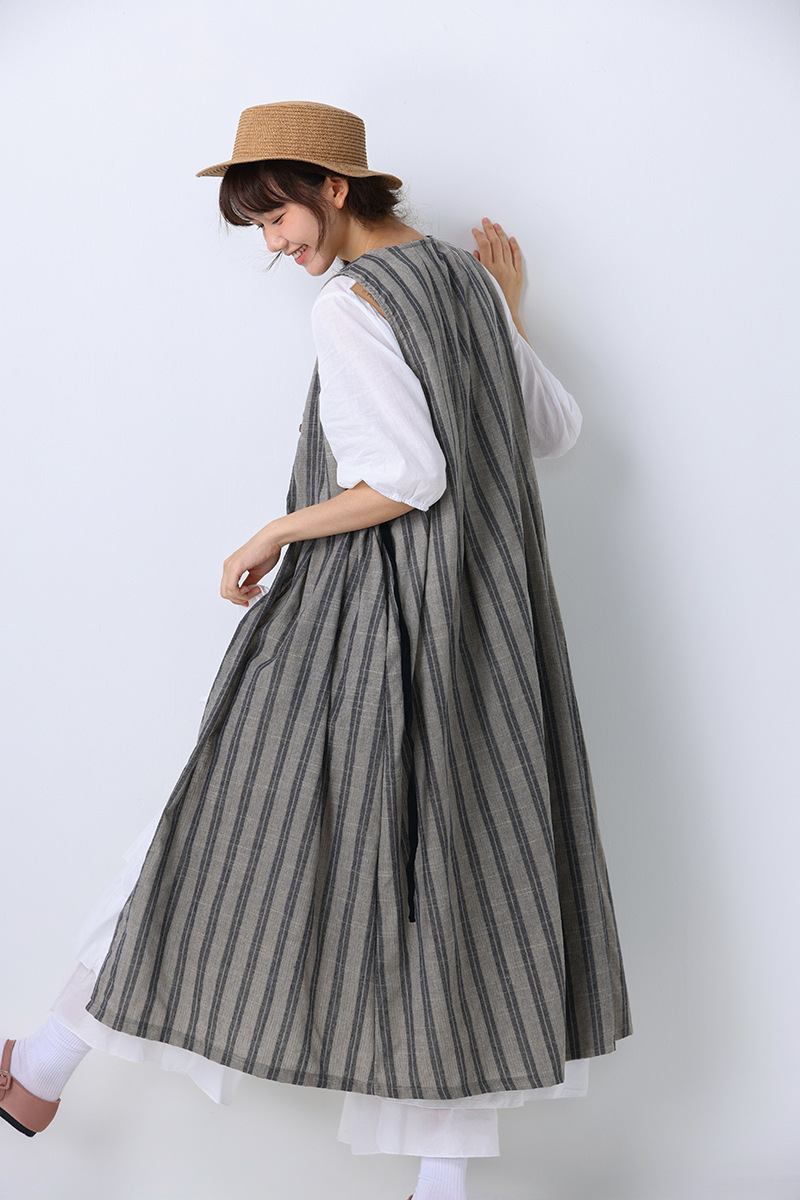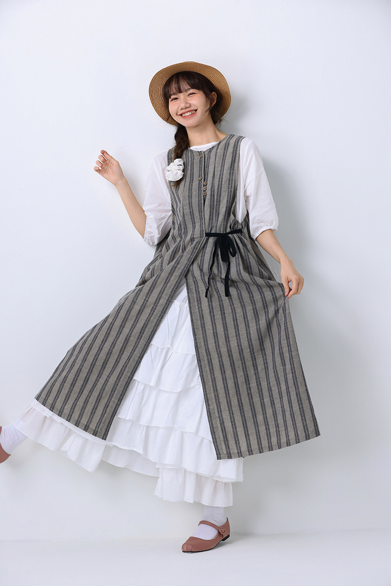 모리 소녀 일본식 여성용 달콤한 올 매치 느슨한 세로 스트라이프 긴 스트랩 아우터웨어 2024 여름 새로운 리넨 웨이스트 코트 조끼스토어 가기