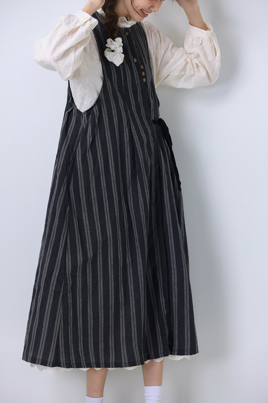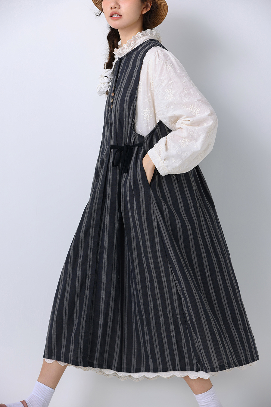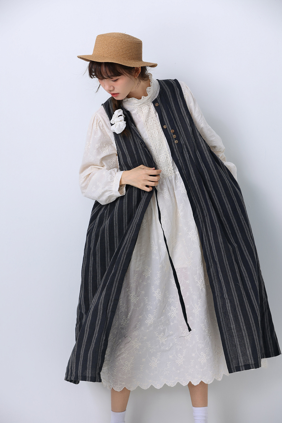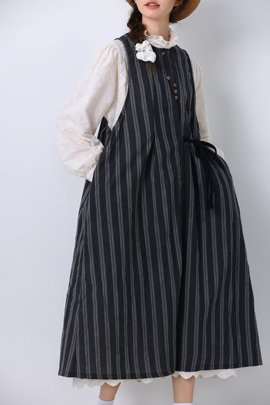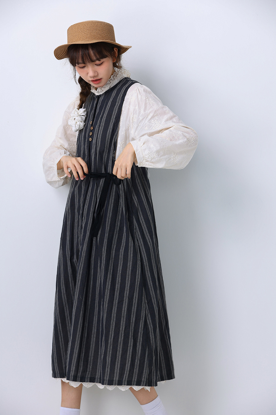 모리 소녀 일본식 여성용 달콤한 올 매치 느슨한 세로 스트라이프 긴 스트랩 아우터웨어 2024 여름 새로운 리넨 웨이스트 코트 조끼스토어 가기