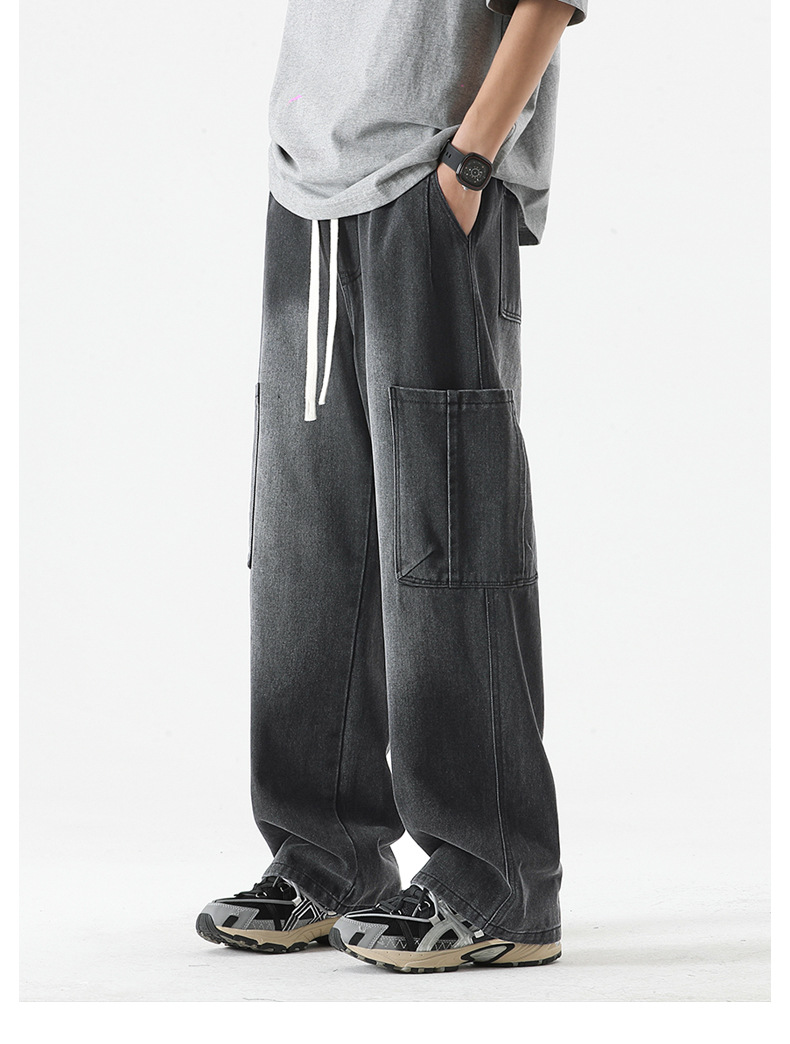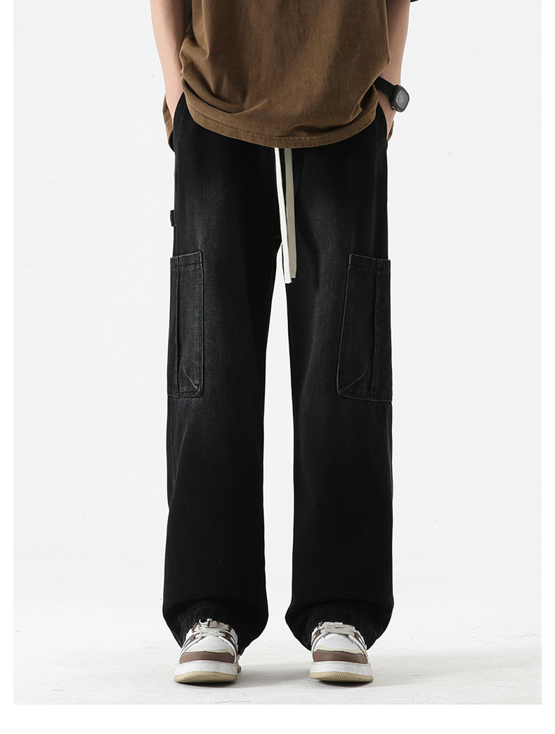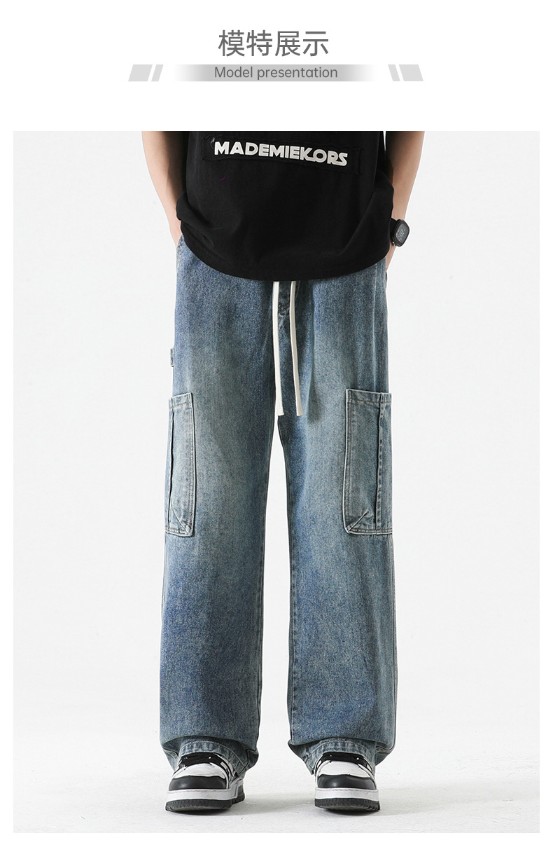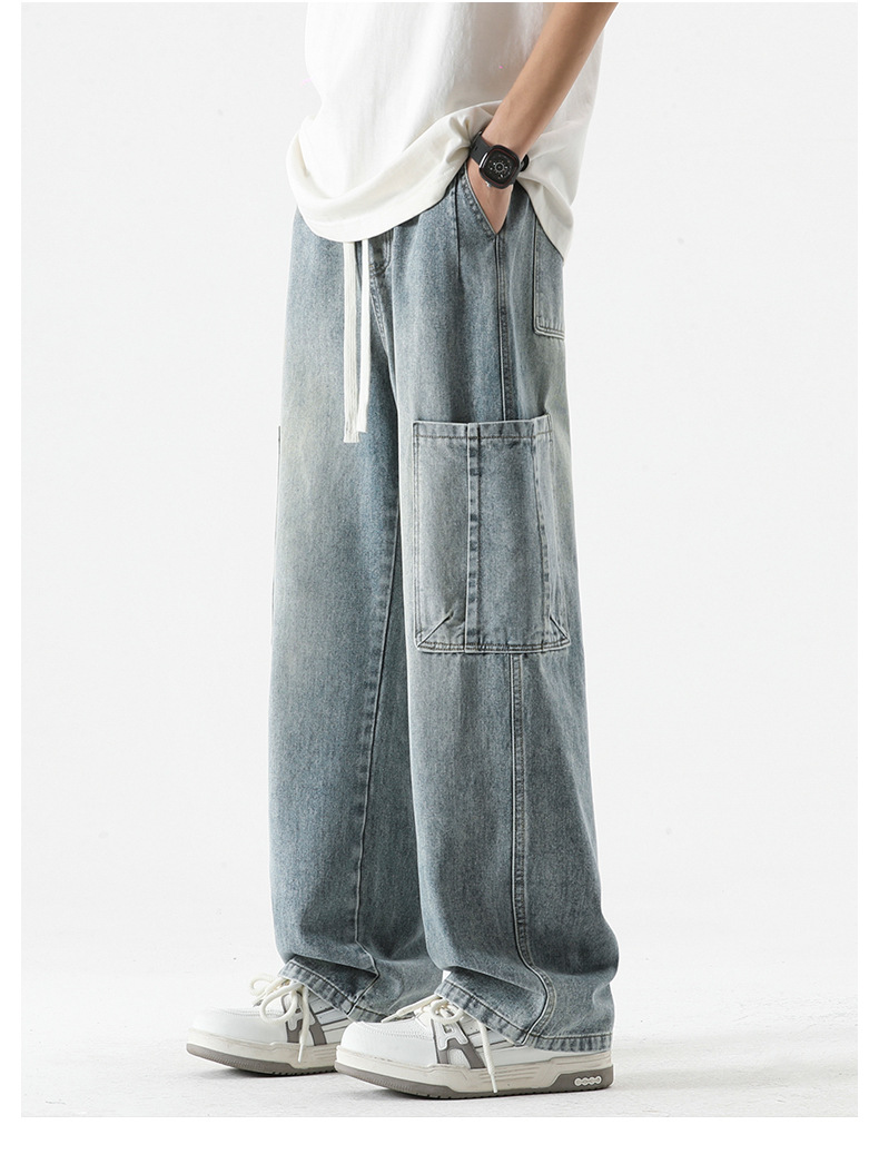 레트로 작업복 청바지 남성용 느슨한 스트레이트 바지 여름 2024 새로운 패션 브랜드 drawstring 남성용 와이드 레그 바지