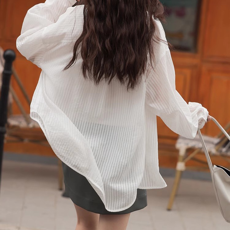 1313 가볍고 통기성이 뛰어난 질감 58% 텐셀 스트라이프 화이트 셔츠 2025 여름 여성 루즈 탑 자외선 차단 셔츠스토어 가기