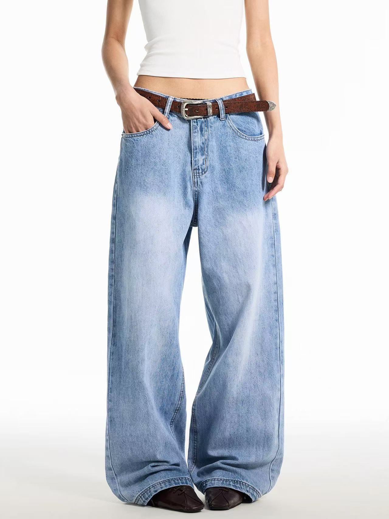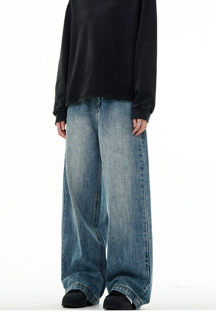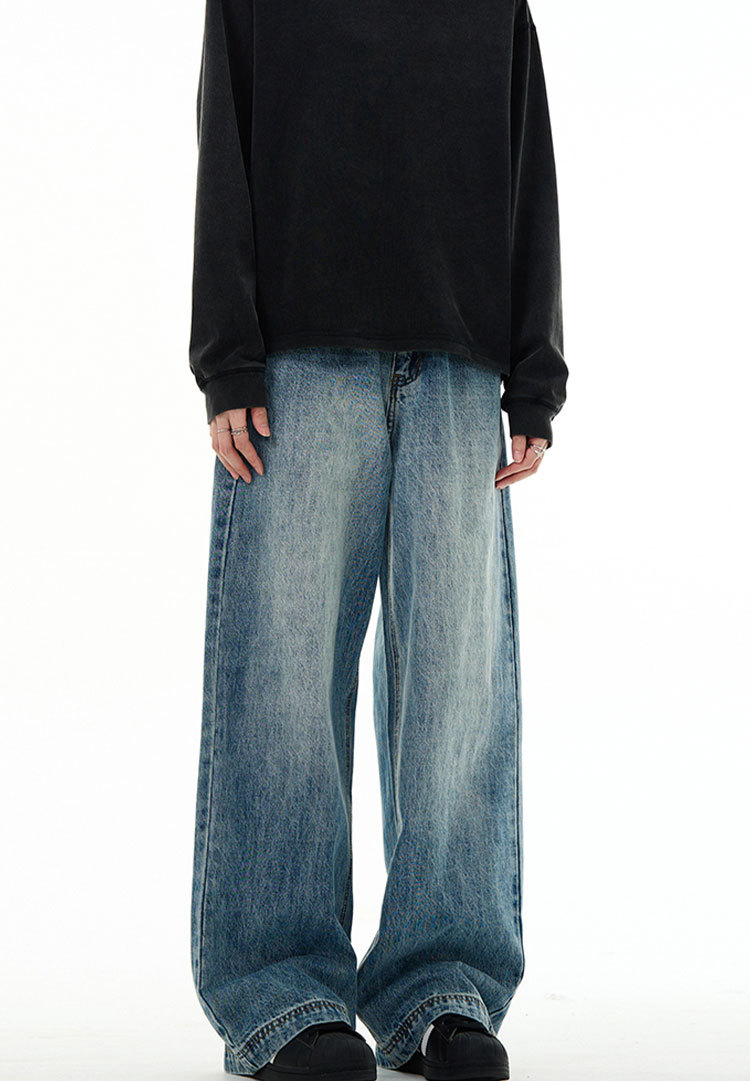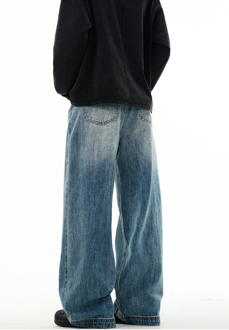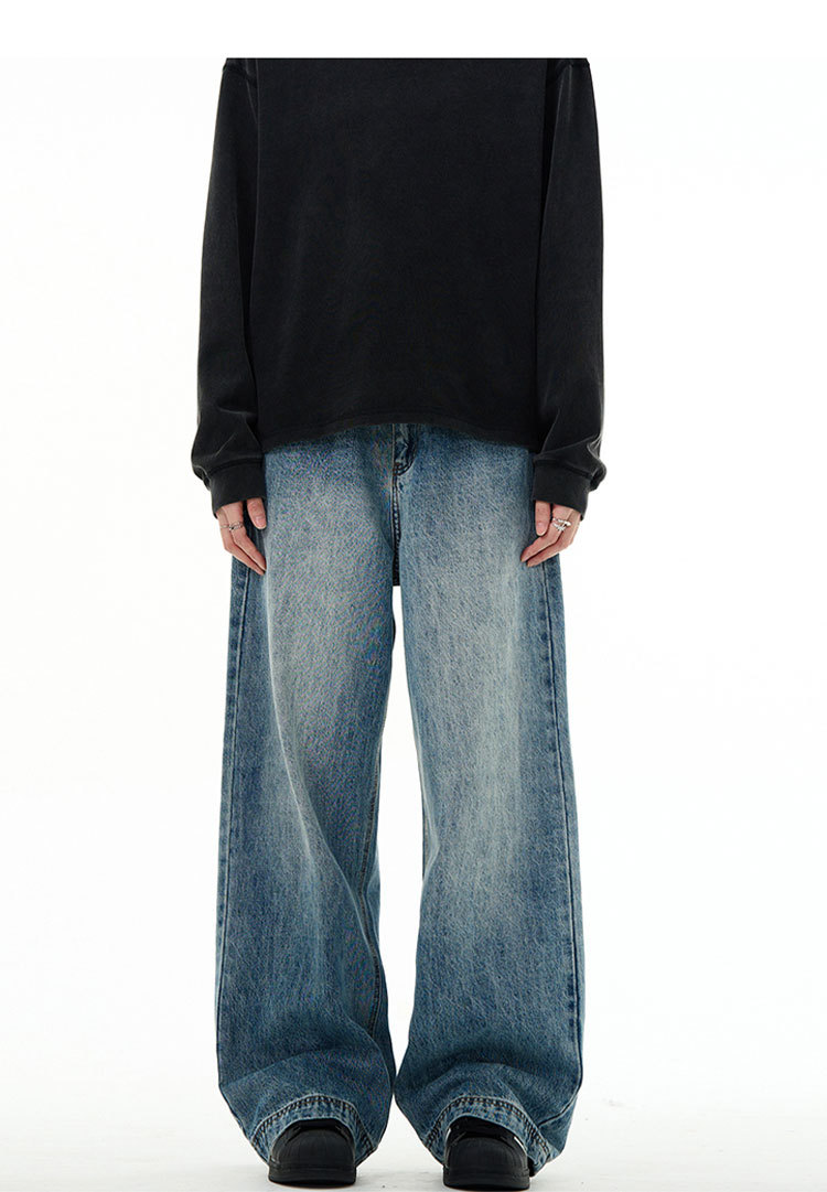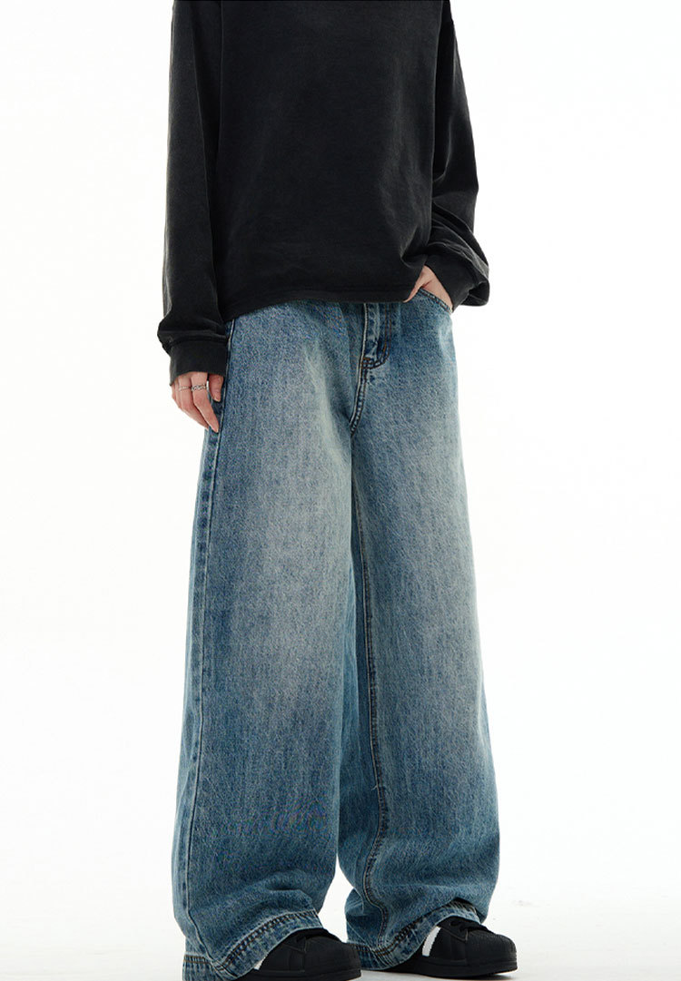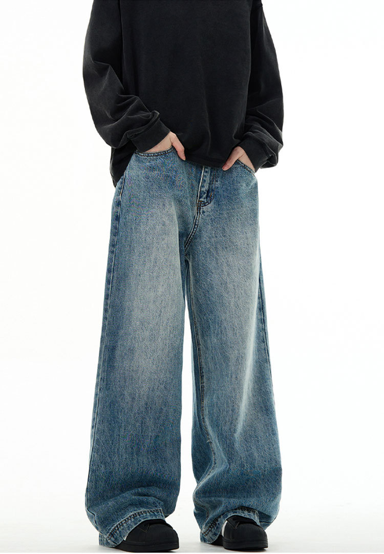 새로운 복고풍 세척 클린 핏 블루 스트레이트 청바지 패션 브랜드 남성 미국 와이드 레그 다용도 캐주얼 바지