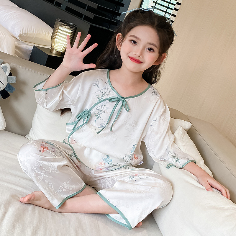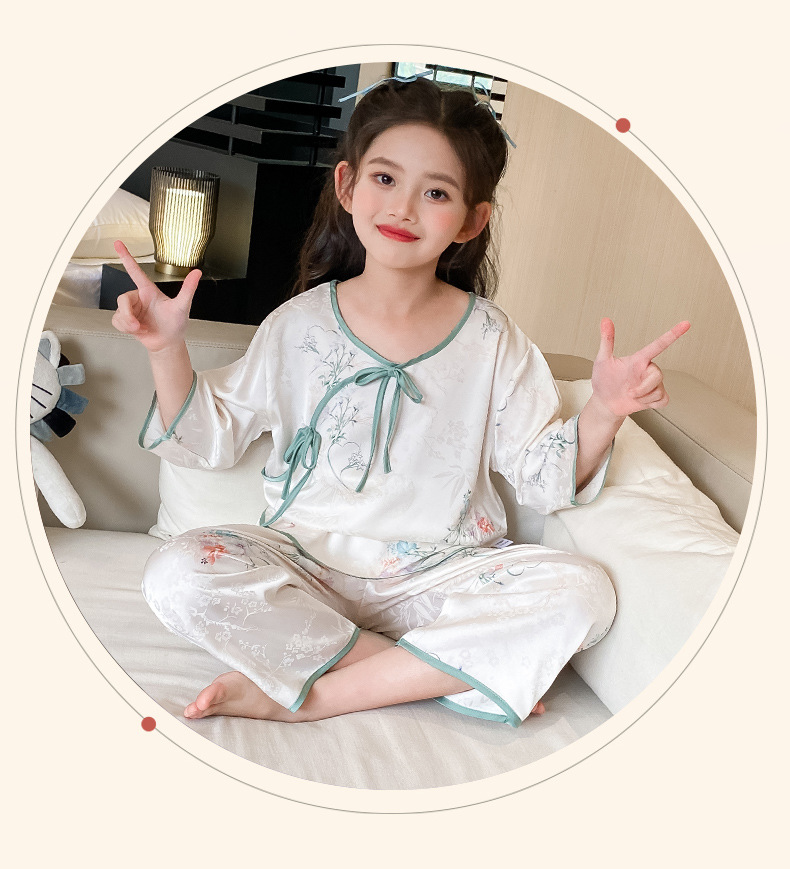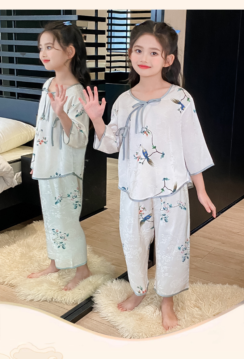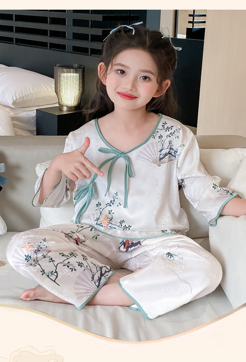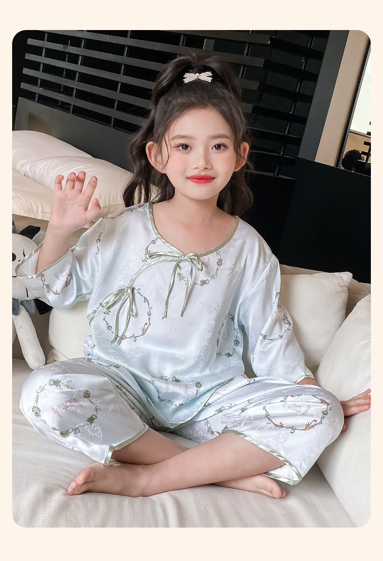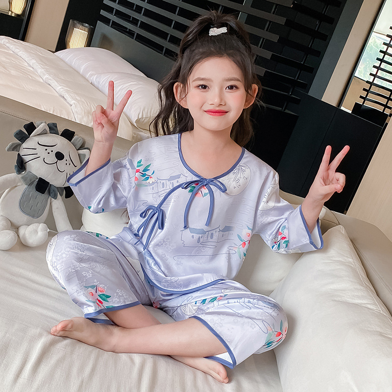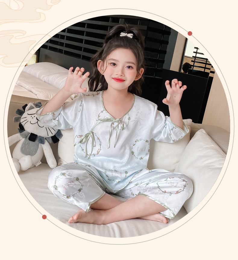 소녀의 여름 얇은 중국 스타일 잠옷 어린이 아이스 실크 반소매 홈 착용 세트 여름 에어컨 옷 투피스 세트