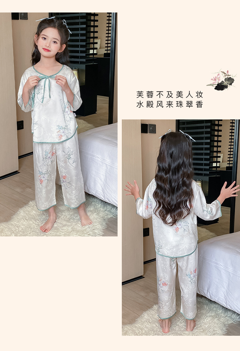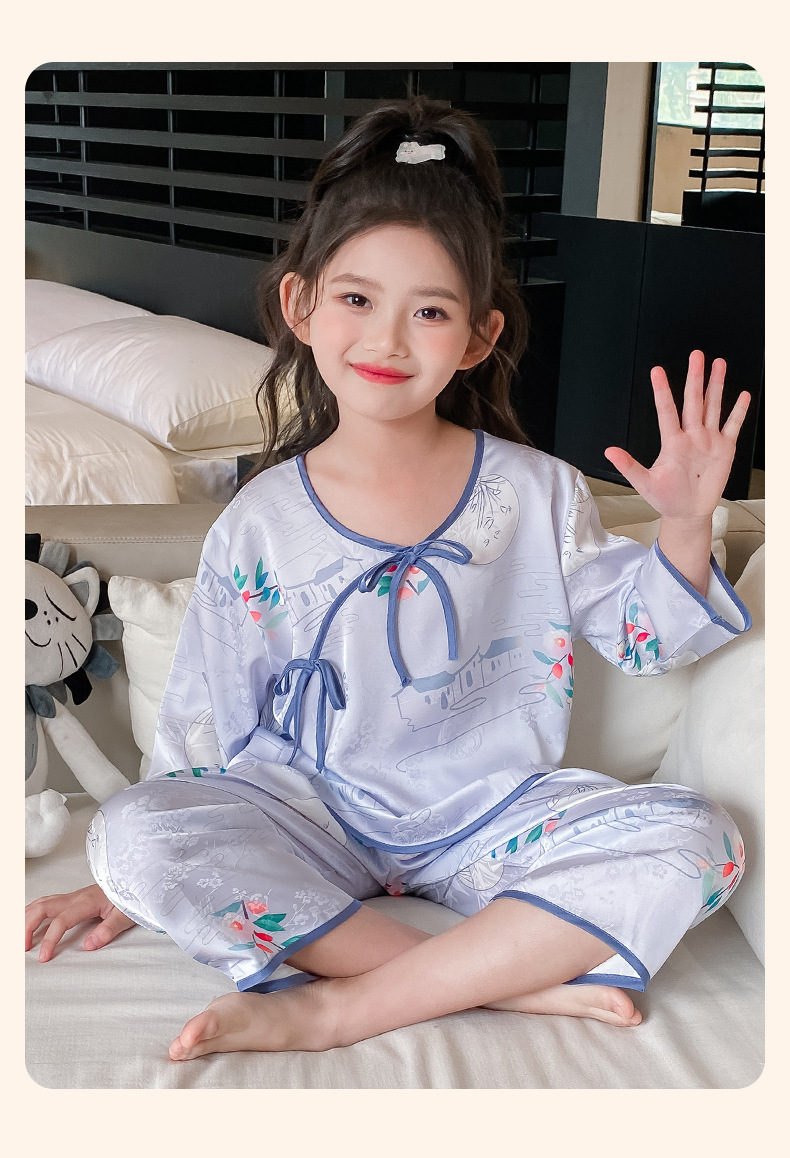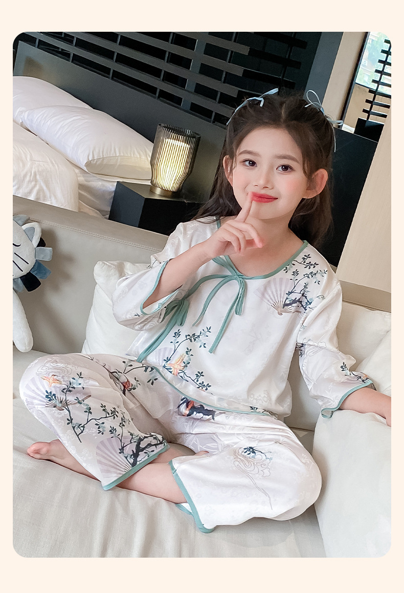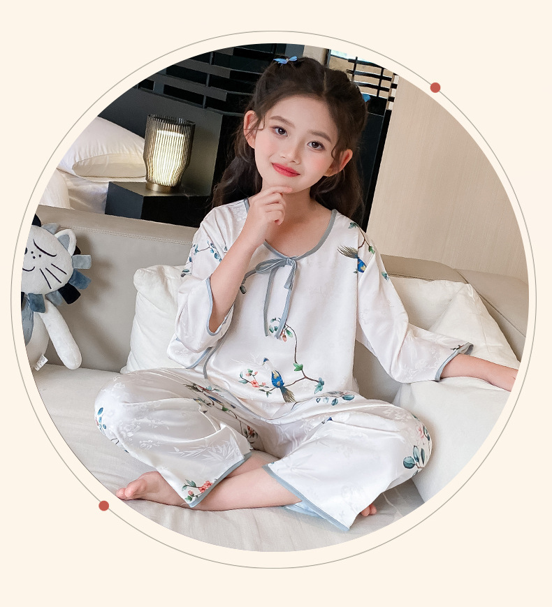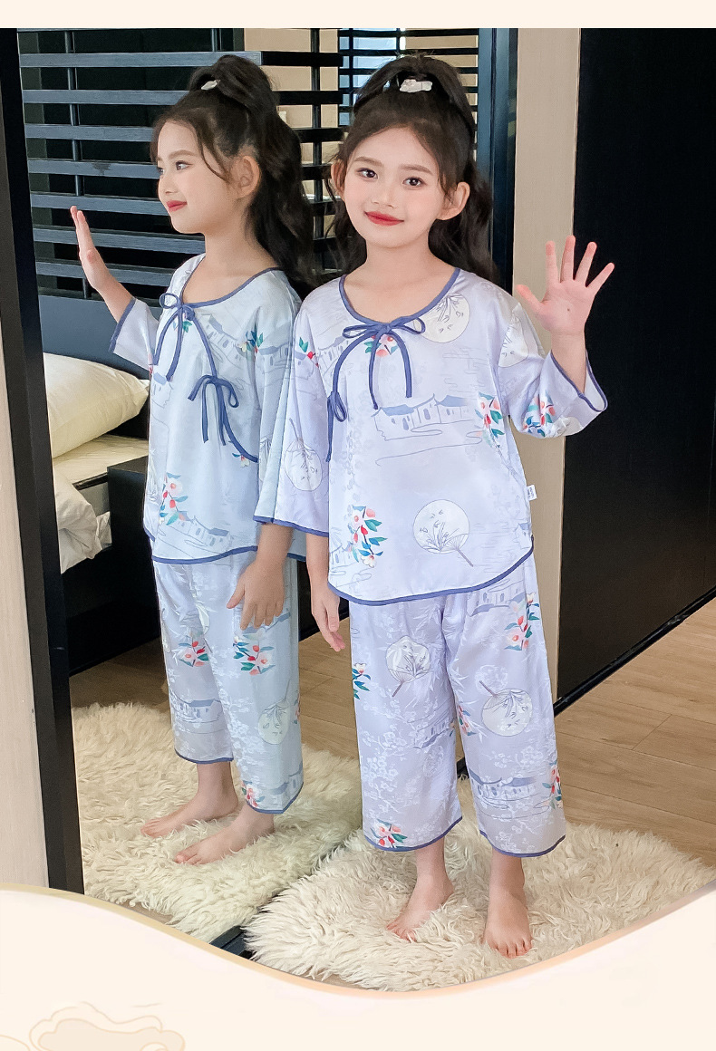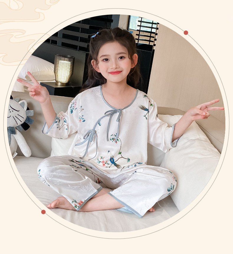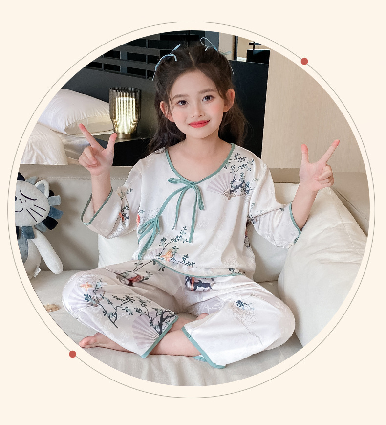 소녀의 여름 얇은 중국 스타일 잠옷 어린이 아이스 실크 반소매 홈 착용 세트 여름 에어컨 옷 투피스 세트